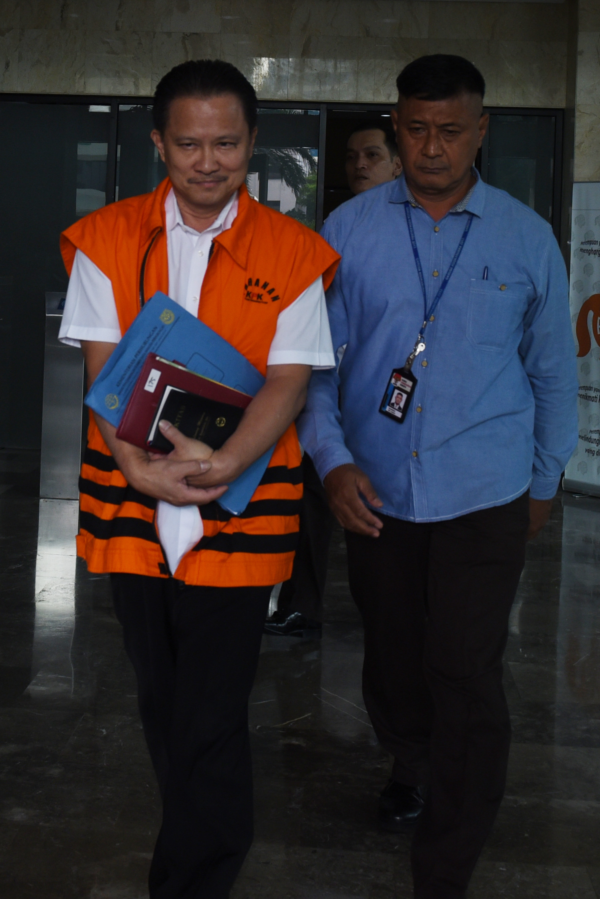 Direktur Jenderal Perhubungan Laut Kementerian Perhubungan Bobby Renold Mamahit (kiri) berjalan keluar seusai menjalani pemeriksaan di Gedung KPK, Jakarta, Selasa (23/2).Bobby diperiksa KPK sebagai tersangka kasus dugaan korupsi dalam proyek pembangunan Balai Pendidikan dan Pelatihan Ilmu Pelayaran Tahap III di Sorong tahun 2011. ANTARA FOTO/Hafidz Mubarak A./ama/16