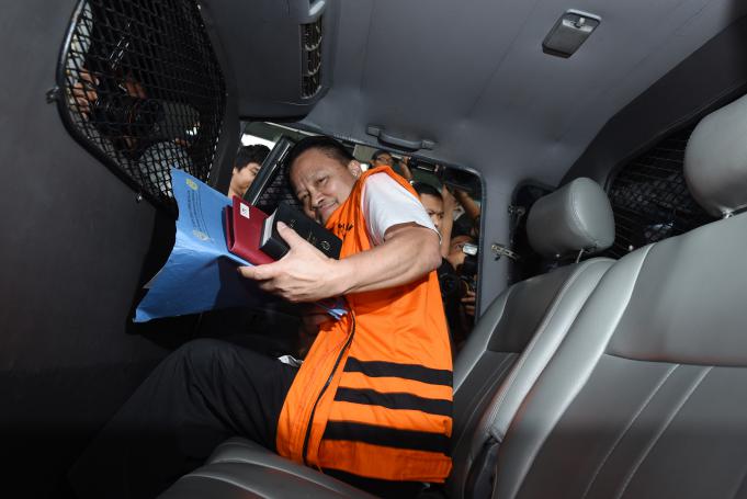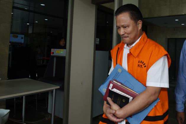 Direktur Jenderal Perhubungan Laut Kementerian Perhubungan Bobby Renold Mamahit memasuki mobil tahanan seusai menjalani pemeriksaan di Gedung KPK, Jakarta, Selasa (23/2). Bobby diperiksa KPK sebagai tersangka kasus dugaan korupsi dalam proyek pembangunan Balai Pendidikan dan Pelatihan Ilmu Pelayaran Tahap III di Sorong tahun 2011. ANTARA FOTO/Hafidz Mubarak A./ama/16