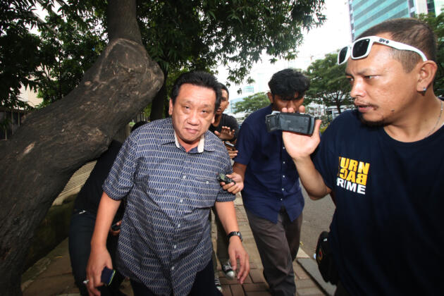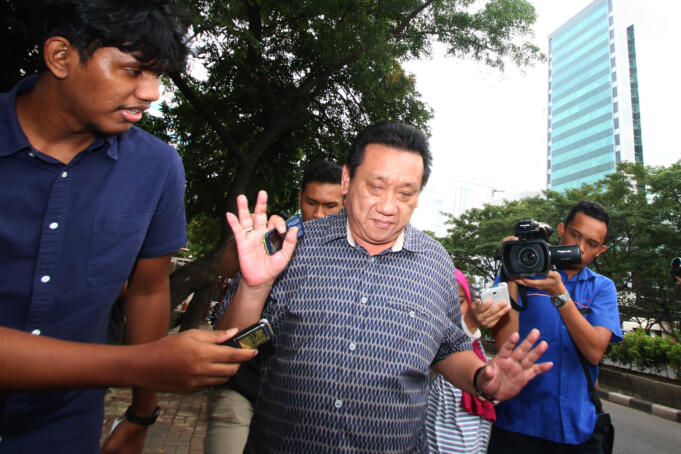 Komisaris PT Cahaya Mas Perkasa So Kok Seng atau Aseng (kiri) menghindari awak media usai menjalani pemeriksaan di Gedung KPK, Jakarta, Kamis (26/5). Aseng diperiksa sebagai saksi atas tersangka kasus dugaan suap ke sejumlah anggota Komisi V DPR Andi Taufan Tiro. ANTARA FOTO/Rivan Awal Lingga/ama/16