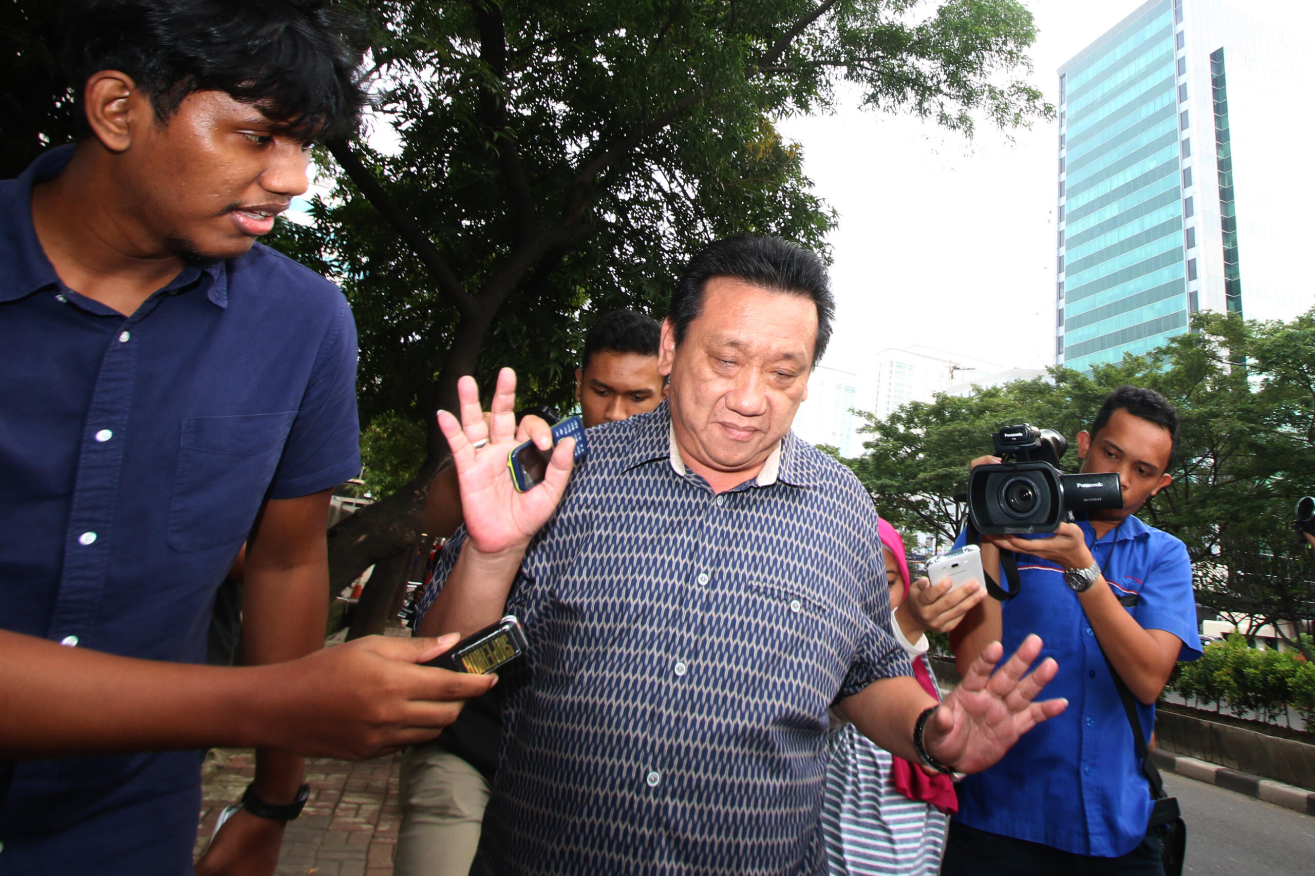 Komisaris PT Cahaya Mas Perkasa So Kok Seng atau Aseng (kedua kiri) menghindari awak media usai menjalani pemeriksaan di Gedung KPK, Jakarta, Kamis (26/5). Aseng diperiksa sebagai saksi atas tersangka kasus dugaan suap ke sejumlah anggota Komisi V DPR Andi Taufan Tiro. ANTARA FOTO/Rivan Awal Lingga/ama/16