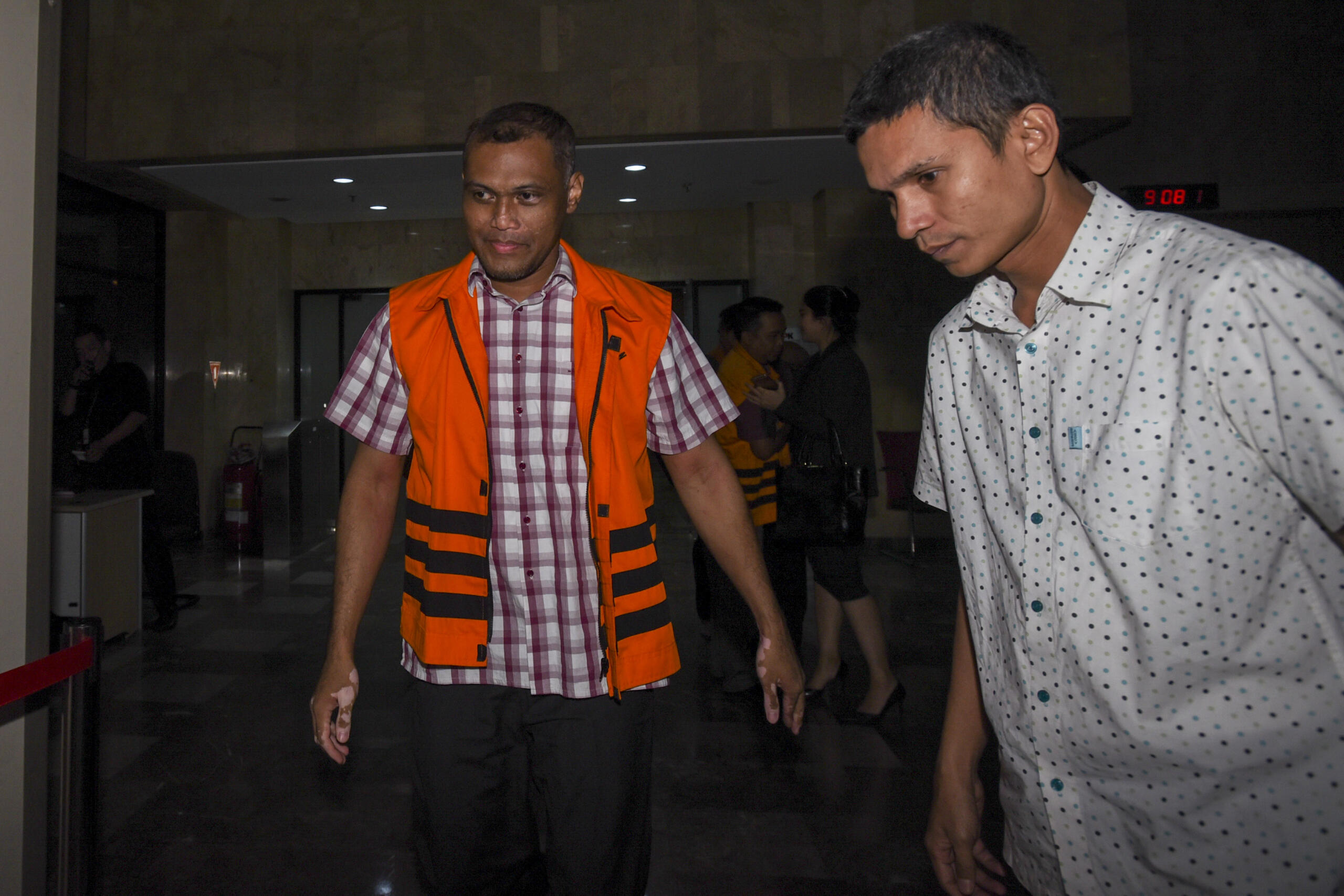 Mantan ketua tim pemeriksa pajak Kantor Pajak Kebayoran Baru III Indarto Catur Nugroho (kiri) berjalan seusai menjalani pemeriksaan di Gedung KPK, Jakarta, Kamis (9/6). Indarto bersama Herry Setiadji dan Slamet Riyana diperiksa KPK sebagai tersangka kasus dugaan pemerasan pajak kepada perusahaan wajib pajak yakni PT EDMI Indonesia. ANTARA FOTO/Hafidz Mubarak A/foc/16.