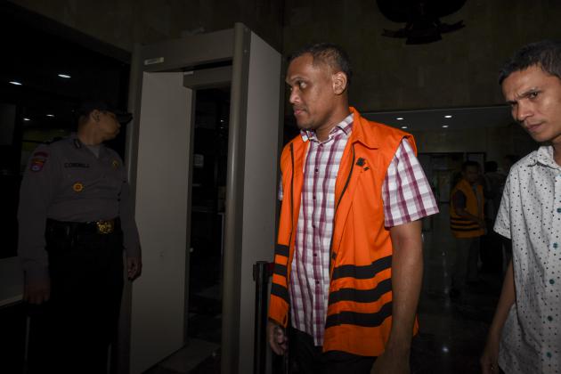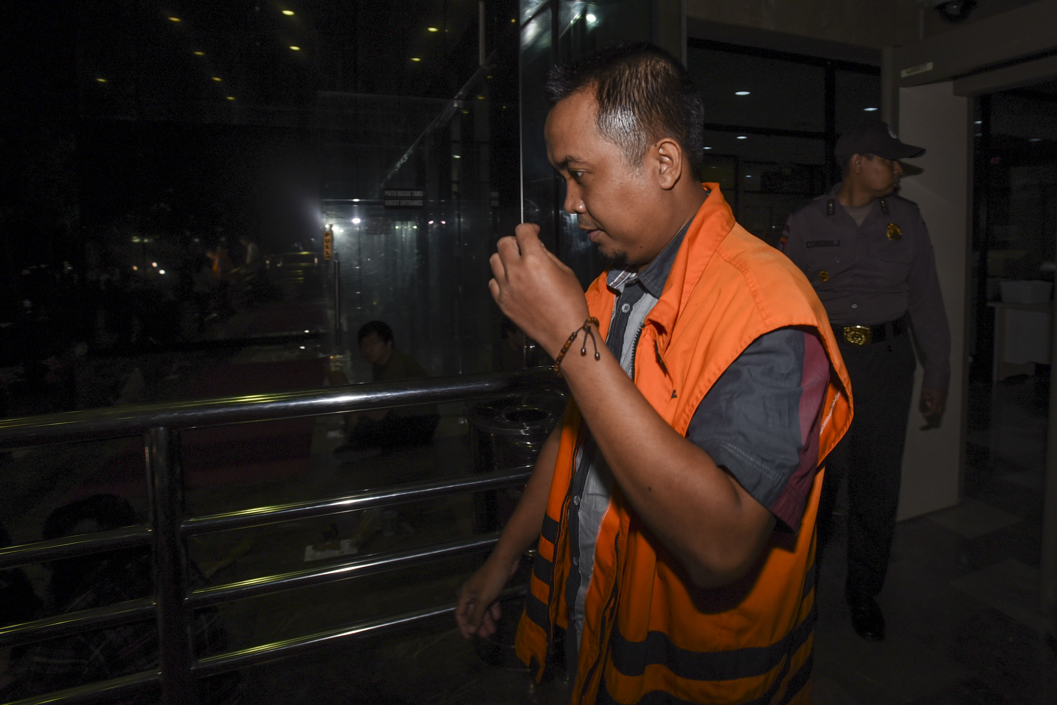 Mantan ketua tim pemeriksa pajak Kantor Pajak Kebayoran Baru III Indarto Catur Nugroho berjalan seusai menjalani pemeriksaan di Gedung KPK, Jakarta, Kamis (9/6). Indarto bersama Herry Setiadji dan Slamet Riyana diperiksa KPK sebagai tersangka kasus dugaan pemerasan pajak kepada perusahaan wajib pajak yakni PT EDMI Indonesia. ANTARA FOTO/Hafidz Mubarak A/foc/16.