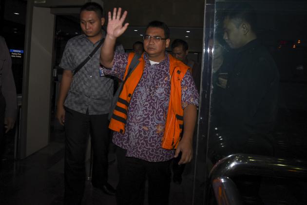 Mantan supervisor tim pemeriksa pajak Kantor Pajak Kebayoran Baru III Herry Setiadji melambaikan tangannya seusai menjalani pemeriksaan di Gedung KPK, Jakarta, Kamis (9/6). Herry bersama Catur Nugroho dan Slamet Riyana diperiksa KPK sebagai tersangka kasus dugaan pemerasan pajak kepada perusahaan wajib pajak yakni PT EDMI Indonesia. ANTARA FOTO/Hafidz Mubarak A/foc/16.