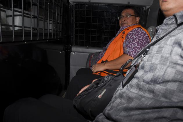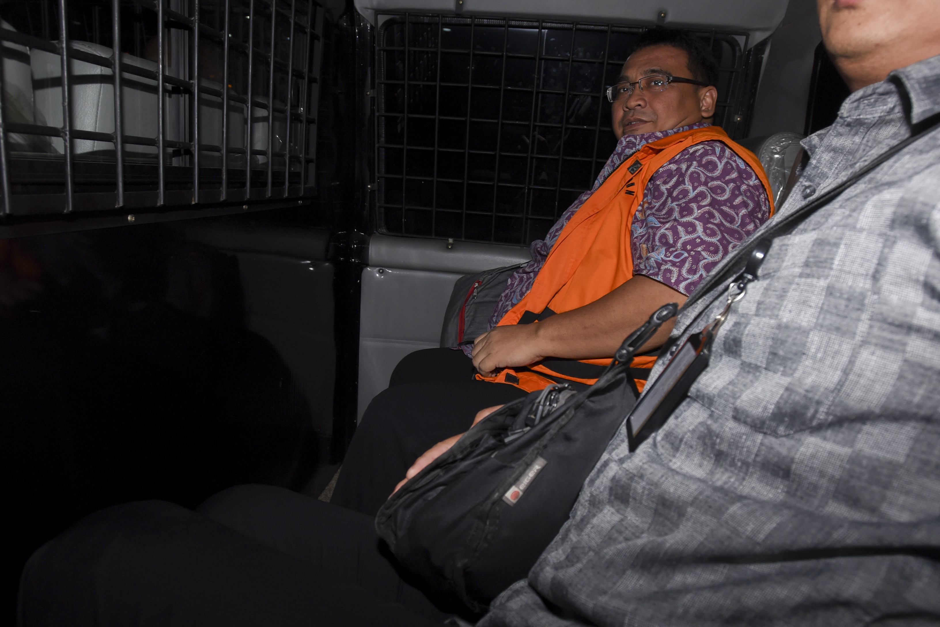 Mantan supervisor tim pemeriksa pajak Kantor Pajak Kebayoran Baru III Herry Setiadji memasuki mobil tahanan seusai menjalani pemeriksaan di Gedung KPK, Jakarta, Kamis (9/6). Herry bersama Catur Nugroho dan Slamet Riyana diperiksa KPK sebagai tersangka kasus dugaan pemerasan pajak kepada perusahaan wajib pajak yakni PT EDMI Indonesia. ANTARA FOTO/Hafidz Mubarak A/foc/16.