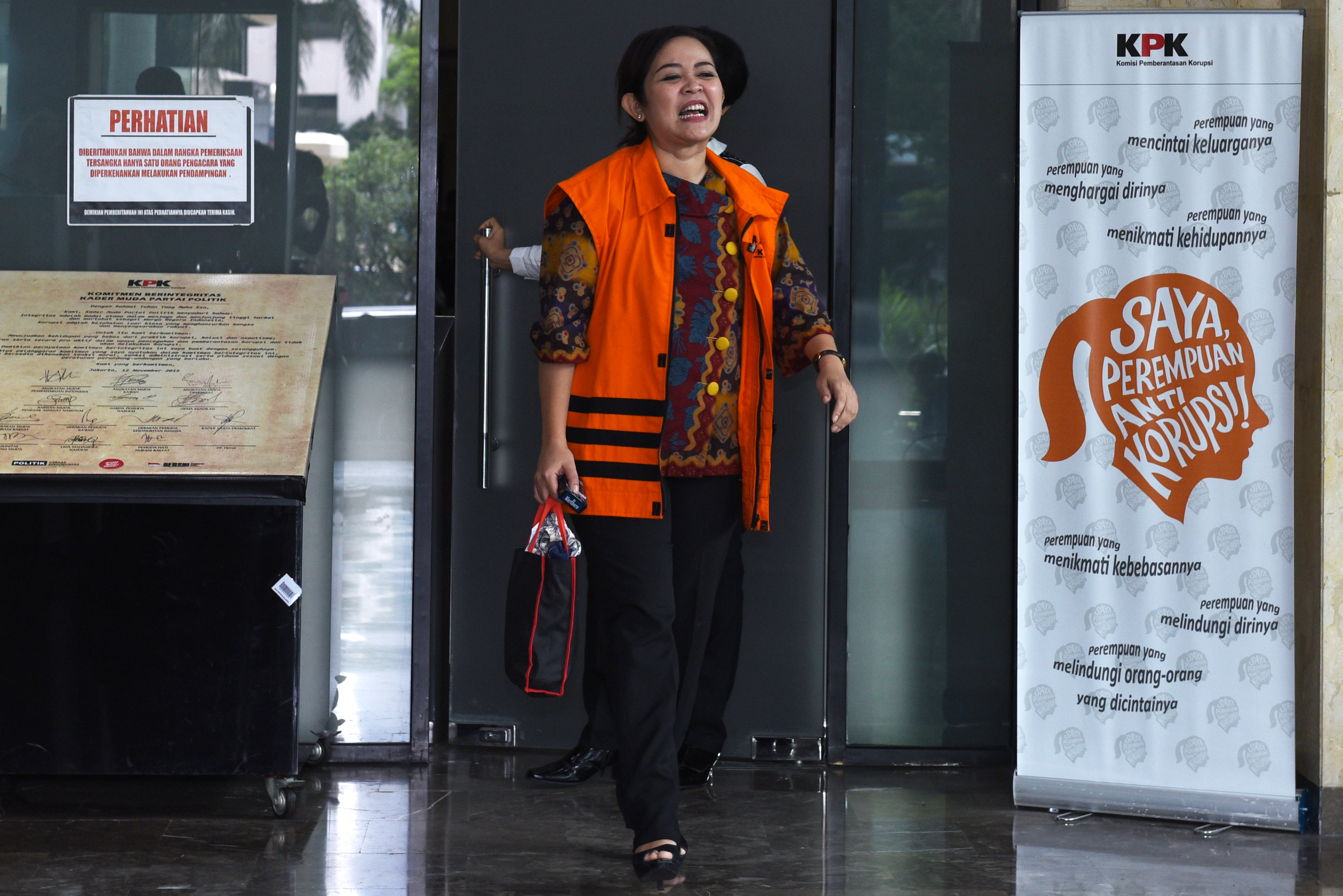Staf anggota DPR Damayanti Wisnu Putranti, Dessy A Edwin berjalan keluar seusai menjalani pemeriksaan di Gedung KPK, Jakarta, Jumat (4/3). KPK memeriksa tiga tersangka yang ditangkap saat operasi tangkap tangan yakni anggota Komisi V DPR Damayanti Wisnu Putranti, dua Staf Damayanti, Dessy A Edwin dan Julia Prasetyarini terkait kasus dugaan suap pada proyek Kementerian Pekerjaan Umum dan Perumahan Rakyat (PUPR) tahun anggaran 2016. ANTARA FOTO/Hafidz Mubarak A./ama/16