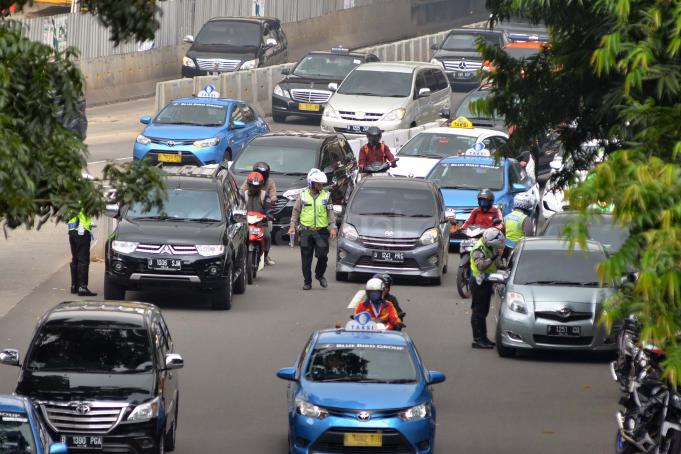 Puluhan petugas Polantas melakukan razia kendaraan bermotor khusus mobil pribadi yang bernumpang satu orang di Jalan. Jenderal Sudirman, Jakarta, Kamis (31/3/2016). Pemprov DKI Jakarta berencana menghapus program jalur 'Three in One.' Kebijakan tersebut tengah dikaji seiring dengan banyaknya jasa sebagai joki dengan membawa anak dan terungkapnya kasus eksploitasi anak.