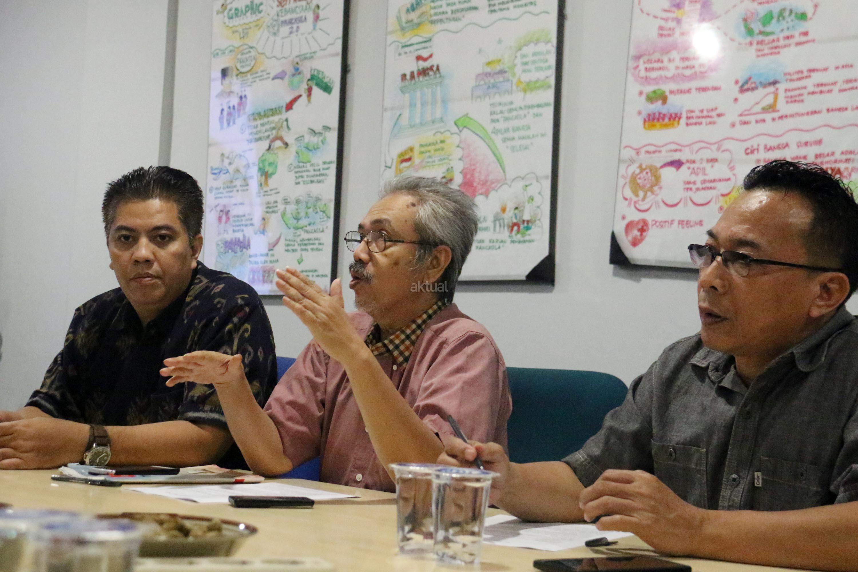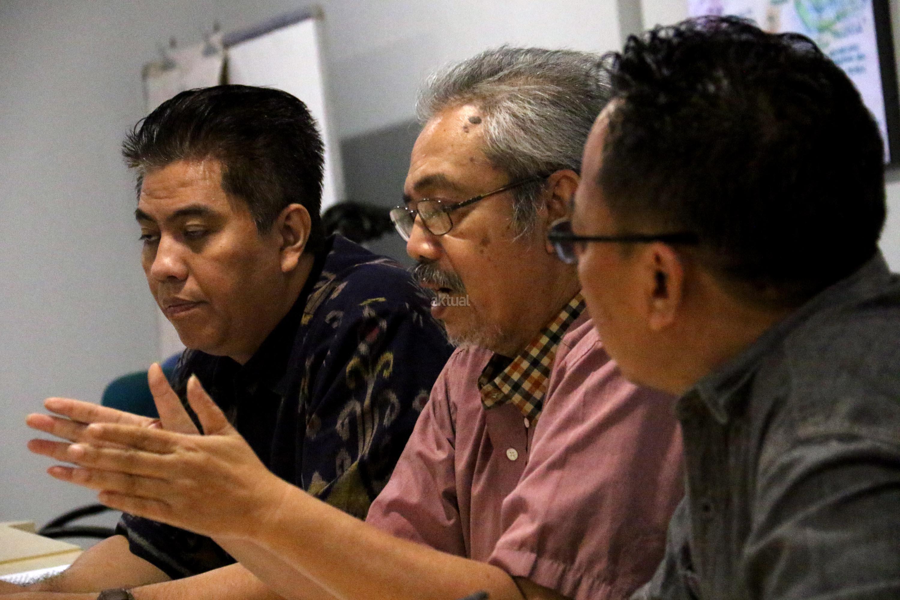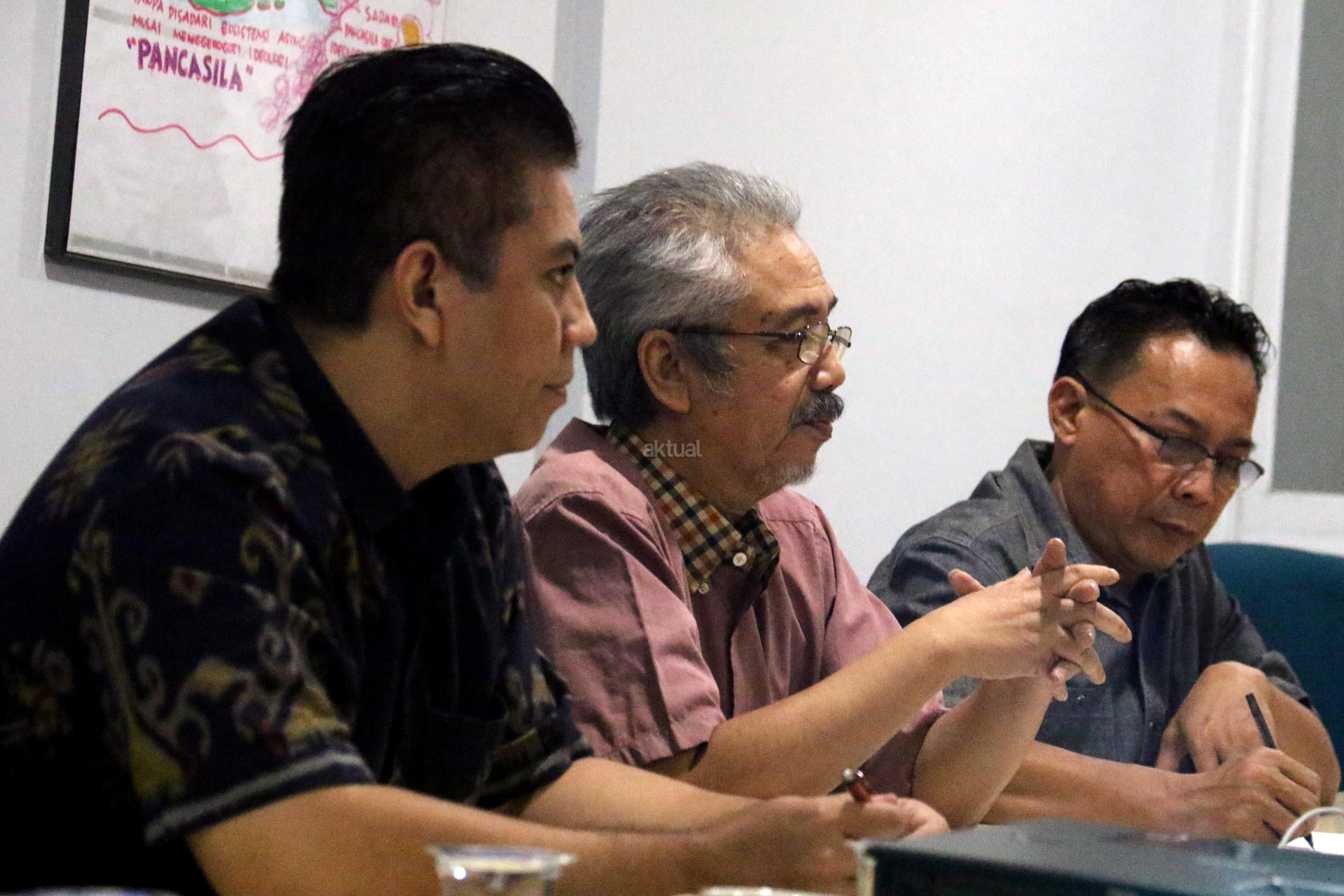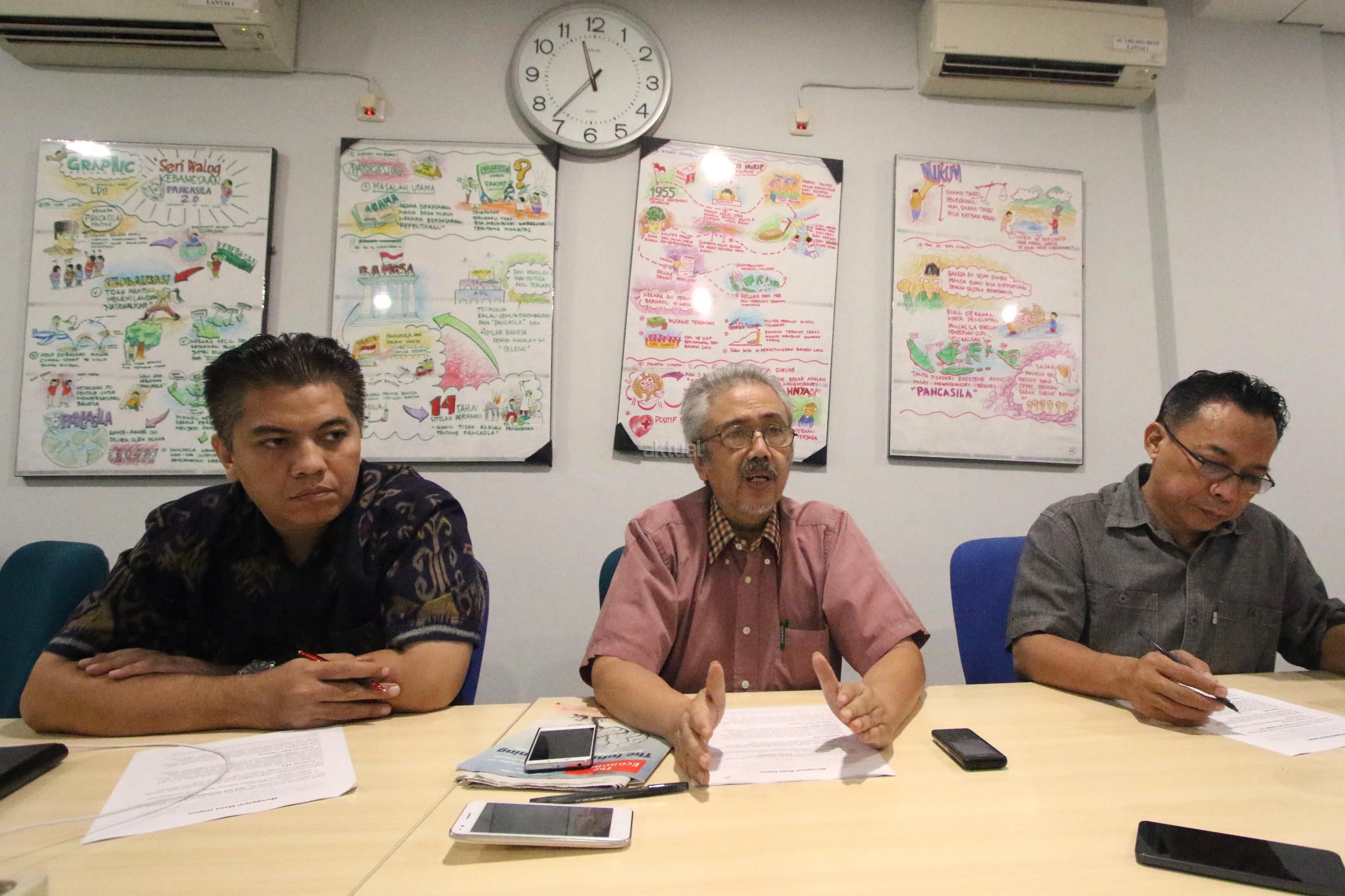 Peneliti Paradigma Riset Institute, HR Prasetyo Sunaryo (tengah), didampingi Hasim Nasution (kiri) dan Rio Sidauruk (kanan), saat konferensi pers di Jakarta, Selasa (1/8/2017). Kepada wartawan Paradigma Riset Institute, meminta pemerintah menaikan angka partisipasi kasar (APK) masyarakat masuk ke Perguruan Tinggi Negeri dan Swasta. Sebab APK PTN dan PTS di Indonesia sekarang ini di posisi 31%. Mereka beranggapan tingginya APK, akan berimbas pada lebih baiknya masa depan suatu bangsa dalam waktu 10- 30 tahun mendatang. AKTUAL/Munzir