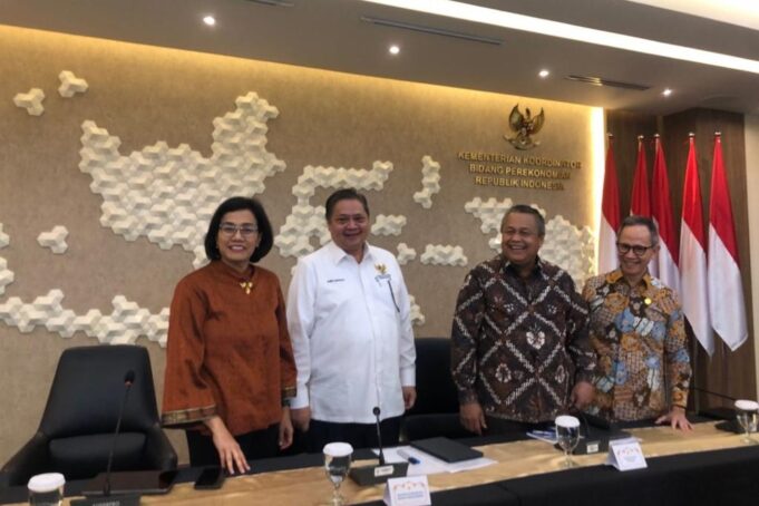 Menteri Keuangan Sri Mulyani, Menteri Koordinator Bidang Perekonomian Airlangga Hartarto, Gubernur Bank Indonesia (BI) Perry Warjiyo, dan Ketua Dewan Komisioner Otoritas Jasa Keuangan (OJK) Mahendra Siregar dalam konferensi pers di Jakarta, Jumat (28/7/2023).