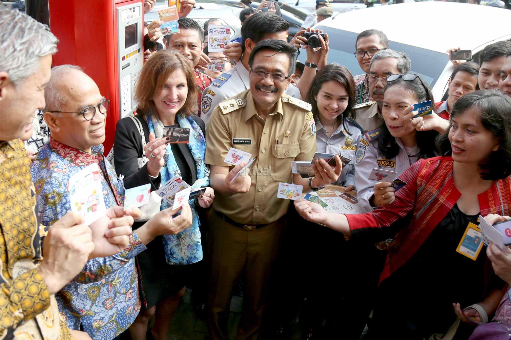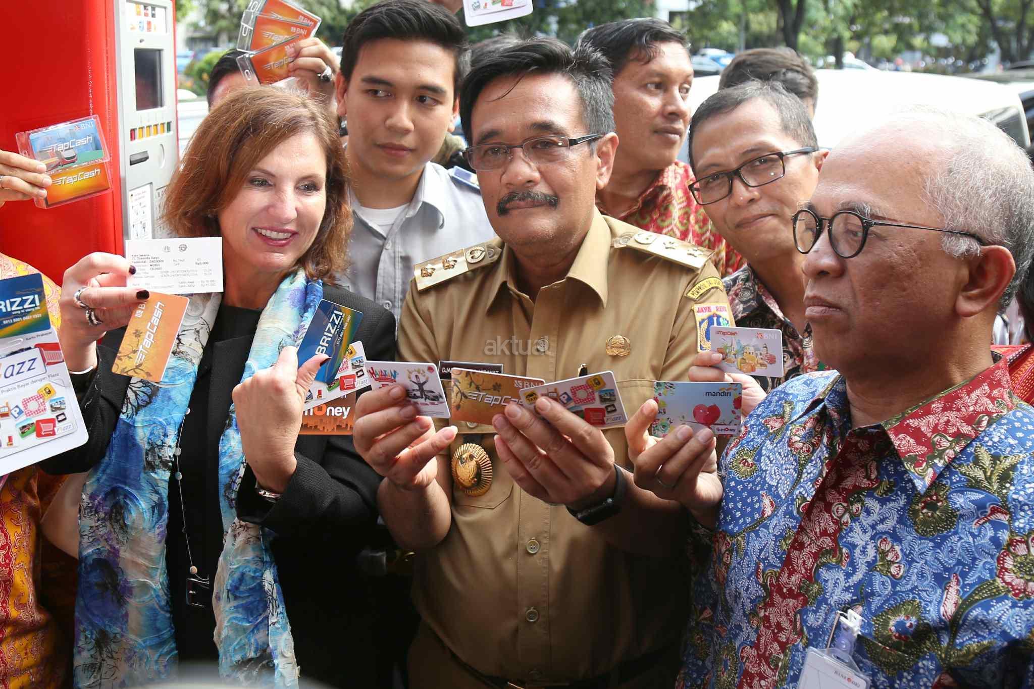 Wagub DKI Jakarta Djarot Saiful Hidayat didampingi Dirut Bank DKI Kresno Sediarsi (kedua kiri) memperlihatkan kartu akses akses mesin terminal parkir elektronik (TPE) di Jalan Juanda, Jakarta Pusat, Senin (24/10). Sistem pembayaran parkir dengan mesin TPE, pembayaran dilakukan secara non tunai dengan kartu elektronik dari tujuh merek, masing-masing Tap Cash dari BNI; e-Money dari Bank Mandiri; Brizzi dari Bank BRI; Mega Cash dari Bank Mega; Flazz dari BCA; Jakcard dari Bank DKI; dan Dompetku Tap dari Indosat Ooredoo. AKTUAL/Tino Oktaviano