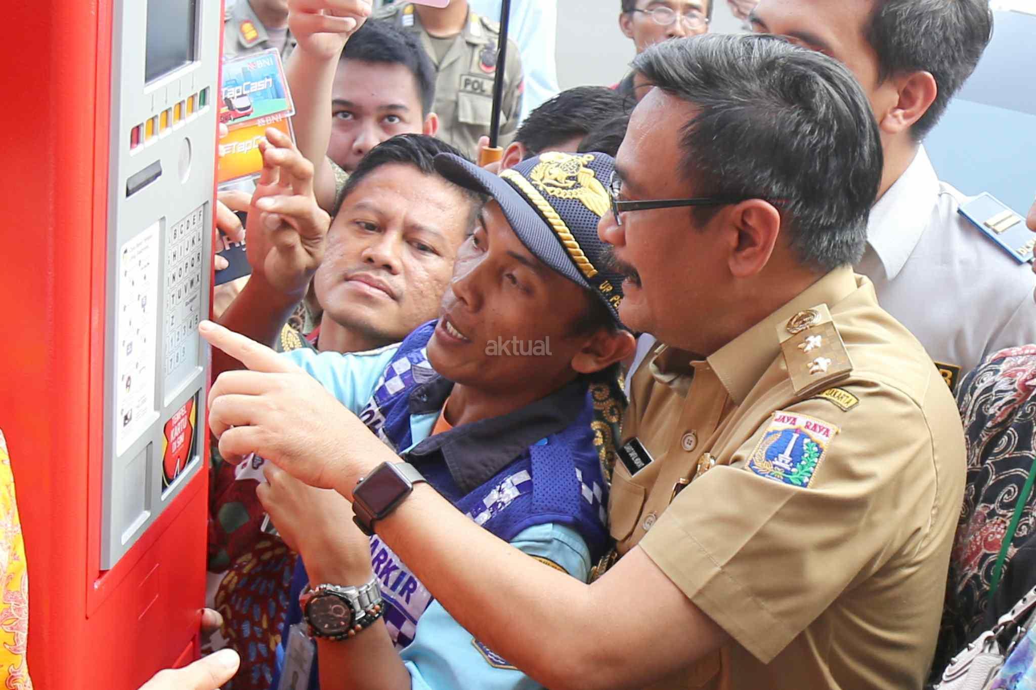 Wagub DKI Jakarta Djarot Saiful Hidayat mencoba akses mesin terminal parkir elektronik (TPE) di Jalan Juanda, Jakarta Pusat, Senin (24/10). Pemerintah Provinsi DKI Jakarta resmi menerapkan sistem pembayaran parkir pinggir jalan (on street) dengan mesin terminal parkir elektronik (TPE) di sejumlah lokasi, masing-masing Jalan Juanda Raya dan Jalan Pecenongan 10, Jakarta Pusat serta Jalan Pinangsia Raya, Pinangsia I, II, dan III, Jakarta Barat. AKTUAL/Tino Oktaviano