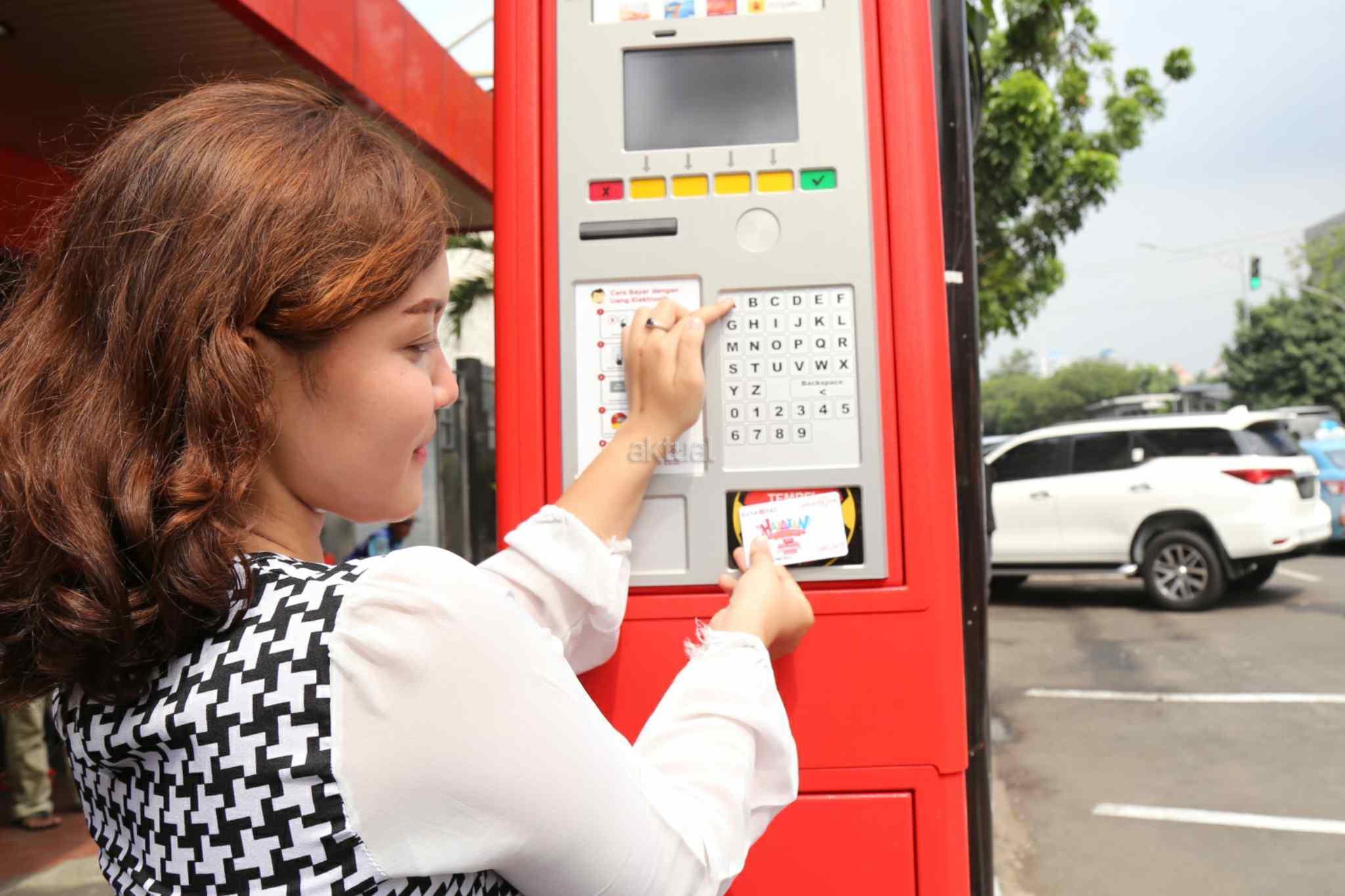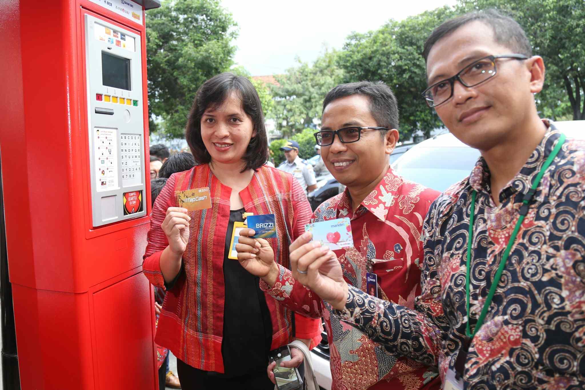 VP Digital Banking Mandiri, Nandan Sandaya (kiri), EVP Transaction Banking BRI, Ahmad Solichin (tengah) dan GM Electronic Banking BNI, Diah Permata Widiastuti mencoba akses mesin terminal parkir elektronik (TPE) di Jalan Juanda, Jakarta Pusat, Senin (24/10). Sistem pembayaran parkir dengan mesin TPE, pembayaran dilakukan secara non tunai dengan kartu elektronik dari tujuh merek, masing-masing Tap Cash dari BNI; e-Money dari Bank Mandiri; Brizzi dari Bank BRI; Mega Cash dari Bank Mega; Flazz dari BCA; Jakcard dari Bank DKI; dan Dompetku Tap dari Indosat Ooredoo. AKTUAL/Tino Oktaviano