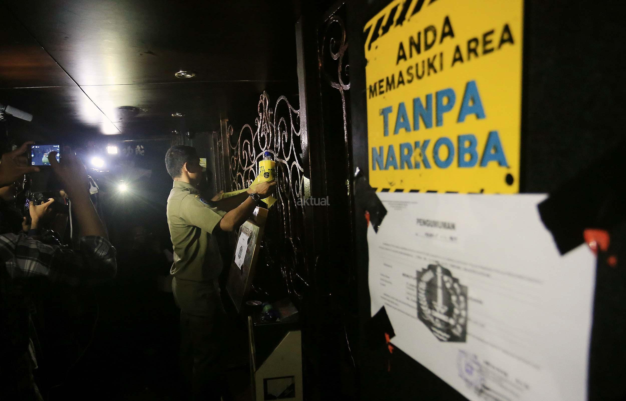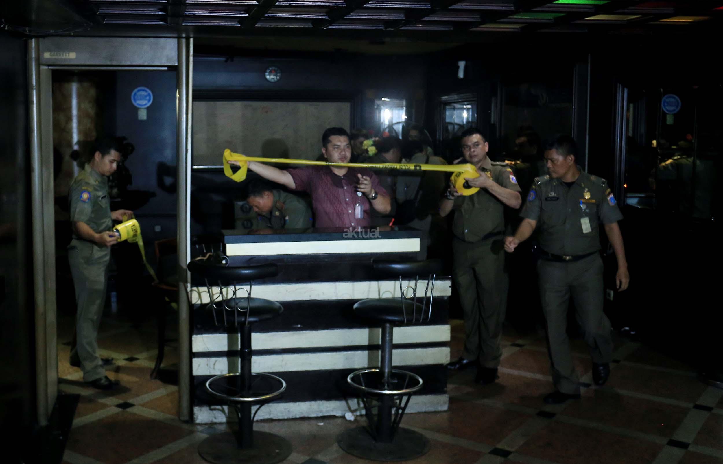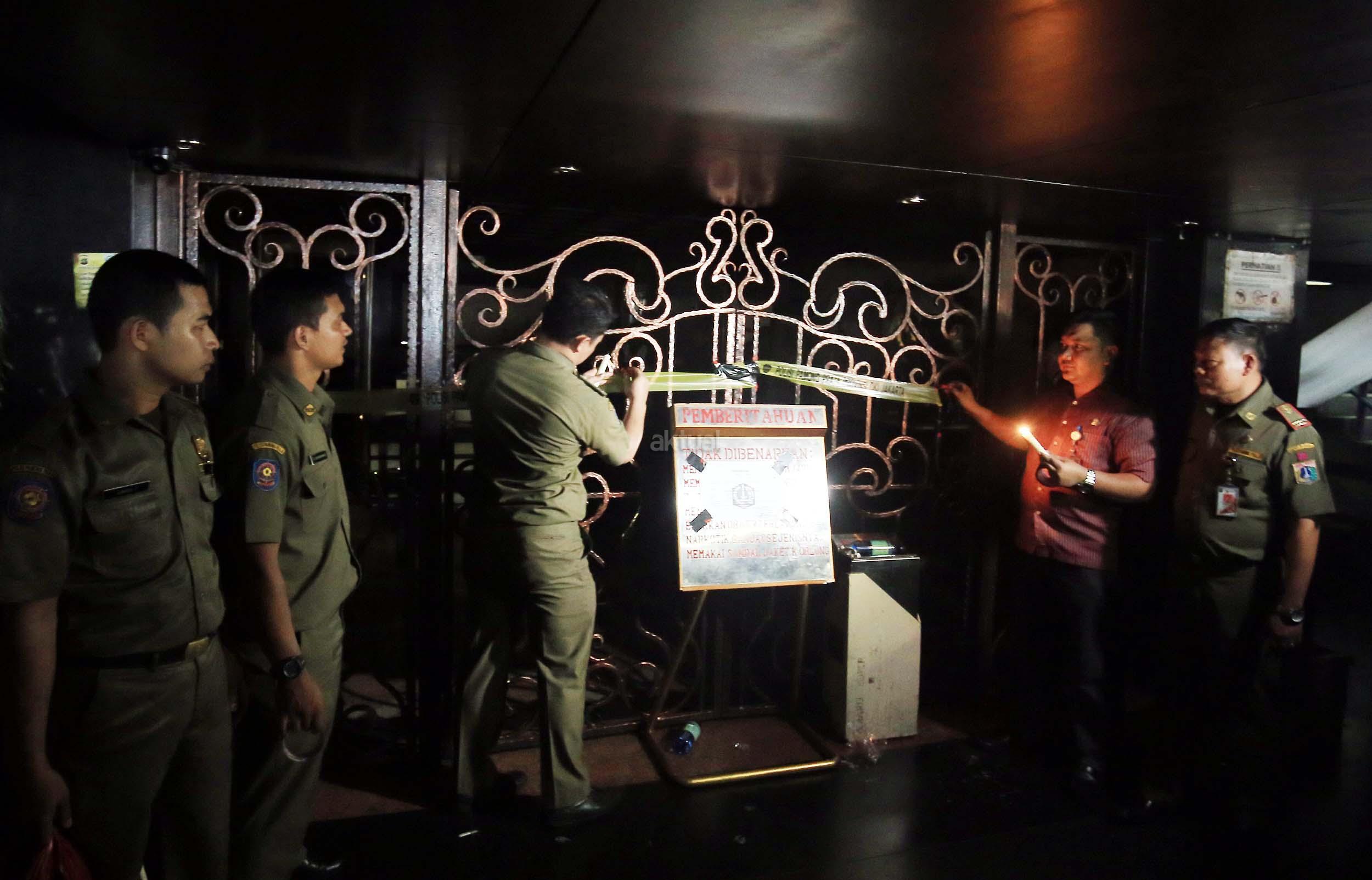 Anggota Satpol PP menyegel tempat hiburan malam Mille”s di kawasan Mangga Besar, Jakarta, Kamis (13/10/2016). Pemprov DKI menutup tempat hiburan malam tersebut karena diduga menjadi tempat peredaran narkoba. AKTUAL/Munzir