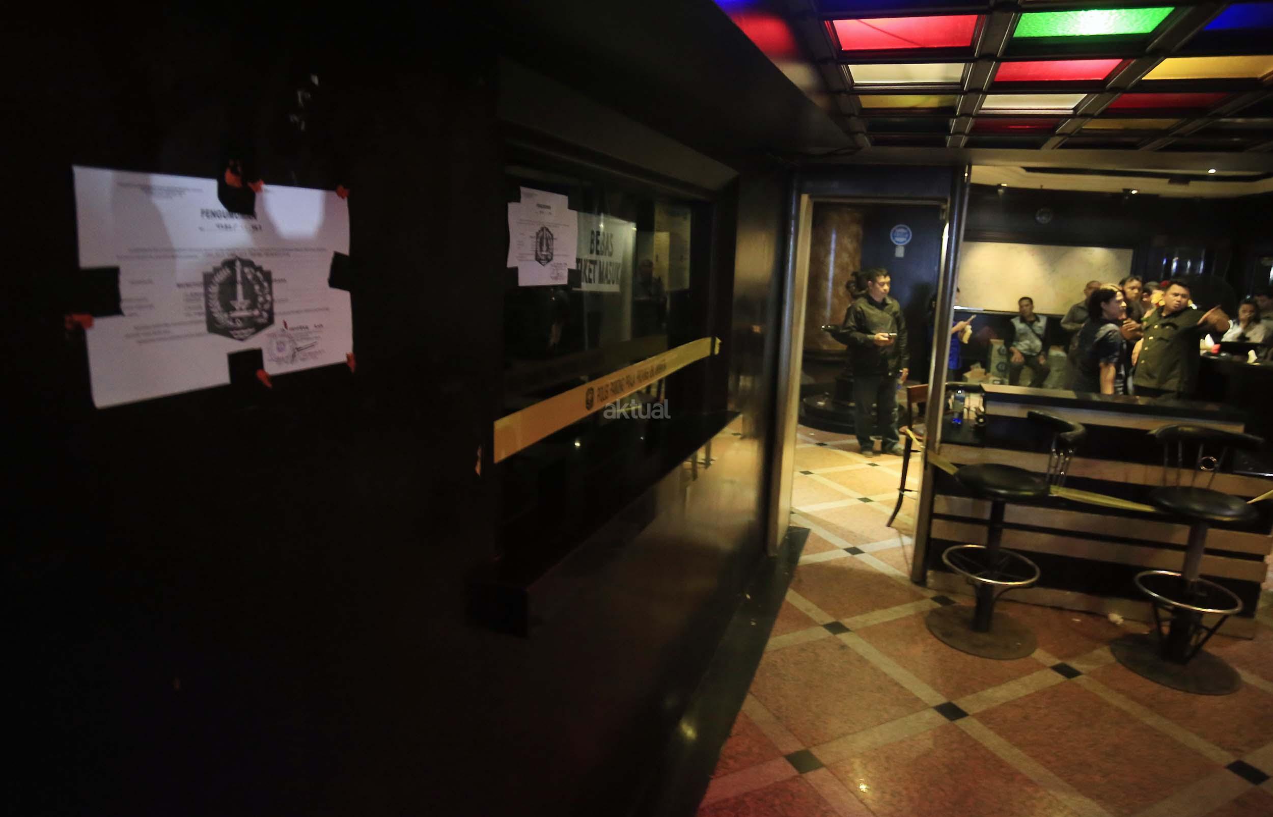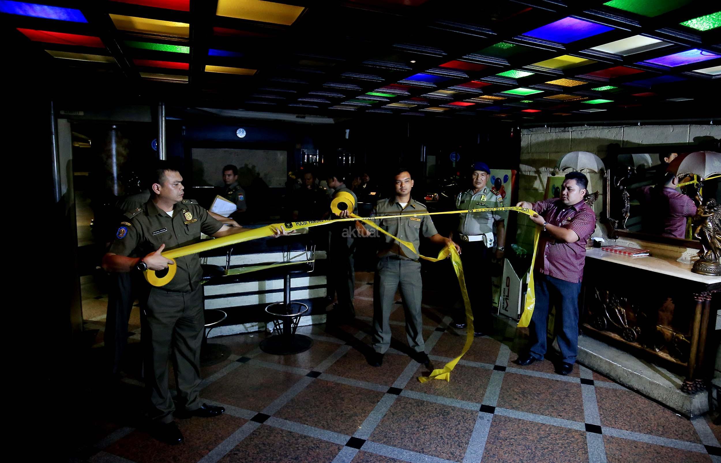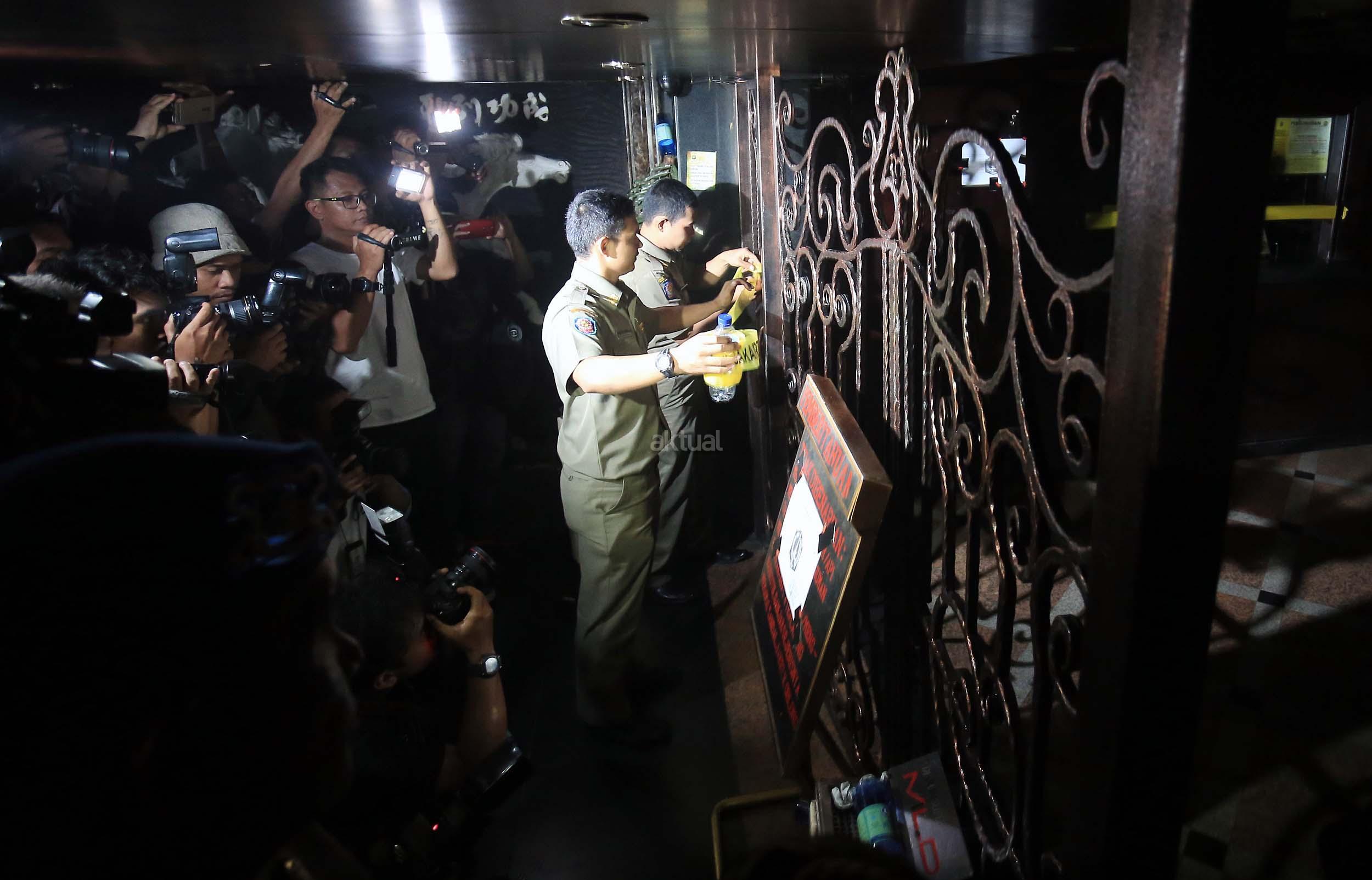 Anggota Satpol PP menyegel tempat hiburan malam Mille”s di kawasan Mangga Besar, Jakarta, Kamis (13/10/2016). Pemprov DKI menutup tempat hiburan malam tersebut karena diduga menjadi tempat peredaran narkoba. AKTUAL/Munzir