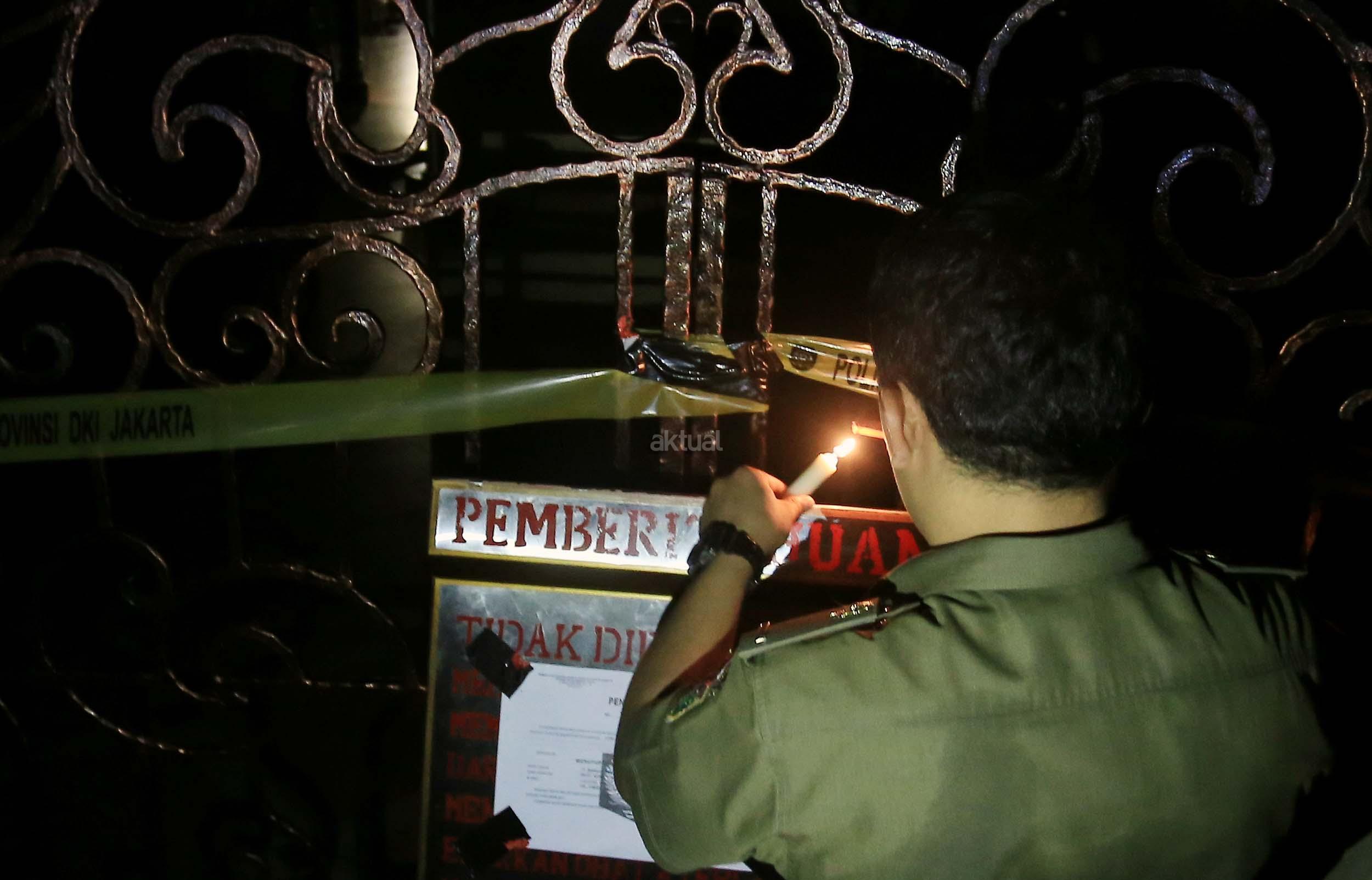 Anggota Satpol PP menyegel tempat hiburan malam Mille”s di kawasan Mangga Besar, Jakarta, Kamis (13/10/2016). Pemprov DKI menutup tempat hiburan malam tersebut karena diduga menjadi tempat peredaran narkoba.