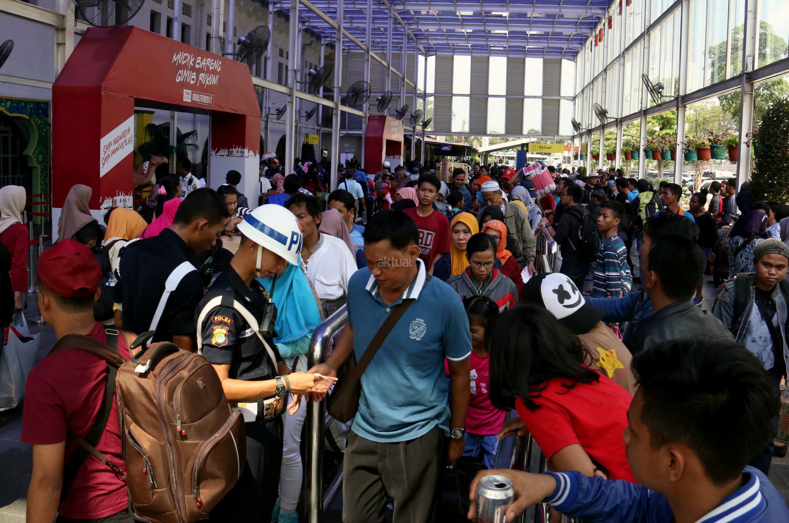 Para pemudik mengantri saat mau masuk ke dalam Stasiun Pasar Senen, Jakarta, Minggu (2/7/2017). Meski libur lebaran sudah selesai para pemudik masih memadati Stasiun Pasar Senen dan faktor lainnya juga dikarenakan libur sekolah yang panjang hingga 17 Juli 2017 mendatang sehingga memberikan pilihan bagi orang tua untuk melakukan mudik pasca Lebaran. AKTUAL/Munzir