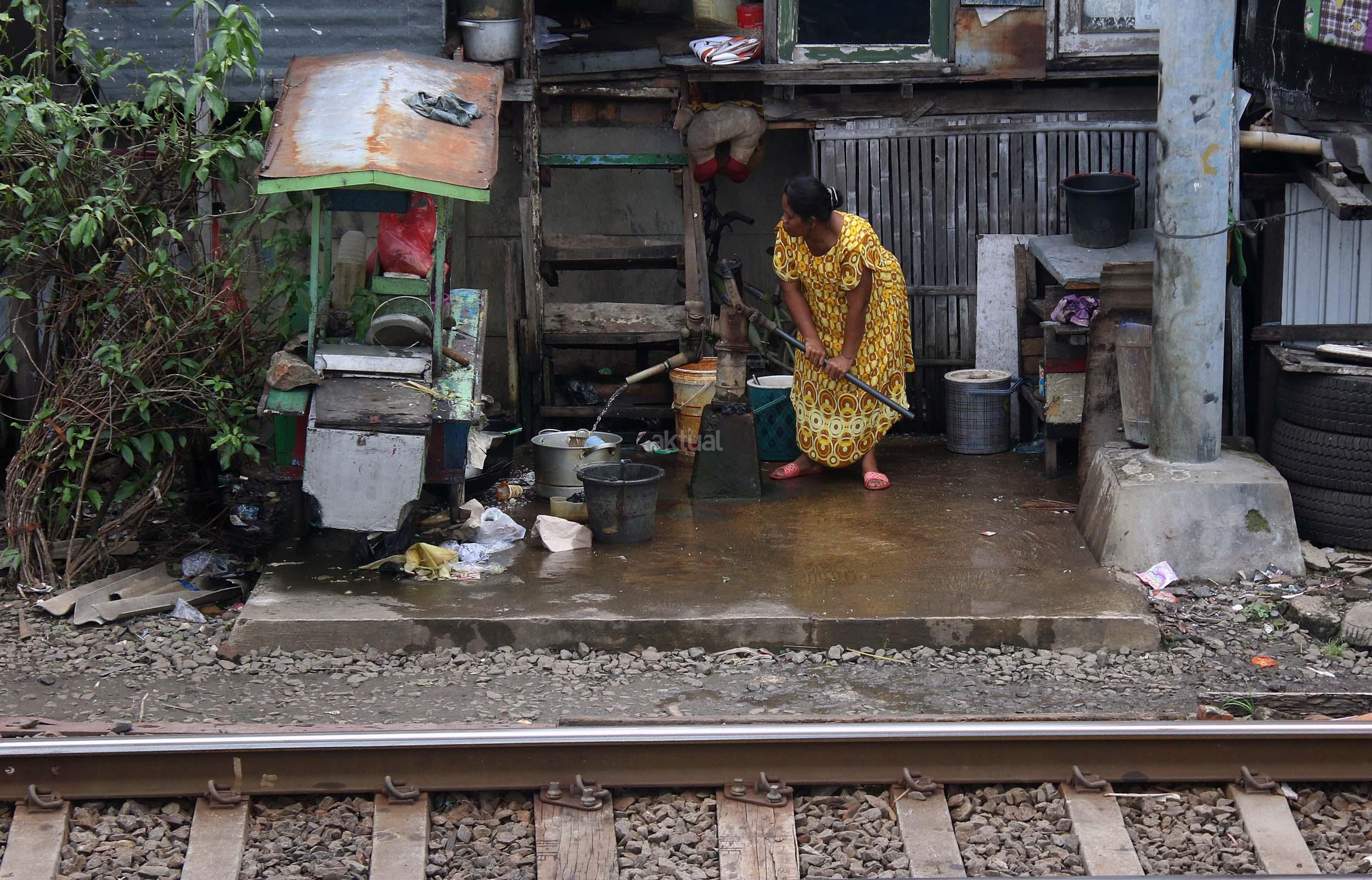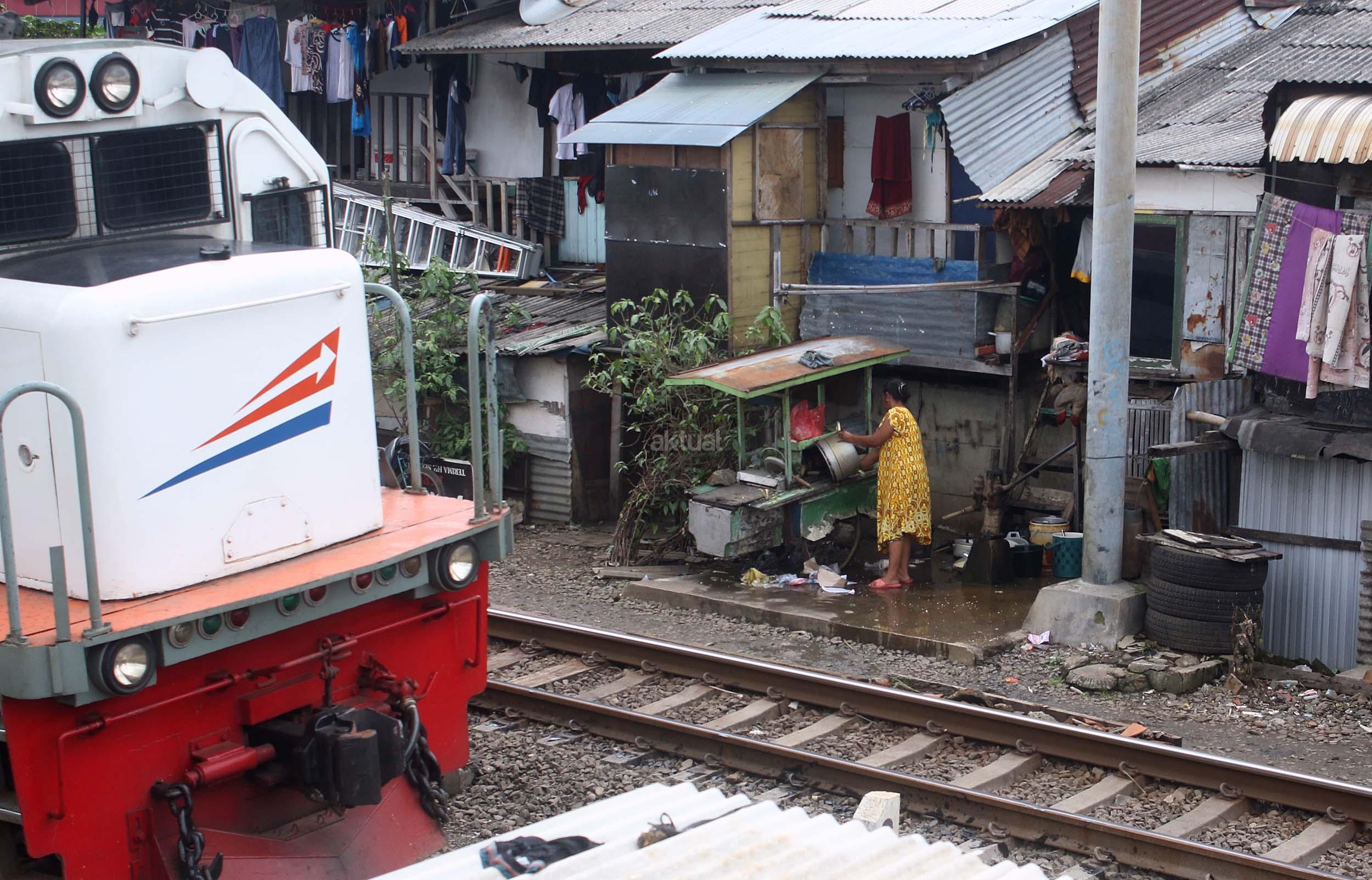 Suasana di sekitar pemukiman kumuh tepi rel kawasan Tanah Abang, Jakarta, Senin (17/10/2016) Selain mengganggu lalu lintas kereta, bangunan kumuh di bantaran rel kereta api ini pun membahayakan penghuni jika kereta melintasi kawasan tersebut.