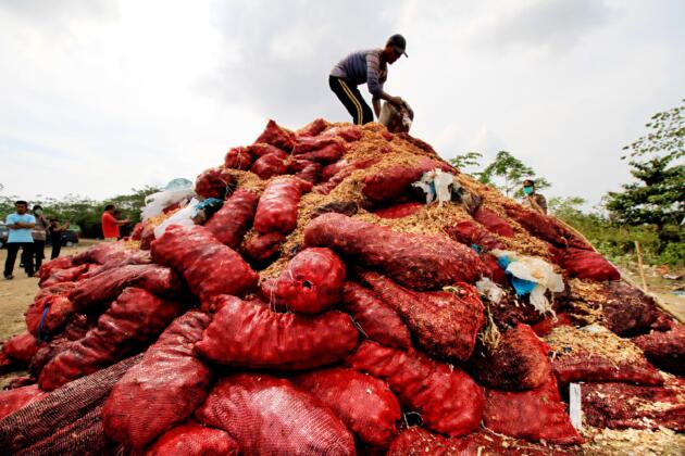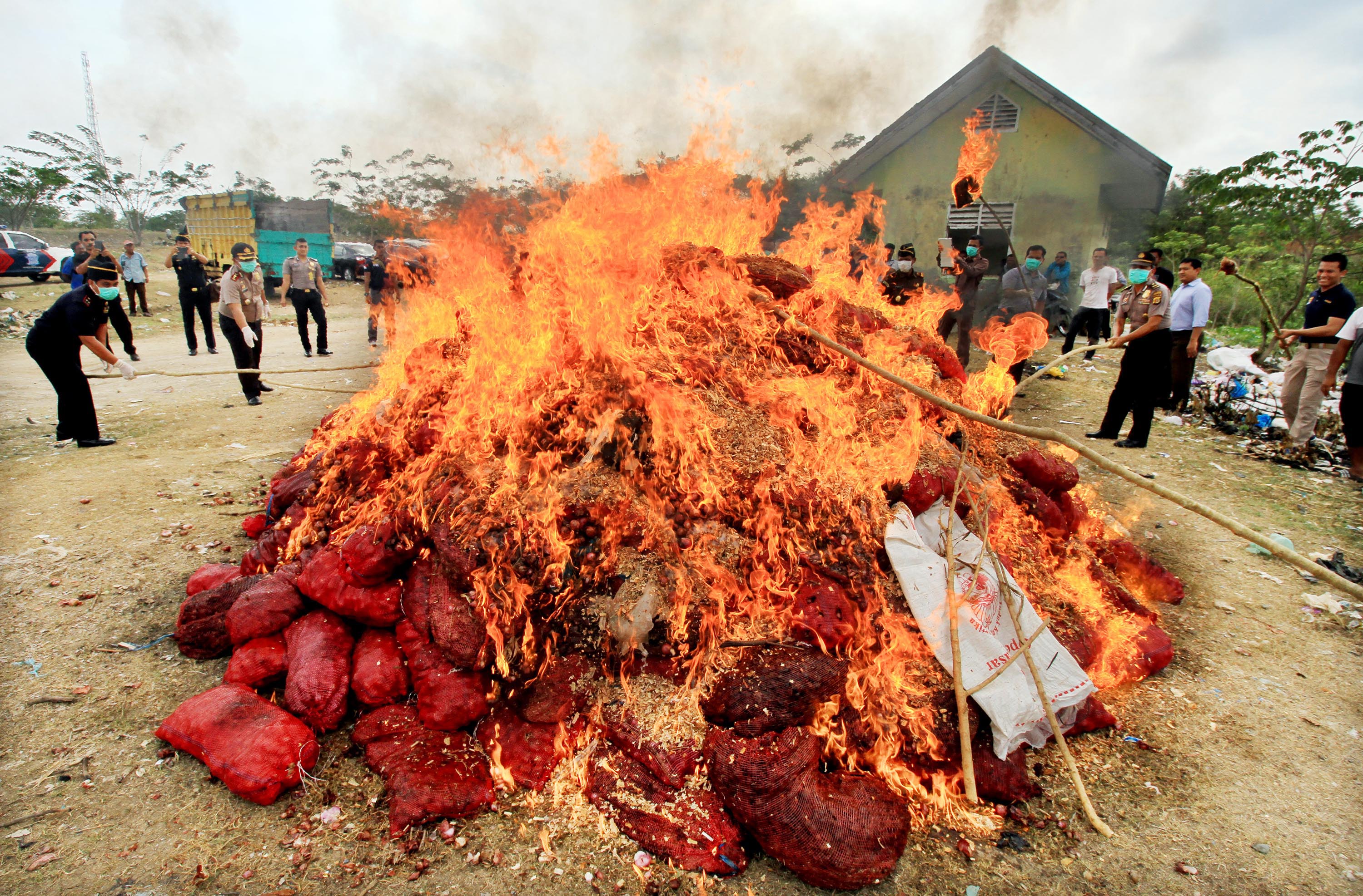 Petugas memusnahkan barang bukti bawang merah ilegal dengan cara dibakar di areal TPA Alue Lim, Muara Dua, Lhokseumawe, Provinsi Aceh, Selasa (26/4). Sebanyak enam ton atau 156 bal bawang merah seludupan asal Malaysia merupakan hasil tangkapan Polres Lhokseumawe sejak Maret hingga April 2016 yang diseludupkan melalui bus angkutan umum, truk dan kapal laut di perairan laut Aceh. ANTARA FOTO/Rahmad/aww/16.