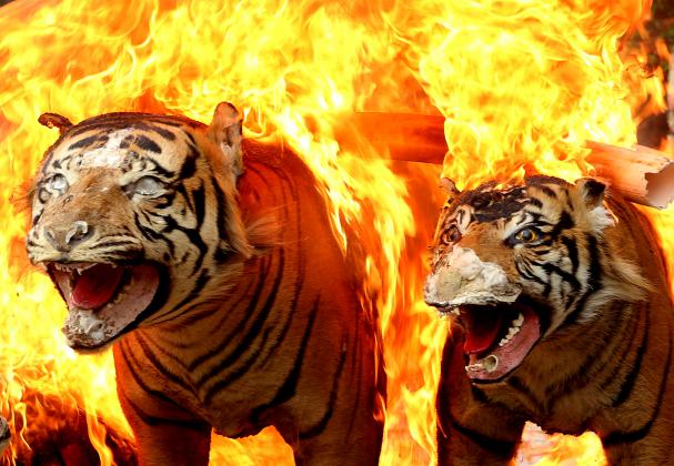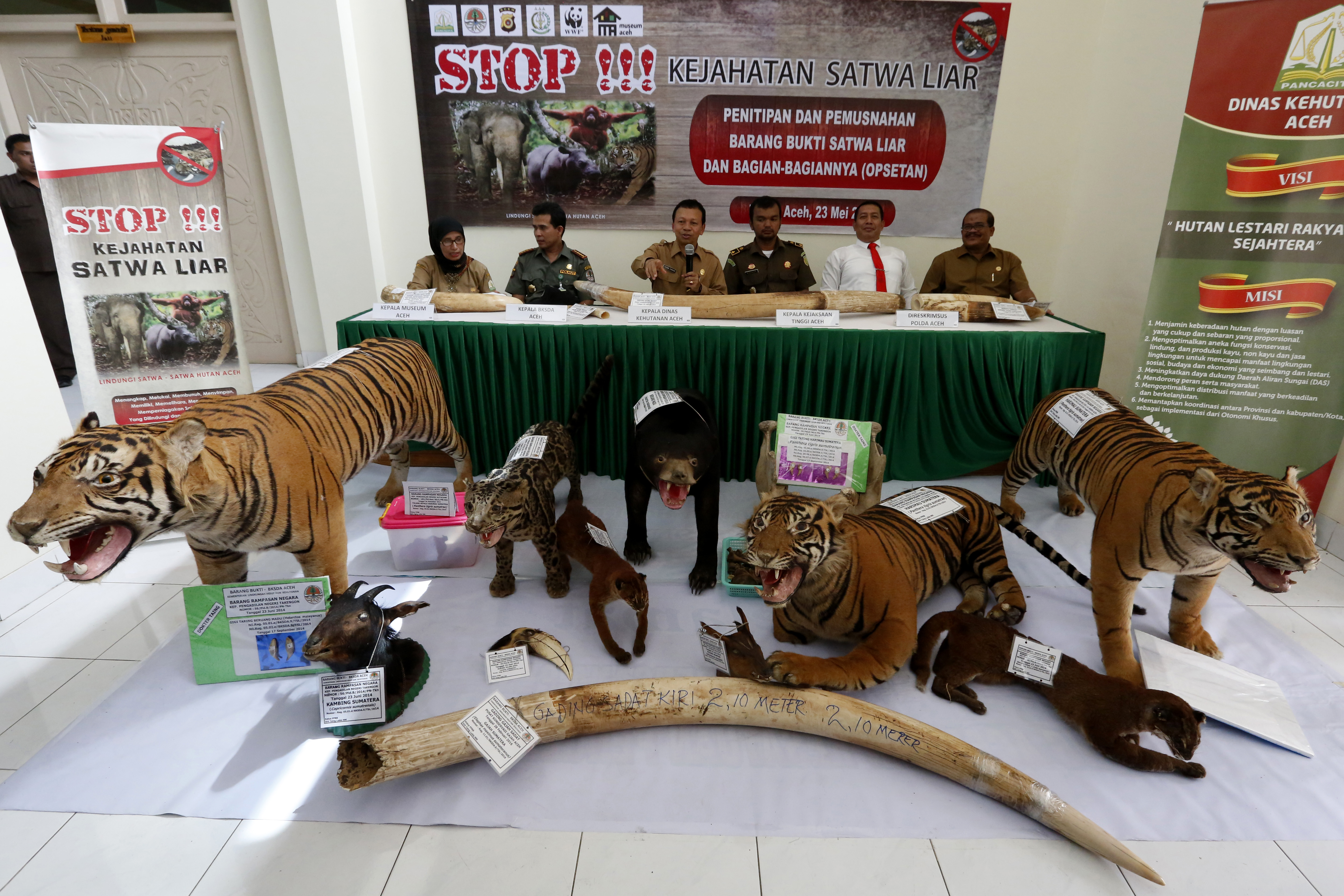 Barang bukti berupa koleksi jenis awetan (offset) satwa terancam punah dan dilindungi termasuk Harimau sumatera (Panthera tigris sumatrae) hasil sitaan dimusnahkan dengan cara dibakar di halaman Kantor Dinas Kehutanan Provinsi Aceh, Banda Aceh, Senin (23/5). Sebanyak 31 jenis offset satwa langka hasil operasi tahun 2012-2015 yang telah mendapat putusan dari pengadilan dimusnahkan serta dimuseumkan untuk bahan penelitian dan edukasi lingkungan. ANTARA FOTO/Irwansyah Putra/aww/16.