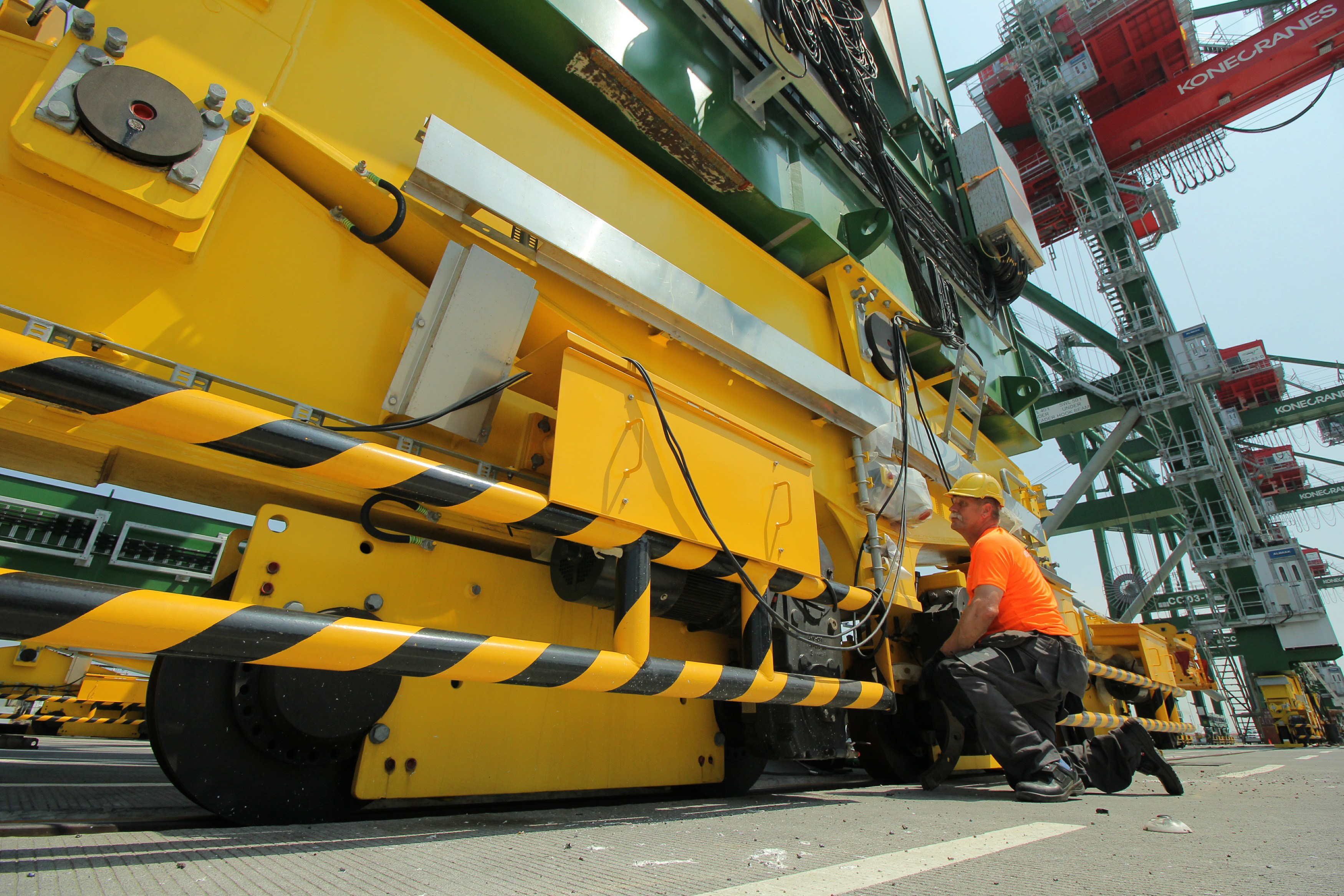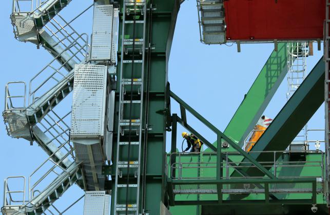 Tenaga ahli memeriksa kesiapan operasional Ship to Shore (STS) crane baru di Terminal Teluk Lamong, Surabaya, Jawa Timur, Rabu (25/5). Penambahan dua unit STS crane yang dilakukan oleh PT Pelabuhan Indonesia III tersebut untuk melayani proses bongkar muat pada dermaga domestik. ANTARA FOTO/Didik Suhartono/foc/16.