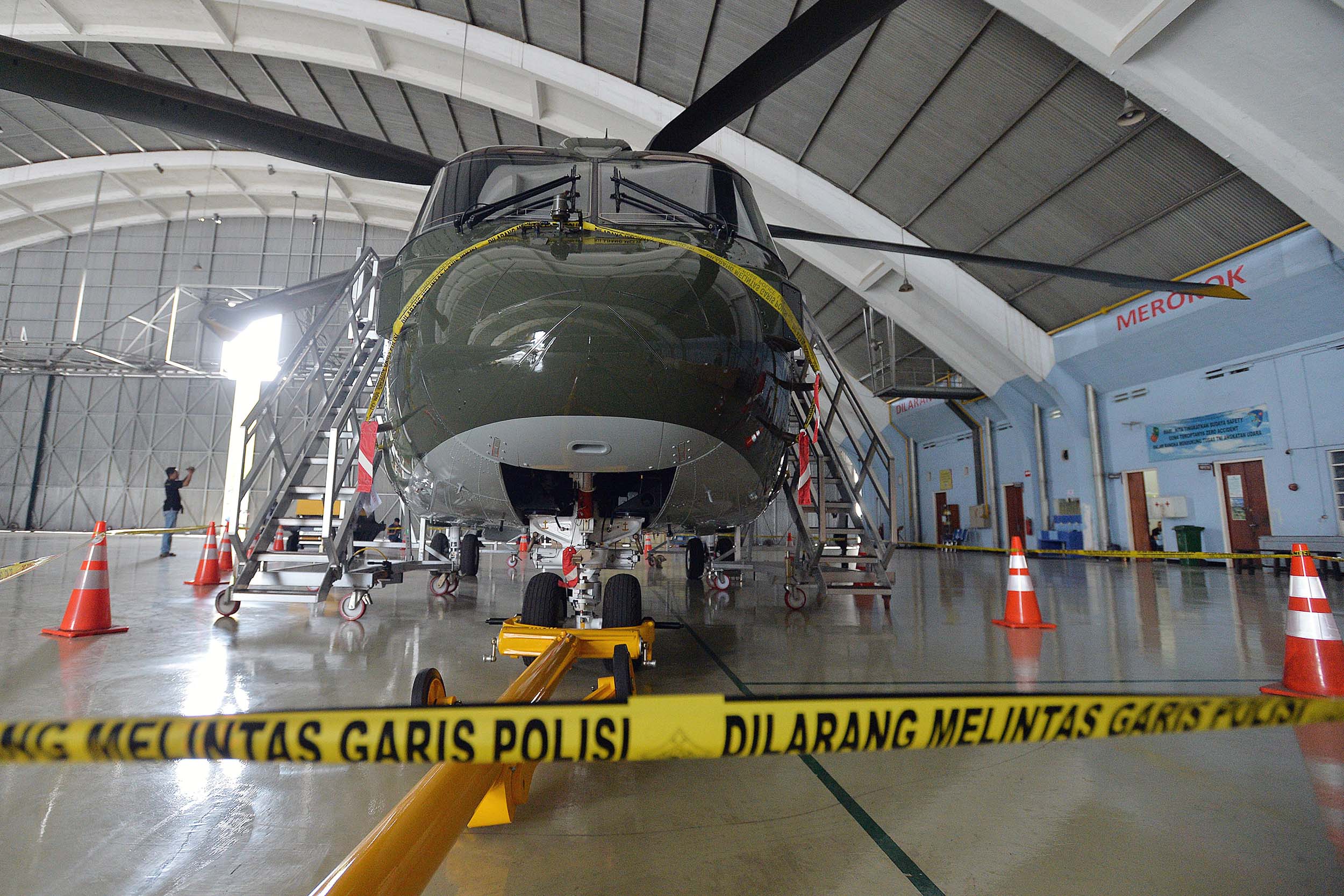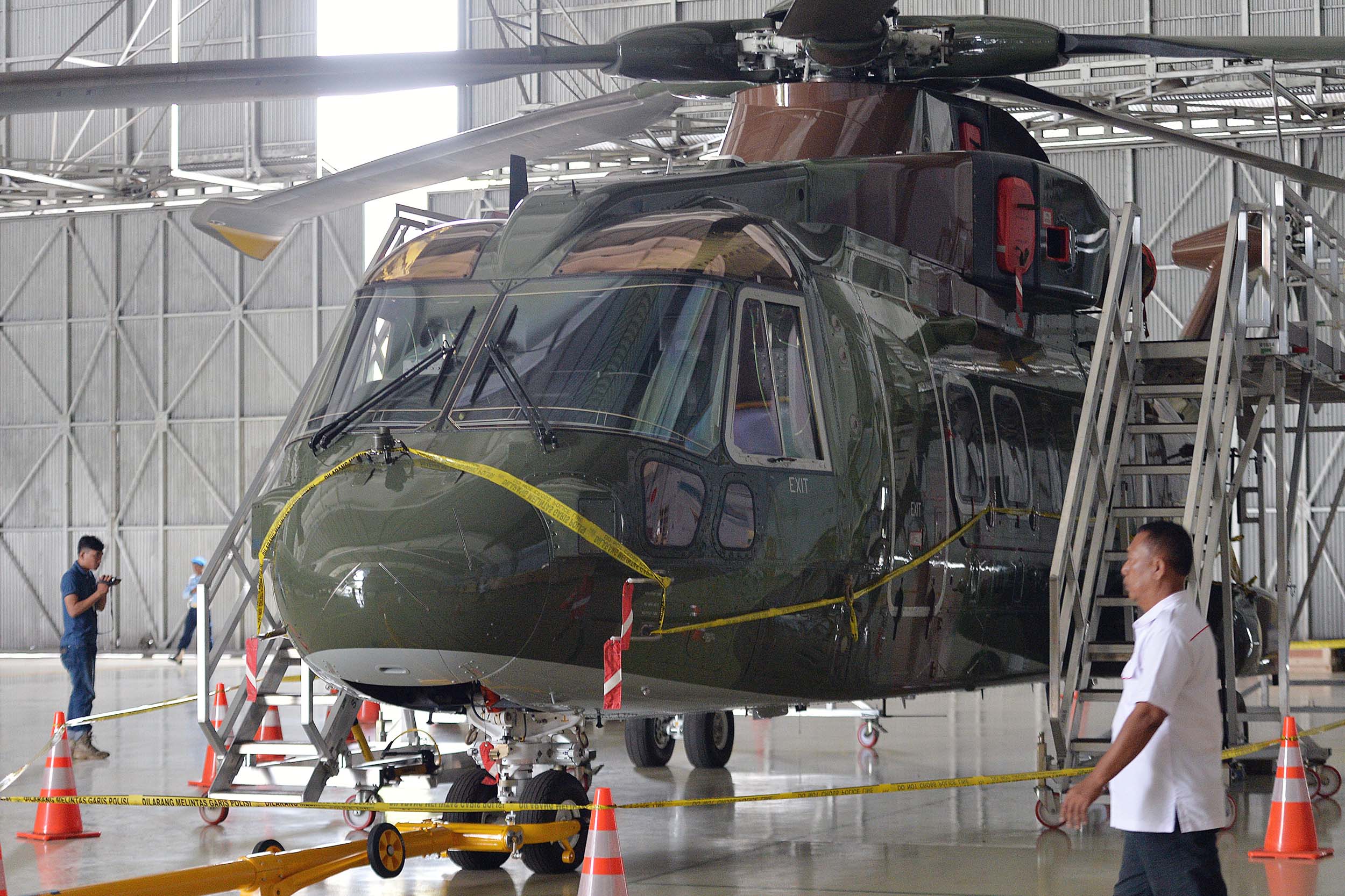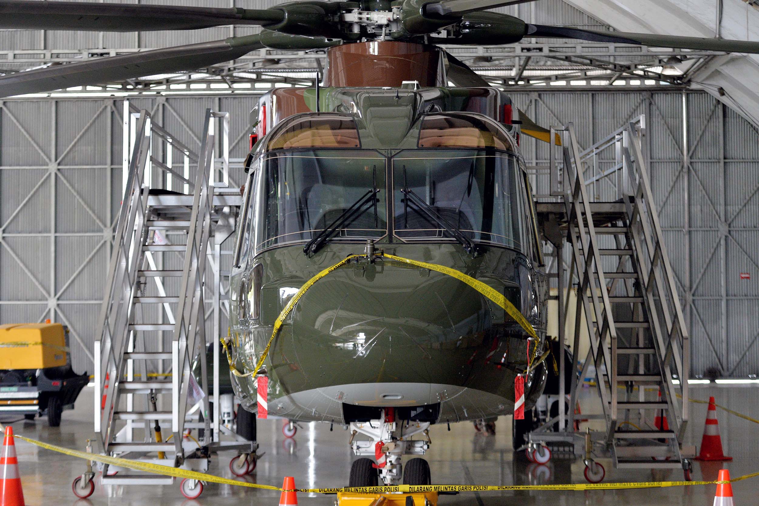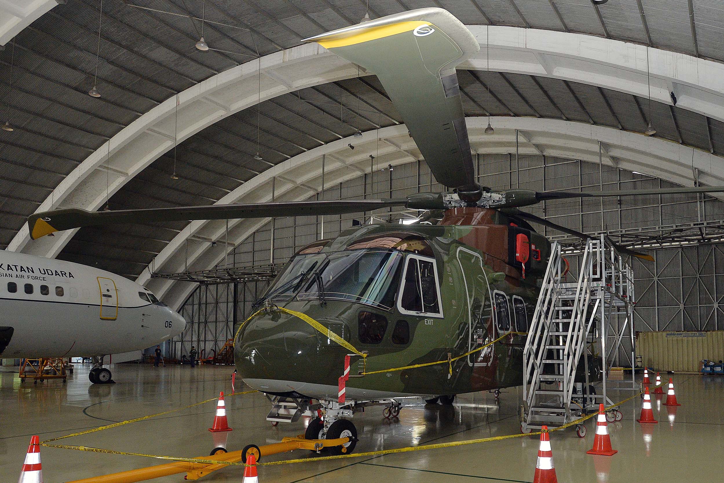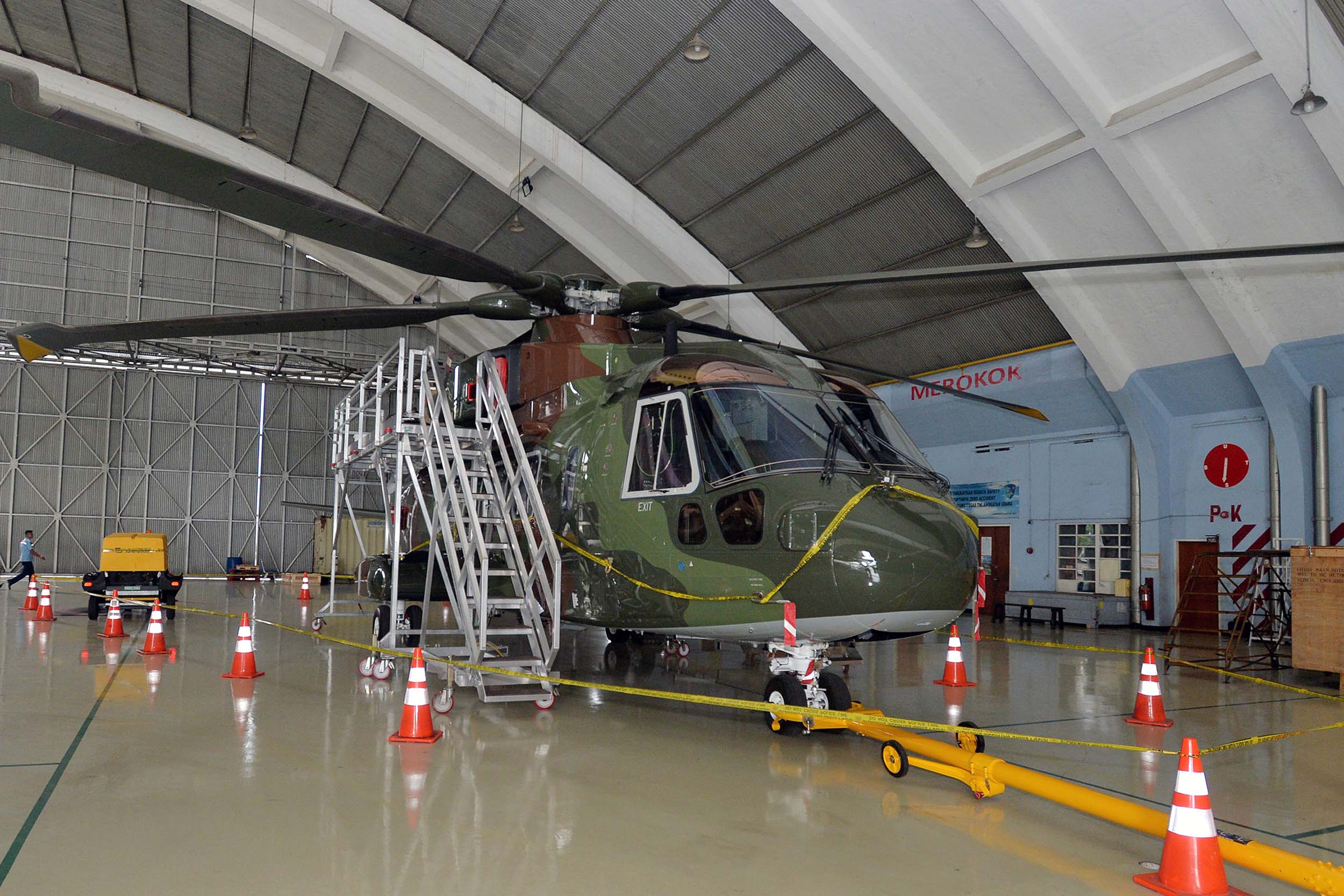 Helikopter Agusta Westland (AW) 101 terparkir dengan dipasangi garis polisi di Hanggar Skadron Teknik 021 Pangkalan Udara Halim Perdanakusuma, Jakarta Timur, Kamis (9/2). KASAU Marsekal TNI Hadi Tjahjanto telah membentuk tim investigasi untuk meneliti proses perencanaan, pengadaan dan menelisik pengiriman helikopter tersebut. ANTARA FOTO/Widodo S. Jusuf/POOL/17.