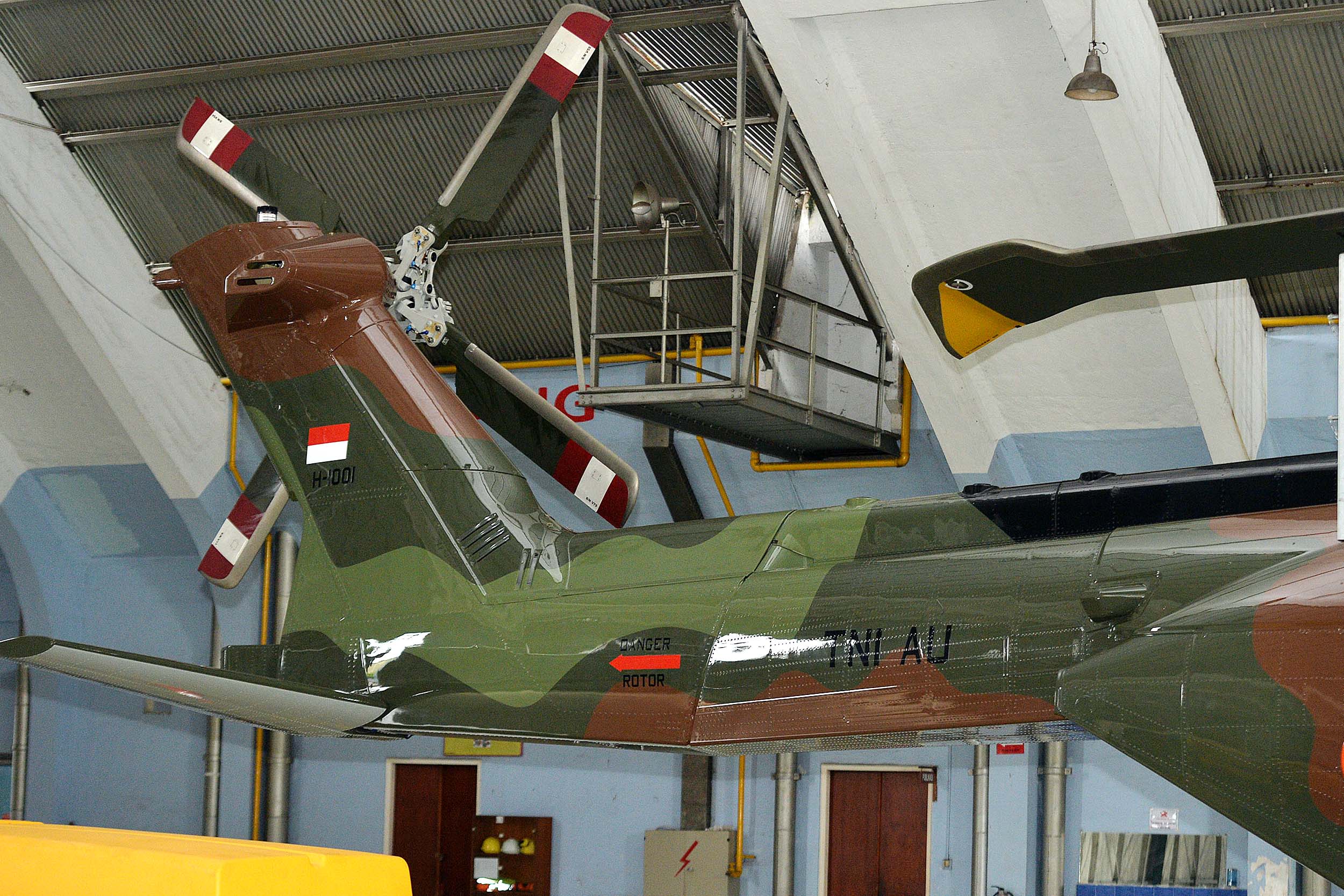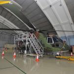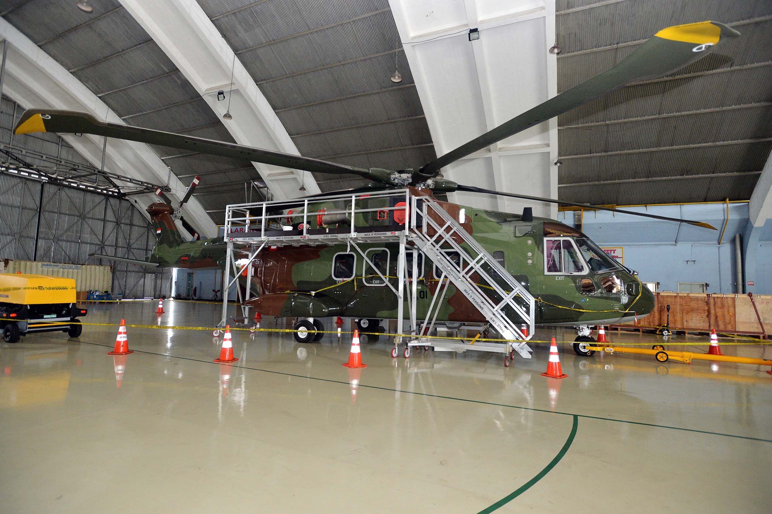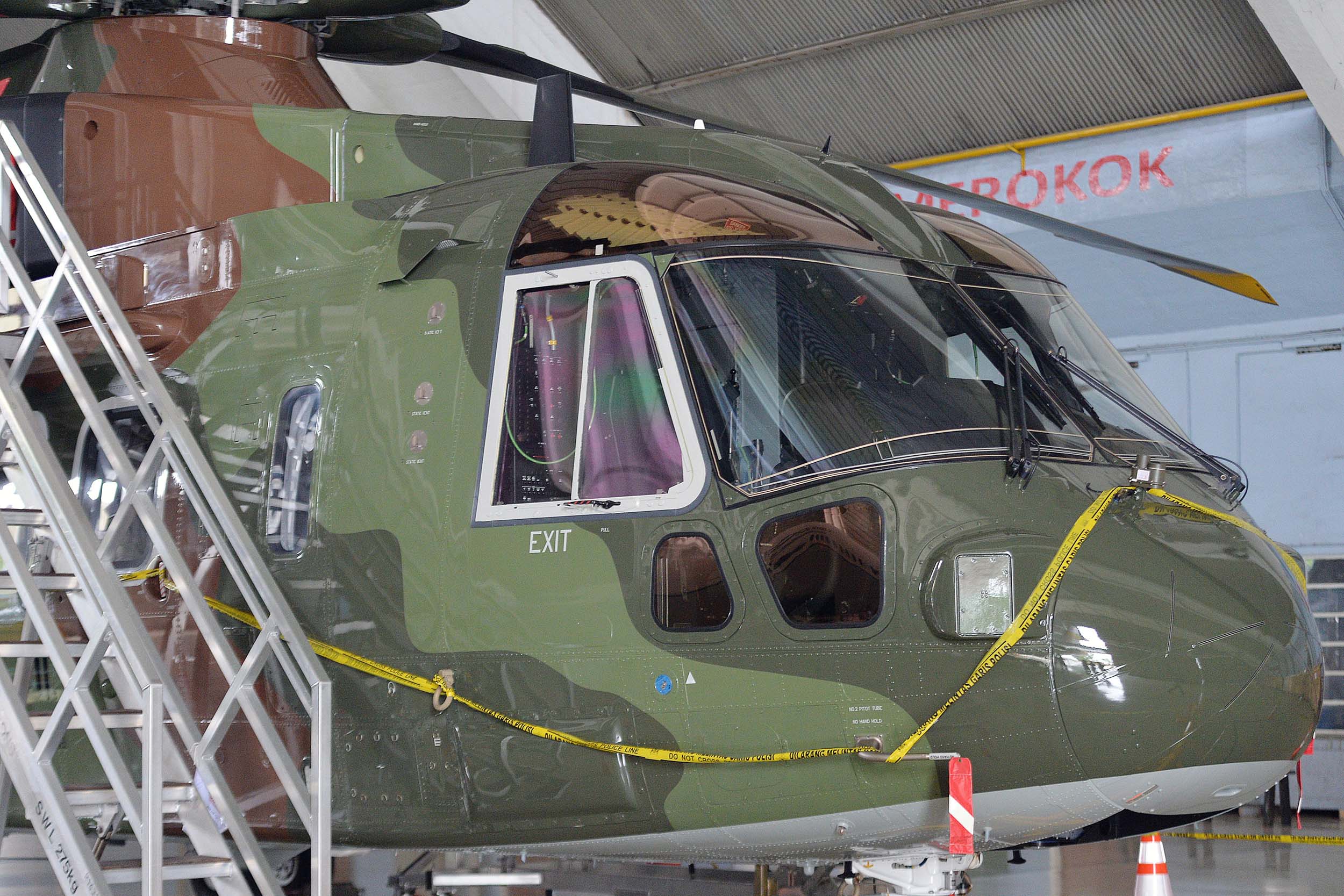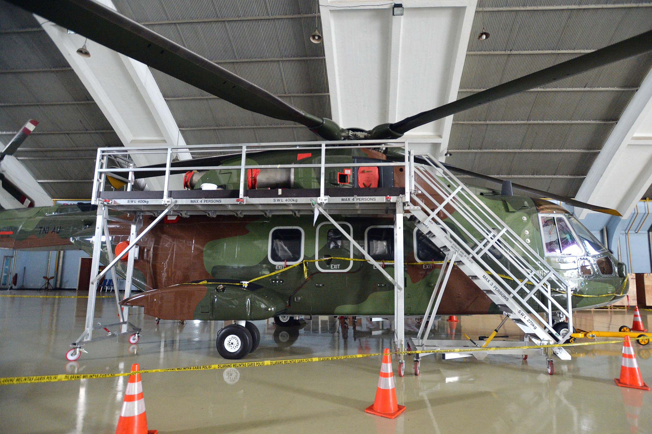 Helikopter Agusta Westland (AW) 101 terparkir dengan dipasangi garis polisi di Hanggar Skadron Teknik 021 Pangkalan Udara Halim Perdanakusuma, Jakarta Timur, Kamis (9/2). KASAU Marsekal TNI Hadi Tjahjanto telah membentuk tim investigasi untuk meneliti proses perencanaan, pengadaan dan menelisik pengiriman helikopter tersebut. ANTARA FOTO/Widodo S. Jusuf/POOL/17.