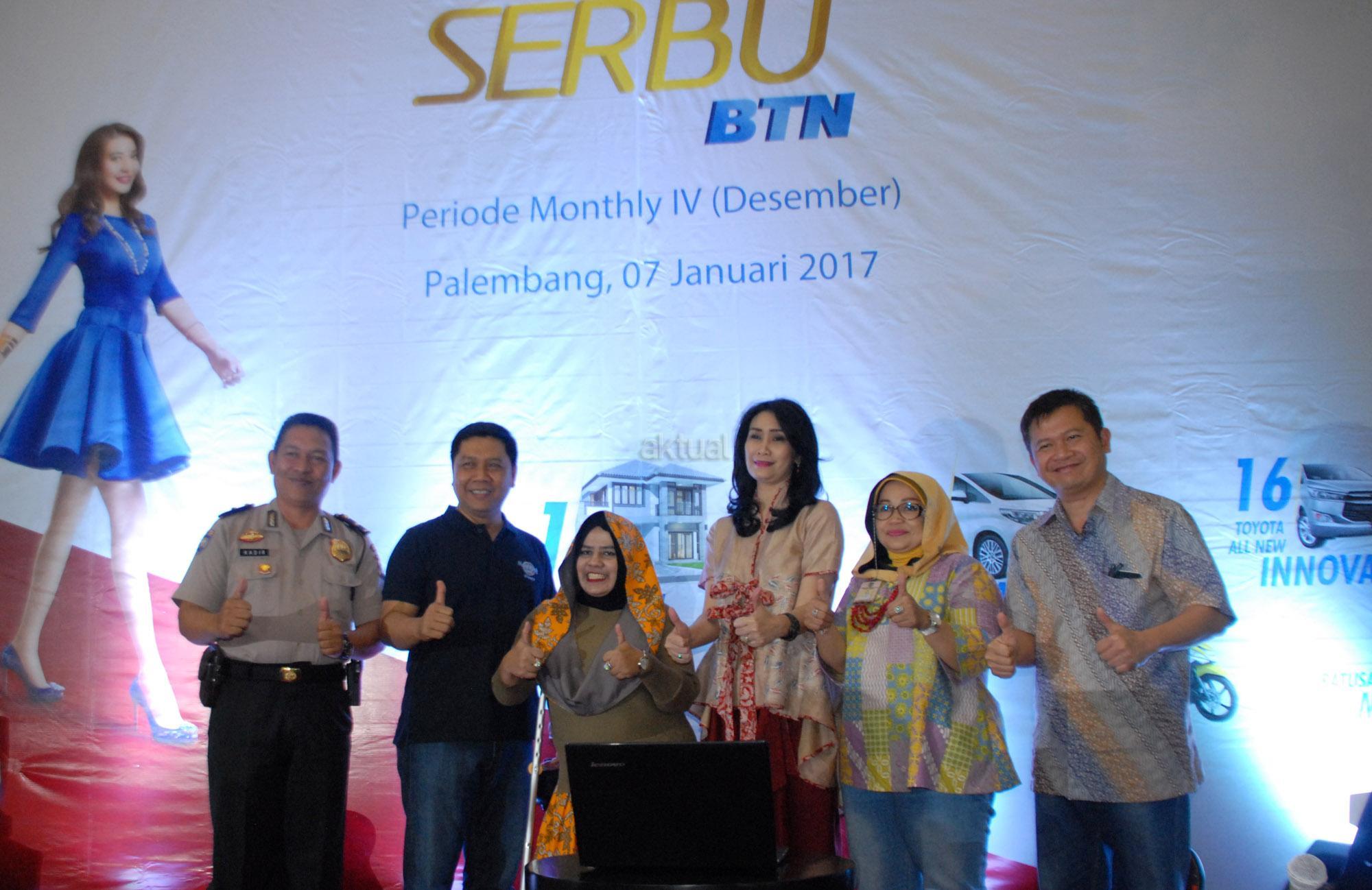 Direktur Consumer Banking Bank BTN Handayani (tengah) disaksikan Head of Ritel Funding and Services Division Nasril (kiri) dan Branch Manager BTN Kantor Cabang Palembang Adrian Syahbandi (kanan) serta perwakilan Notaris dan Kementerian Sosial, melakukan penarikan undian Monthly Prize 4 Serbu BTN 2016 di Palembang, Sumsel, Sabtu (7/1). Bank BTN melanjutkan program undian berhadiah tersebut guna meningkatkan porsi dana murah yang dibidik ada pada kisaran 50% total Dana Pihak Ketiga (DPK) pada 2017. AKTUAL/HO