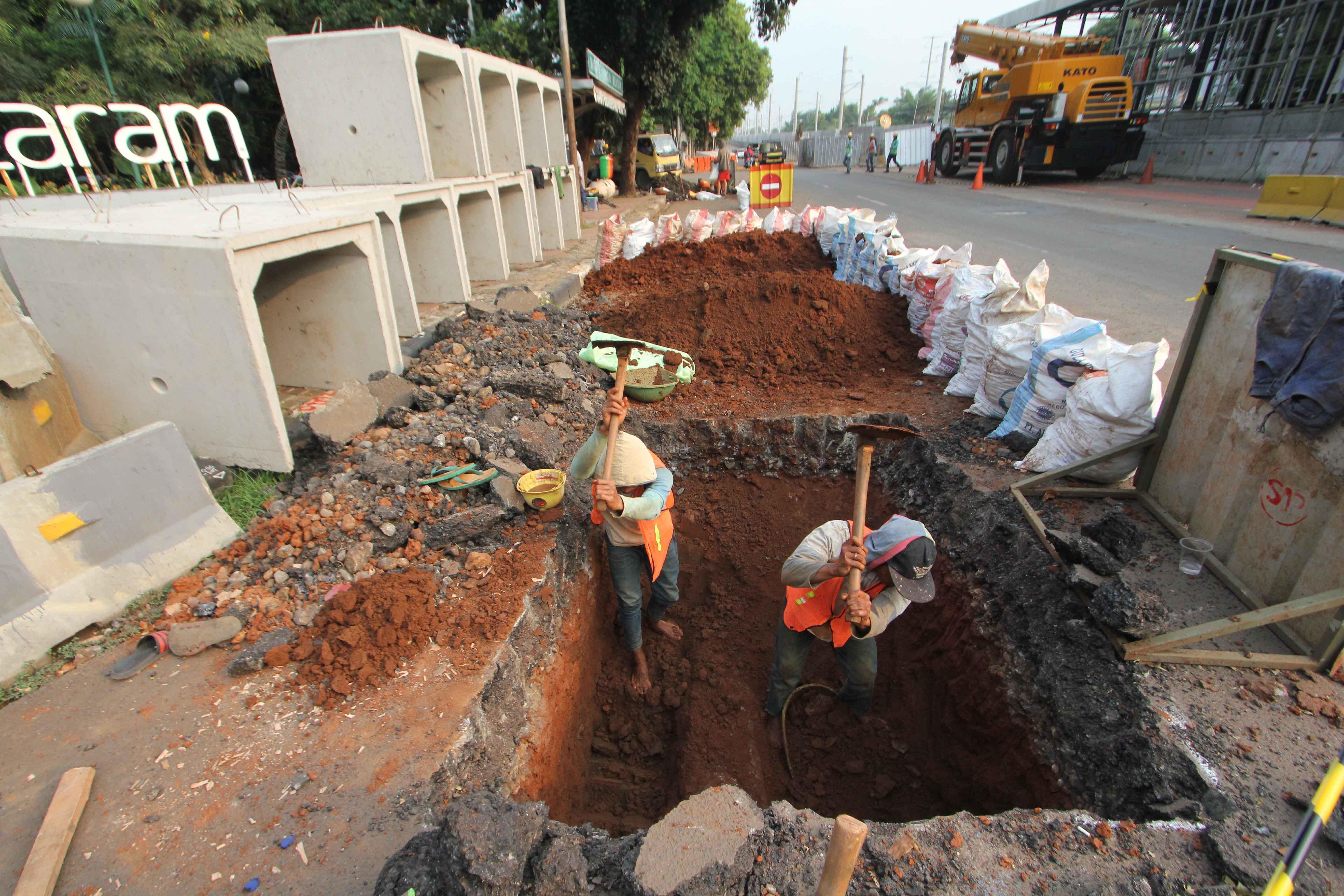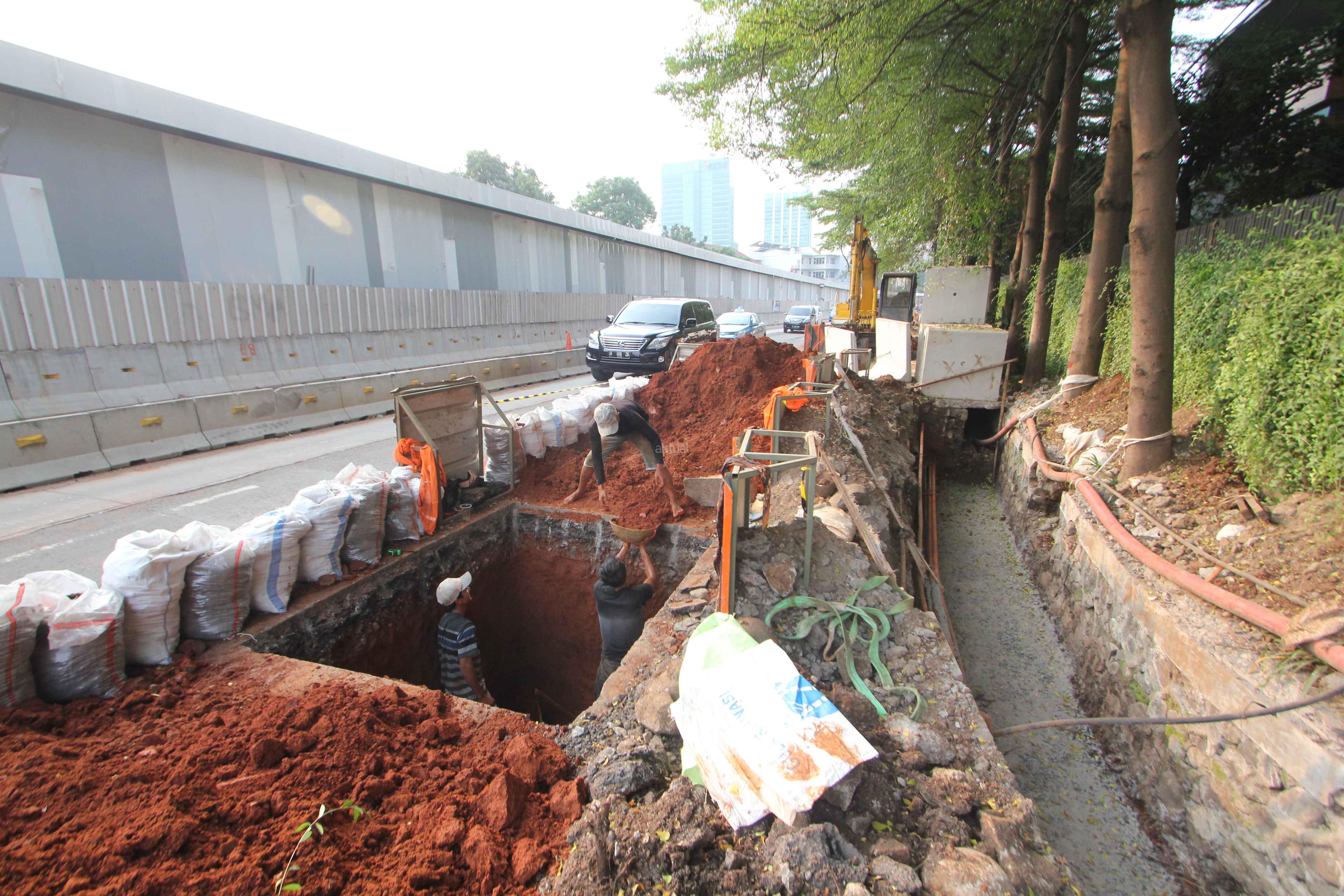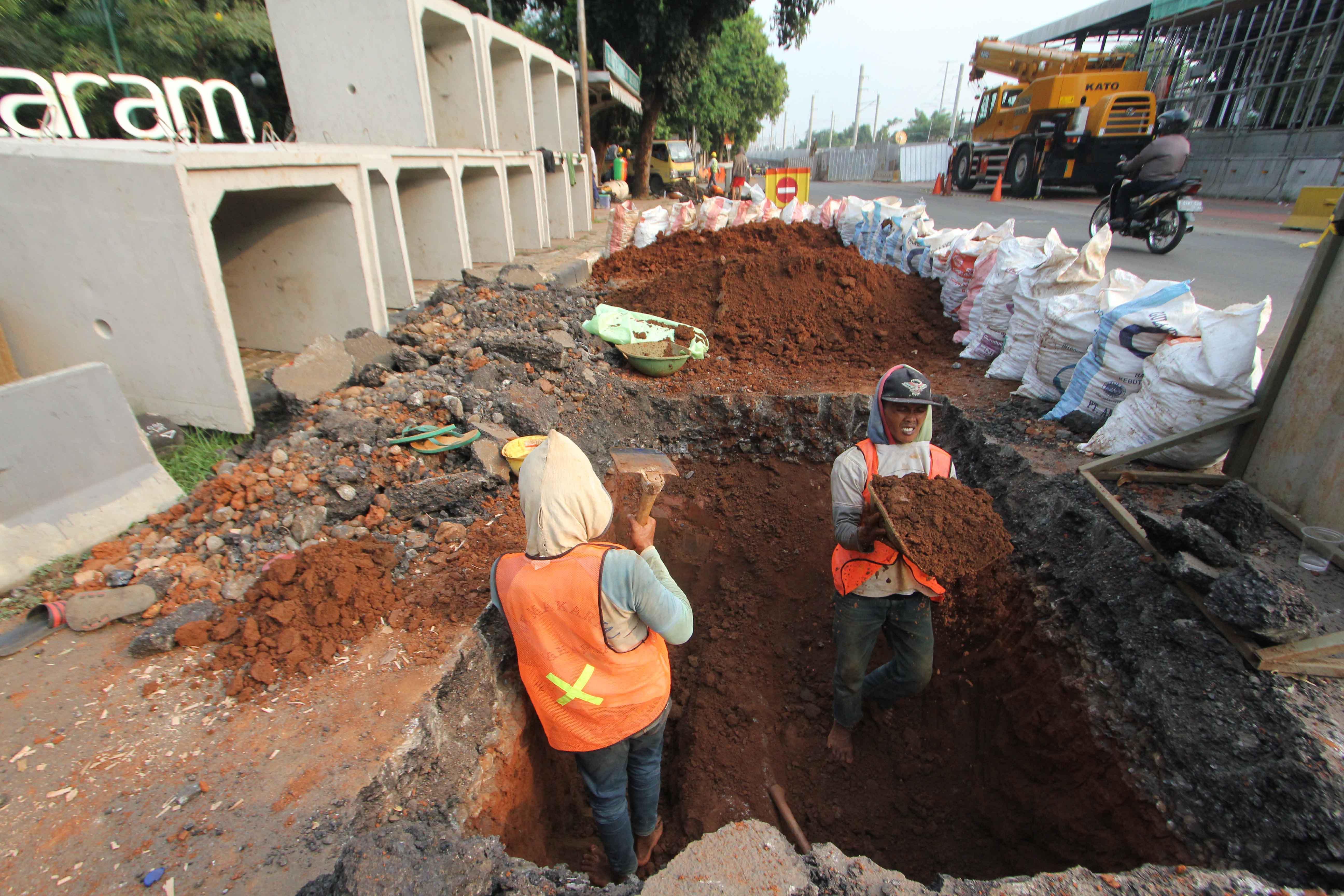 Pekerja melakukan pengerjaan penataan jalur pedestrian di Jalan Sisingamangaraja, Jakarta Selatan, Rabu (23/5/18). Selain melakukan penataan jalur pedestrian, dilokasi tersebut juga dilakukan pengerjaan perbaikan saluran air agar nantinya dapat memperlancar aliran air saat musim penghujan tiba. AKTUAL/Tino Oktaviano