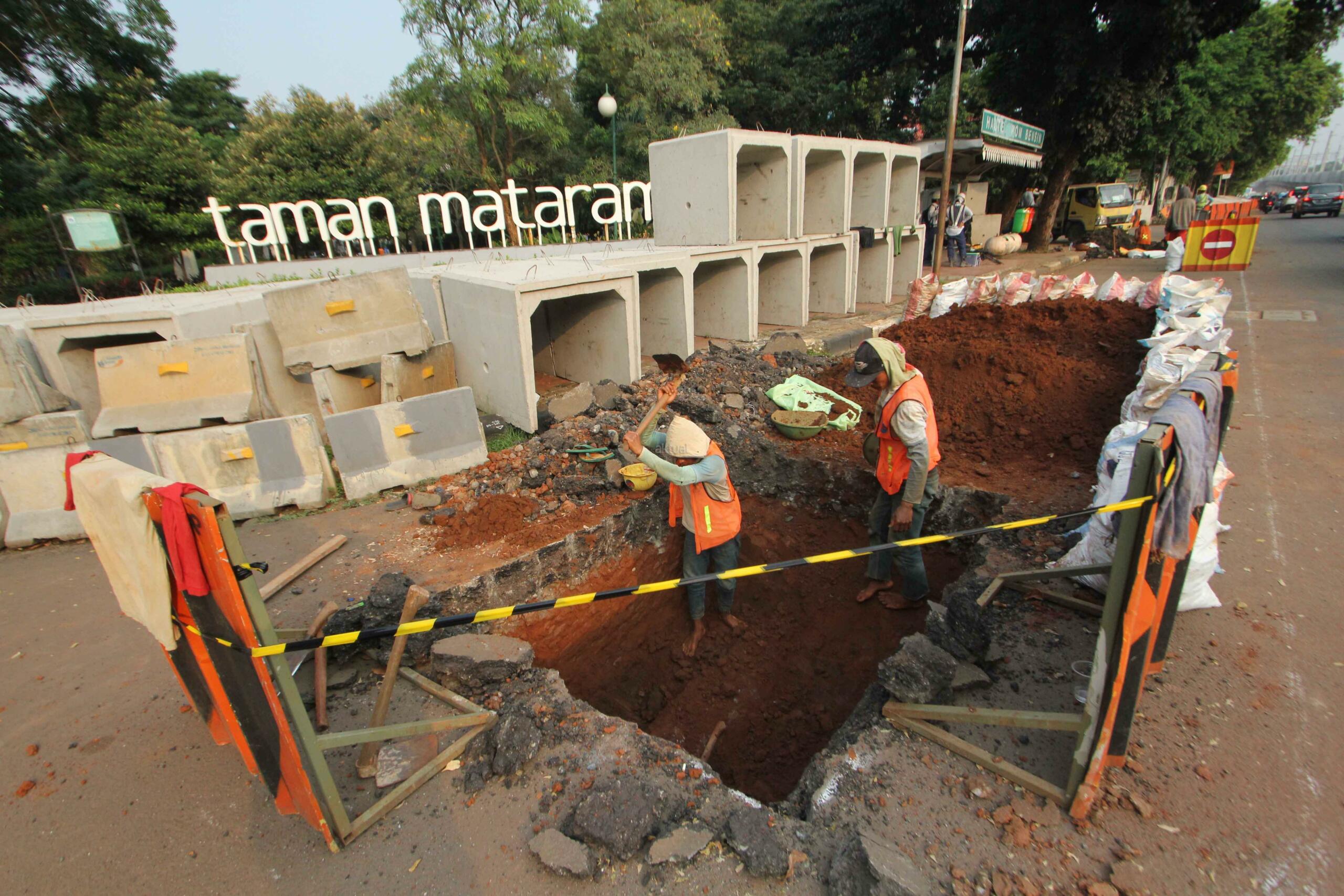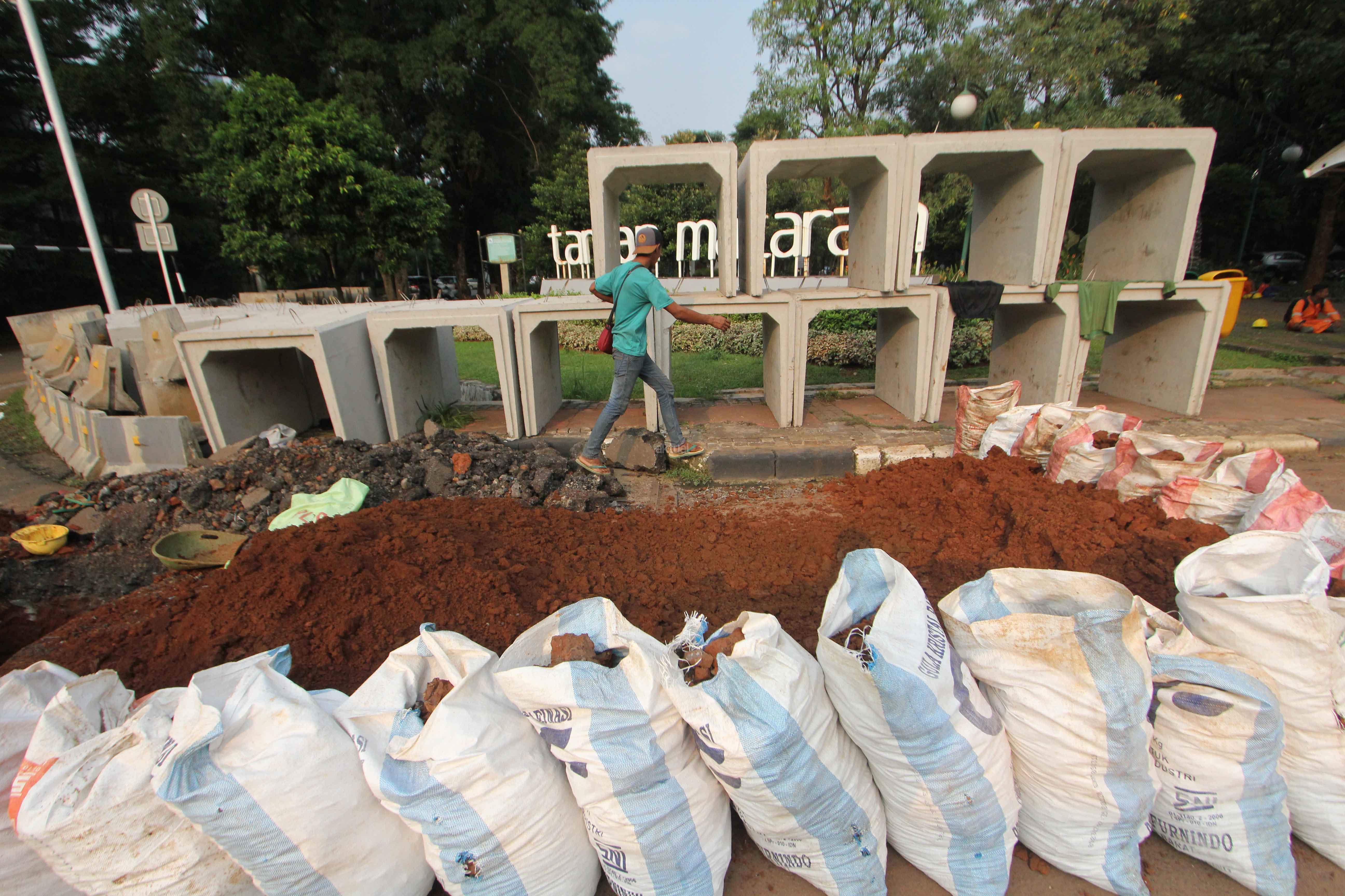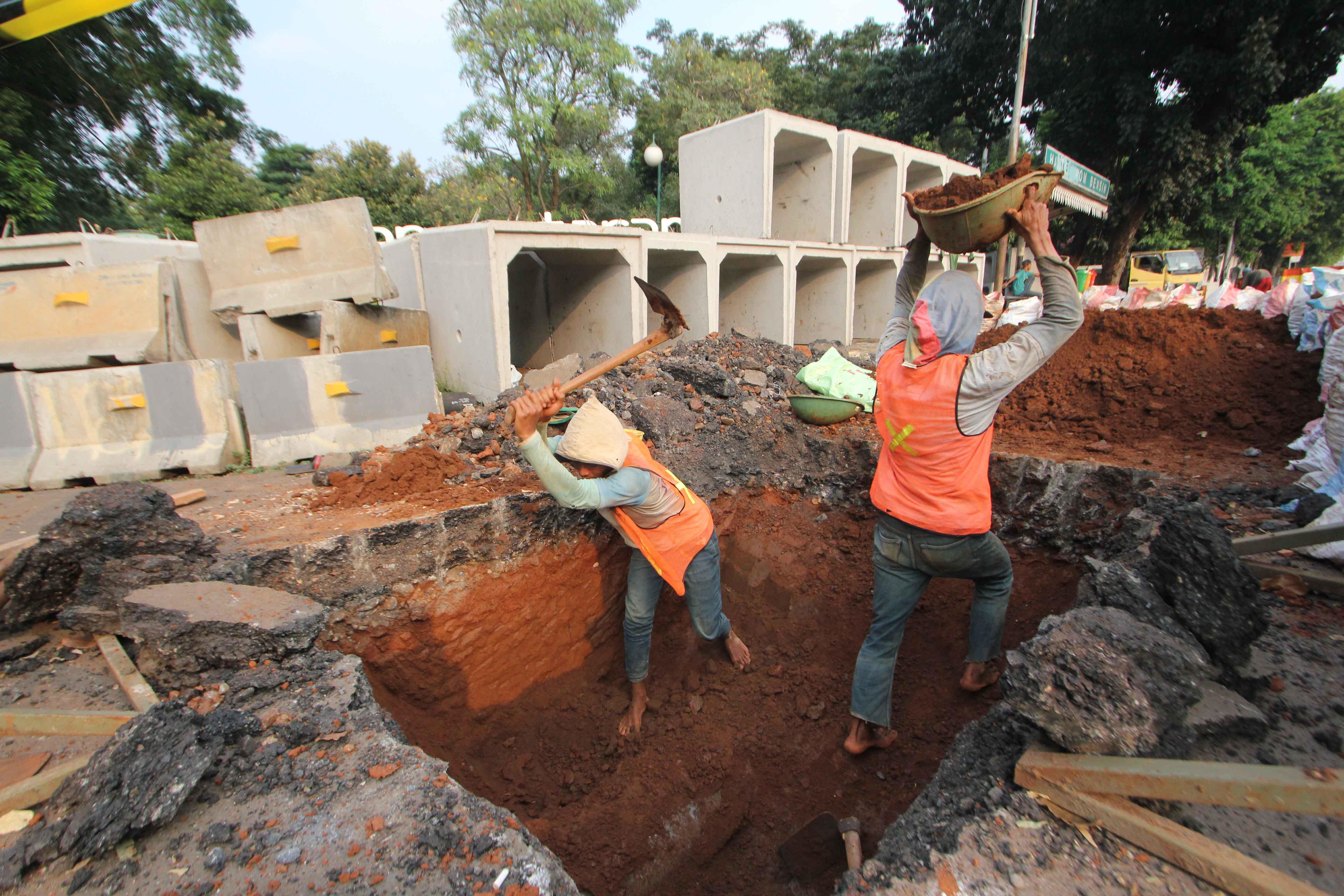 Pekerja melakukan pengerjaan penataan jalur pedestrian di Jalan Sisingamangaraja, Jakarta Selatan, Rabu (23/5/18). Selain melakukan penataan jalur pedestrian, dilokasi tersebut juga dilakukan pengerjaan perbaikan saluran air agar nantinya dapat memperlancar aliran air saat musim penghujan tiba. AKTUAL/Tino Oktaviano