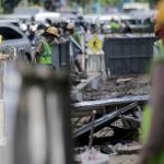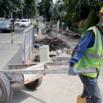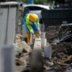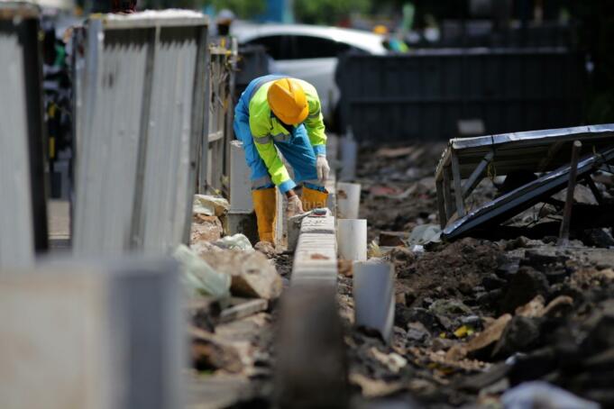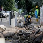 Pekerja melakukan penataan pedestrian di Kawasan Senayan, Jakarta, Jumat (9/3/18). Jakarta memilki 7000km jalur pedestrian (pejalan kaki) yang tersebar di seluruh wilayah ibukota, namun baru sekitar 400km yang telah dibuatkan trotoar di atasnya. Perbaikan dilakukan termasuk sistem drainase yang kerap terhambat oleh kabel-kabel fiber optik penyedia jasa internet. AKTUAL/Tino Oktaviano