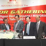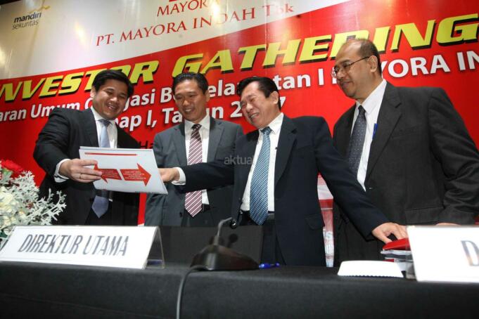 Direktur Utama PT Mayora Indah Tbk, Andre Atmadja (kedua dari kiri) bersama jajaran Direksi dan Komisaris berbincang seusai Penawaran Umum Obligasi Berkelanjutan I Mayora Indah Tahap I Tahun 2017 dengan nilai sebanyak banyaknya Rp500 miliar di Jakarta, Kamis (19/1). Dana yang diperoleh dari hasil penawaran obligasi setelah dikurangi biaya biaya emisi akan digunakan seluruhnya untuk pelunasan Sukuk Mudharabah II Mayora Indah Tahun 2012 yang akan jatuh tempo pada bulan Mei 2017 sejumlah Rp250 miliar, sisainya akan digunakan sebagai modal kerja. AKTUAL/Eko S Hilman