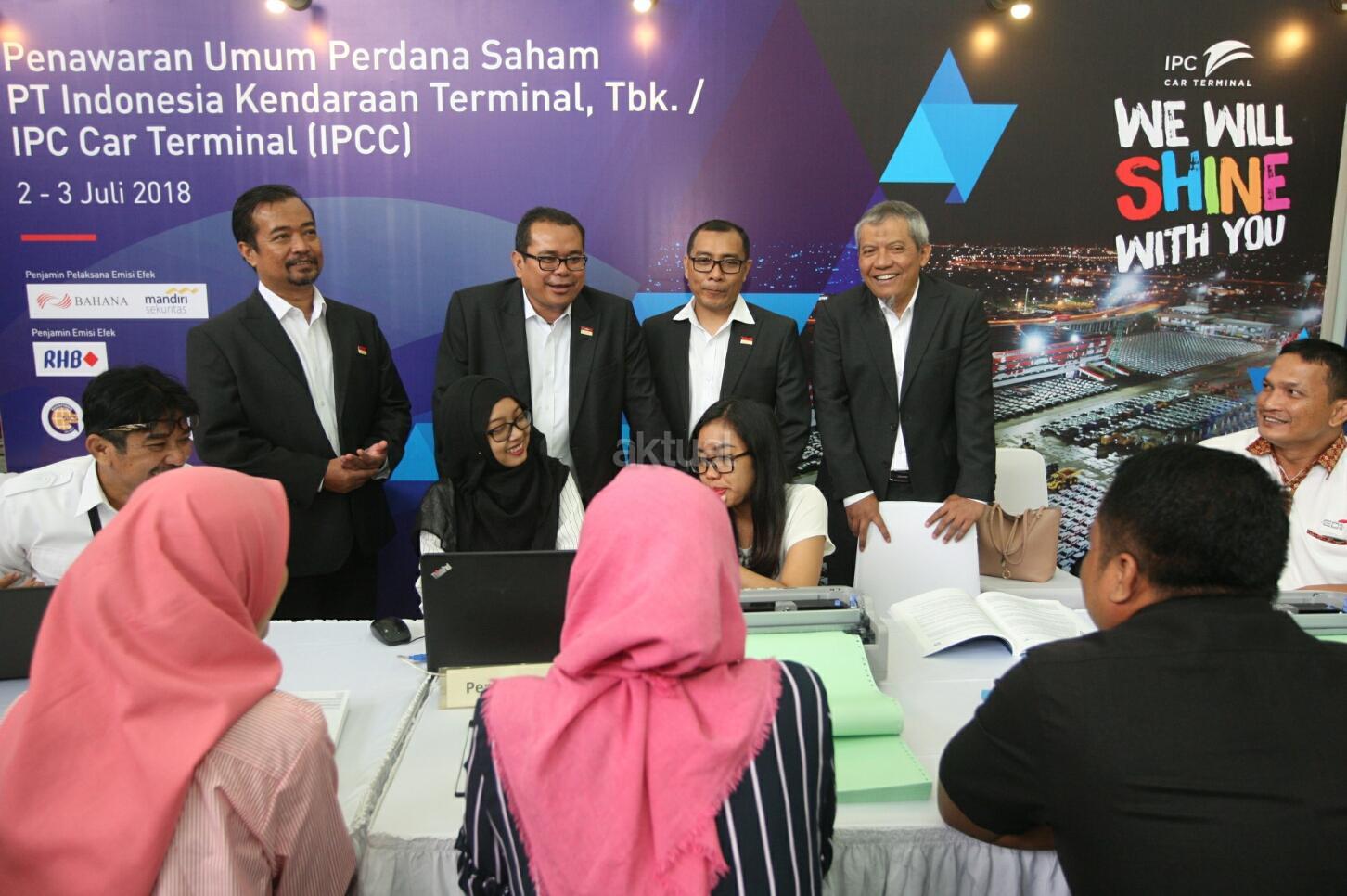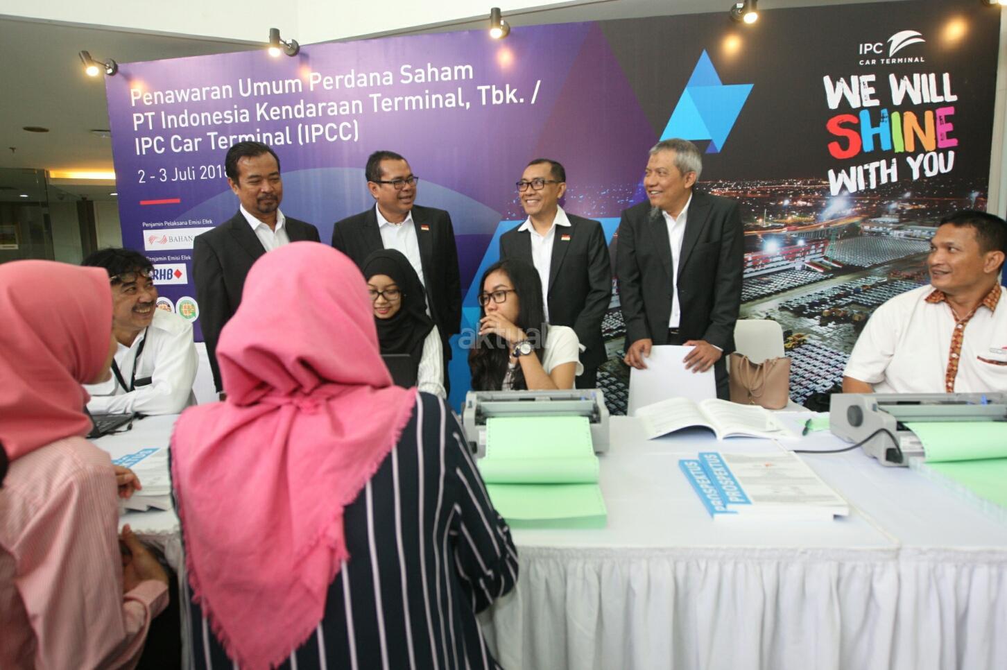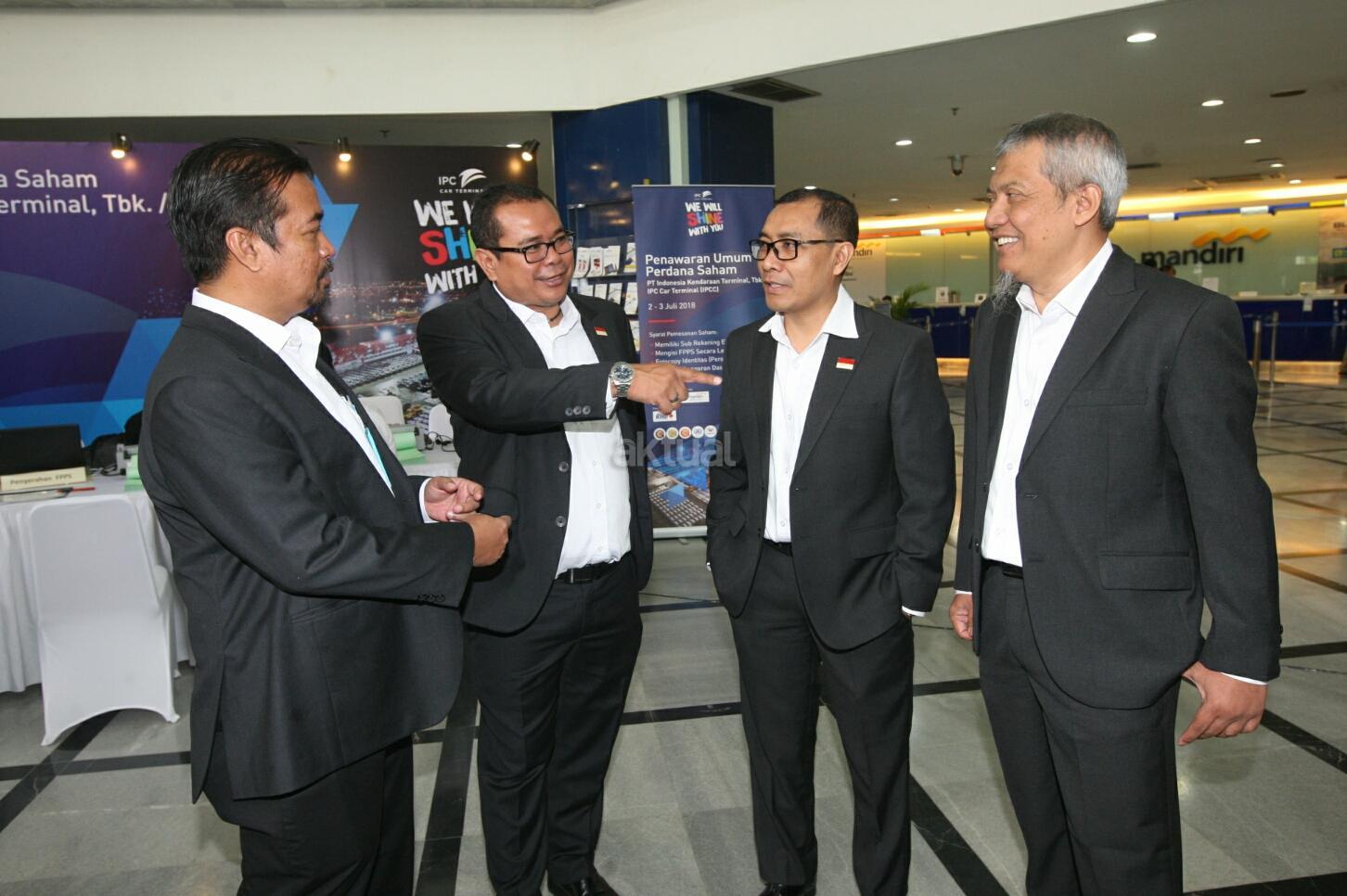 (dari kiri ke kanan) Direktur Operasional dan Teknik PT Indonesia Kendaraan Terminal Tbk (IPCC) Indra Hidayat Sani, Direktur Utama Chiefy Adi Kusmargono, Direktur Keuangan dan SDM Sugeng Mulyadi, Direktur Komersial & Pengembangan Bisnis Arif Isnawan berbincang dengan calon investor saat meninjau suasana penjualan dan penawaran umum perdana saham (IPO) di Jakarta, Senin (2/7). IPCC yang juga dikenal sebagai IPC Car Terminal dan merupakan anak usaha PT Pelabuhan Indonesia II (persero) atau Indonesia Port Corporation (IPC) yang bergerak pada bidang jasa pelayanan terminal kendaraan tersebut menawarkan 509.147.700 lembar saham dengan free float 28% dari jumlah saham. IPCC menyediakan terminal yang disiapkan tak hanya untuk mobil, melainkan alat berat, truk, bus, dan suku cadang.Perseroan mengelola lahan seluas 31 hektare dengan kapasitas 700.000 unit kendaraan per tahun. AKTUAL/Eko S Hilman