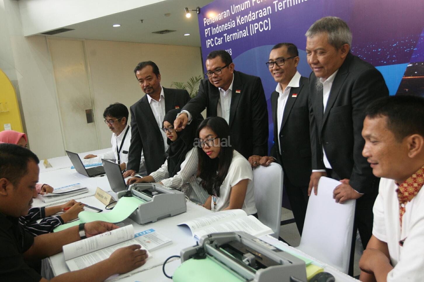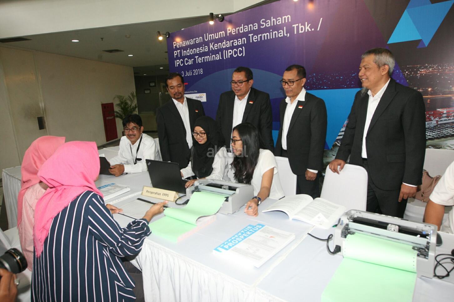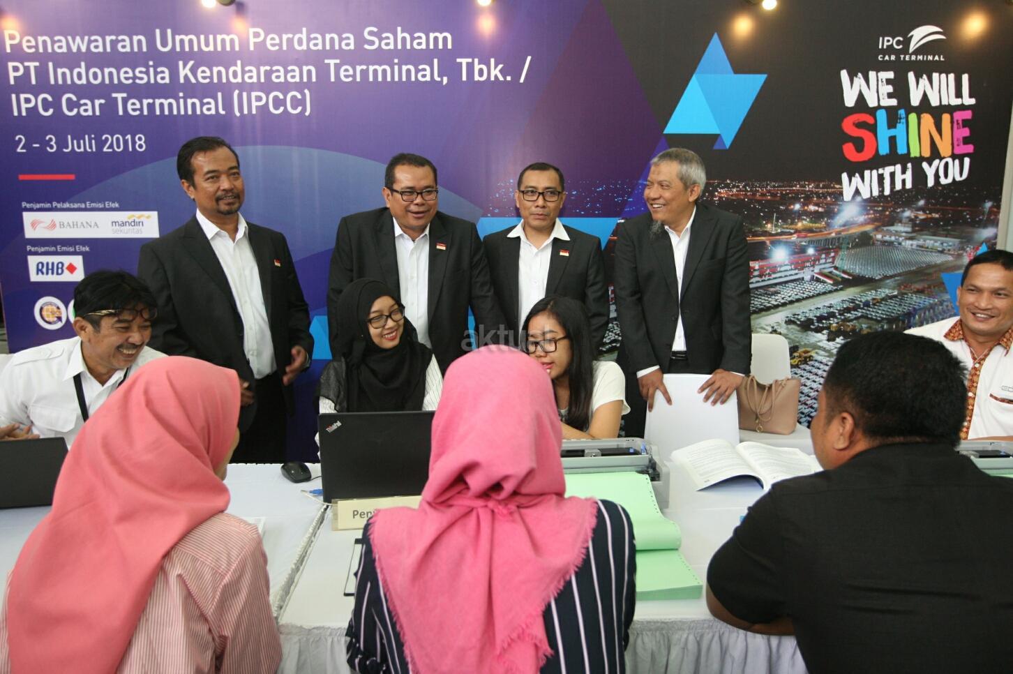 (dari kiri ke kanan) Direktur Operasional dan Teknik PT Indonesia Kendaraan Terminal Tbk (IPCC) Indra Hidayat Sani, Direktur Utama Chiefy Adi Kusmargono, Direktur Keuangan dan SDM Sugeng Mulyadi, Direktur Komersial & Pengembangan Bisnis Arif Isnawan berbincang dengan calon investor saat meninjau suasana penjualan dan penawaran umum perdana saham (IPO) di Jakarta, Senin (2/7). IPCC yang juga dikenal sebagai IPC Car Terminal dan merupakan anak usaha PT Pelabuhan Indonesia II (persero) atau Indonesia Port Corporation (IPC) yang bergerak pada bidang jasa pelayanan terminal kendaraan tersebut menawarkan 509.147.700 lembar saham dengan free float 28% dari jumlah saham. IPCC menyediakan terminal yang disiapkan tak hanya untuk mobil, melainkan alat berat, truk, bus, dan suku cadang.Perseroan mengelola lahan seluas 31 hektare dengan kapasitas 700.000 unit kendaraan per tahun. AKTUAL/Eko S Hilman