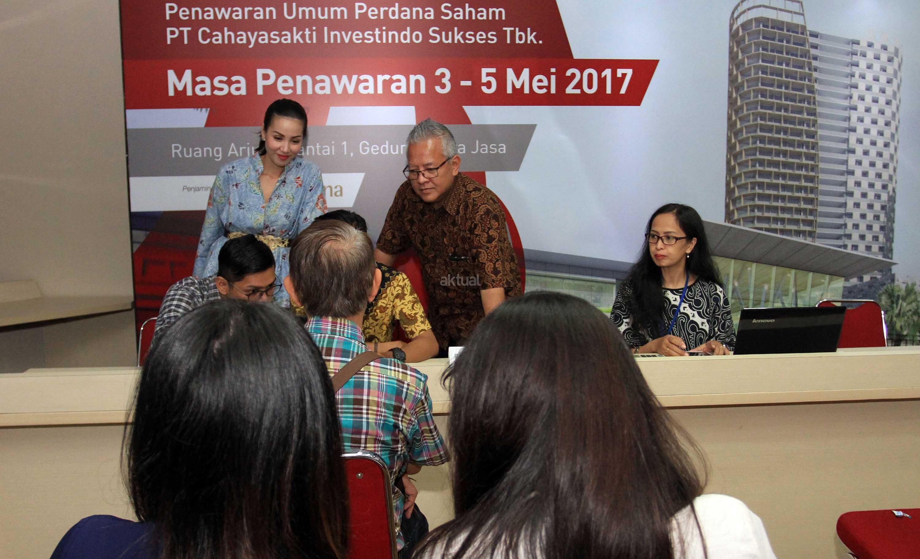 Direktur PT Cahayasakti Investindo Sukses Tbk (CSIS), Imelda Fransisca (kanan) bersama Direktur Independen, Deddy Daryanto saat meninjau dan berdialog dengan para calon investor saat Penawaran Umum Saham Perdana yang berlangsung dari tanggal 3-5 Mei 2017 di ruang Arjuna, Gedung Patra Jasa, Jakarta, Senin Rabu (3/5). CSIS siap menawarkan sebanyak banyaknya 207 juta saham bagi kepada publik. CSIS akan menggunakan 78% dana hasi IPO untuk modal kerja, 10% untuk pembayaran sebagian produk utang dan 12% untuk belanja modal. AKTUAL/Eko S Hilman