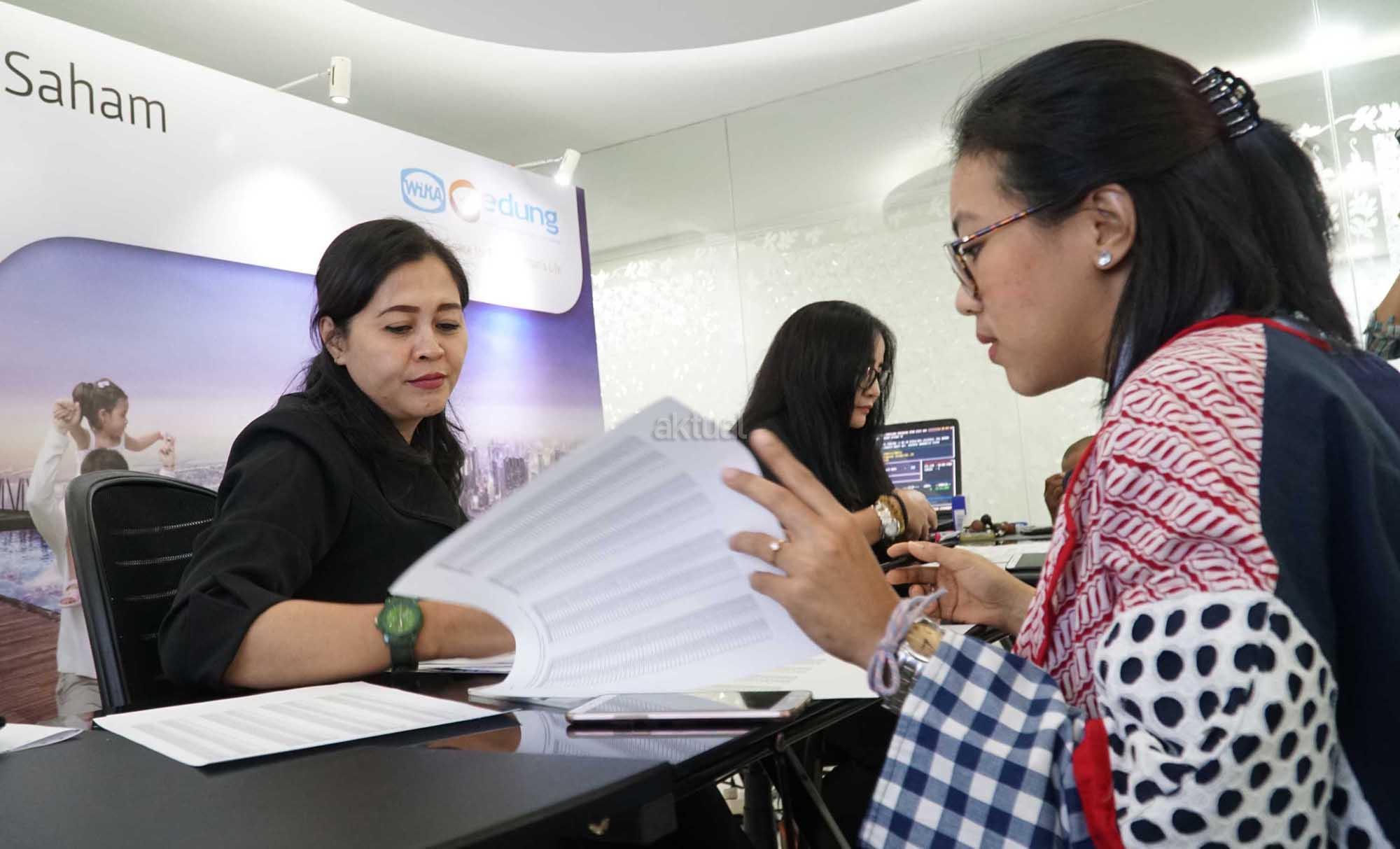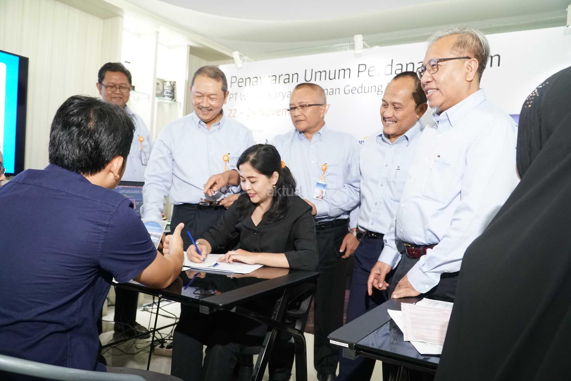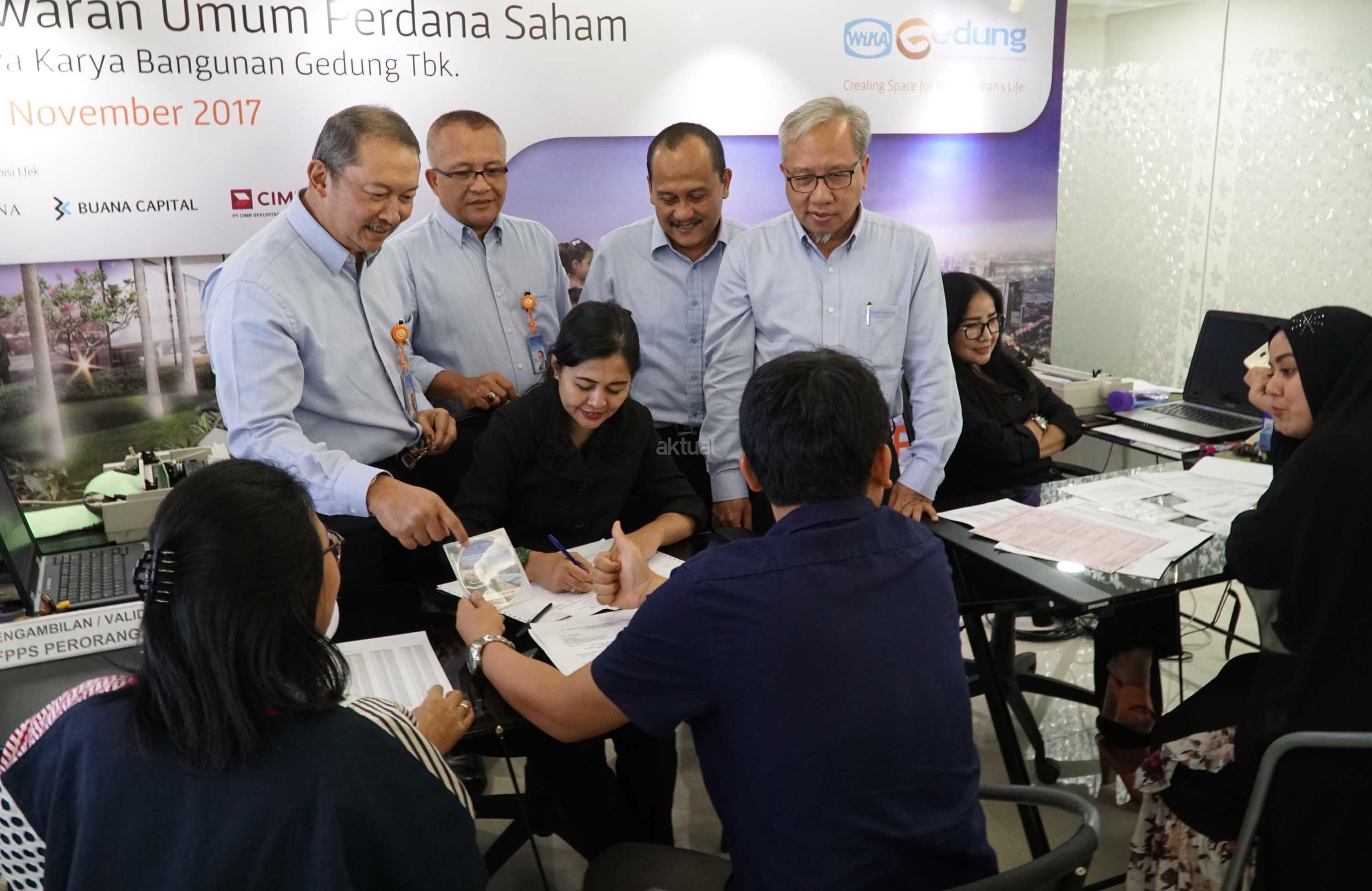 Sejumlah investor melakukan validasi dan mengisi formulir pemesanan saat disela kegiatan masa penawaran umum saham yang dimulai pada tanggal 22- 24 November 2017 di Jakarta, Rabu (22/11).WIKA Gedung menawarkan sebanyak-banyaknya 2.872.000.000 saham setelah penawaran umum perdana (initial public offering/IPO).Harga penawaran umum berada pada Rp 290 per saham. Maka dari itu, PT Wijaya Karya Bangunan Gedung Tbk menargetkan dana yang diraih sebesar Rp 832.880.000.000.Perseroan berencana mengalokasikan 70% dana hasil IPO untuk investasi dan konsesi,serta sisanya 30% untuk modal kerja.WIKA Gedung bergerak di bidang usaha konstruksi bangunan gedung dengan memposisikan diri sebagai ‘Total Solution Contractor” dan senantiasa memberikan solusi bernilai tambah, pelayanan terbaik dalam safety& quality.Saat ini WIKA Gedung fokus pada pengembangan usaha melalui transformasi bisnis property ke arah investasi dan konsesi. AKTUAL/Eko S Hilman