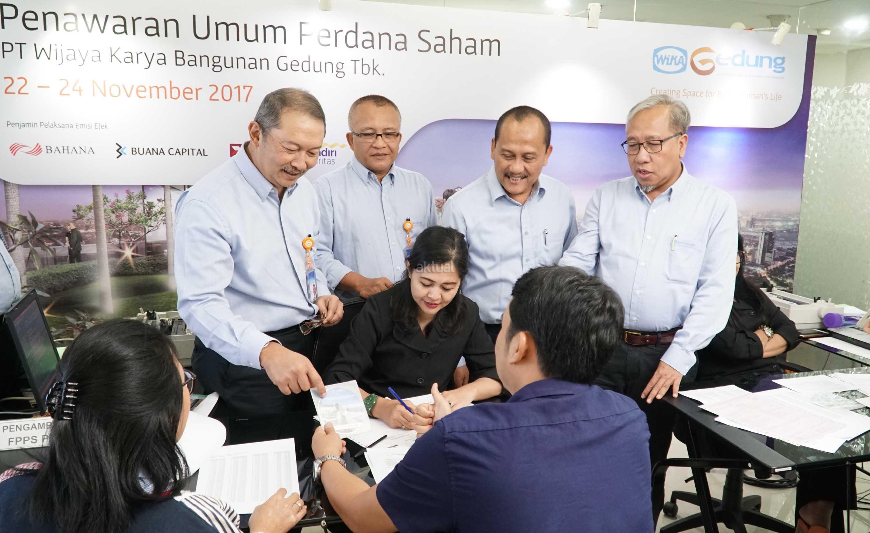 ( Dari Kiri-kanan) PT Abiprayadi Riyanto - Direktur Keuangan PT Wijaya Karya Bangunan Gedung Tbk, Widhi Pudjiono - Direktur Operasi I, Nariman Prasetyo - Direktur Utama, Nur Al Fata , Direktur Human Capital & Pengembangan Investasi mendatangi dan berdialog dengan investor disela kegiatan masa penawaran umum saham yang dimulai pada tanggal 22- 24 November 2017 di Jakarta, Rabu (22/11).WIKA Gedung menawarkan sebanyak-banyaknya 2.872.000.000 saham setelah penawaran umum perdana (initial public offering/IPO).Harga penawaran umum berada pada Rp 290 per saham. Maka dari itu, PT Wijaya Karya Bangunan Gedung Tbk menargetkan dana yang diraih sebesar Rp 832.880.000.000.Perseroan berencana mengalokasikan 70% dana hasil IPO untuk investasi dan konsesi,serta sisanya 30% untuk modal kerja.WIKA Gedung bergerak di bidang usaha konstruksi bangunan gedung dengan memposisikan diri sebagai 'Total Solution Contractor" dan senantiasa memberikan solusi bernilai tambah, pelayanan terbaik dalam safety& quality.Saat ini WIKA Gedung fokus pada pengembangan usaha melalui transformasi bisnis property ke arah investasi dan konsesi. AKTUAL/Eko S Hilman