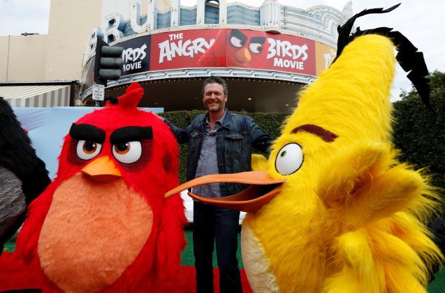 Pemeran Blake Shelton berfoto dengan karakter film dalam sebuah pesta menyusul premier "The Angry Birds Movie" di Los Angeles, Amerika Serikat, Sabtu (7/5). ANTARA FOTO/REUTERS/Mario Anzuoni/cfo/16