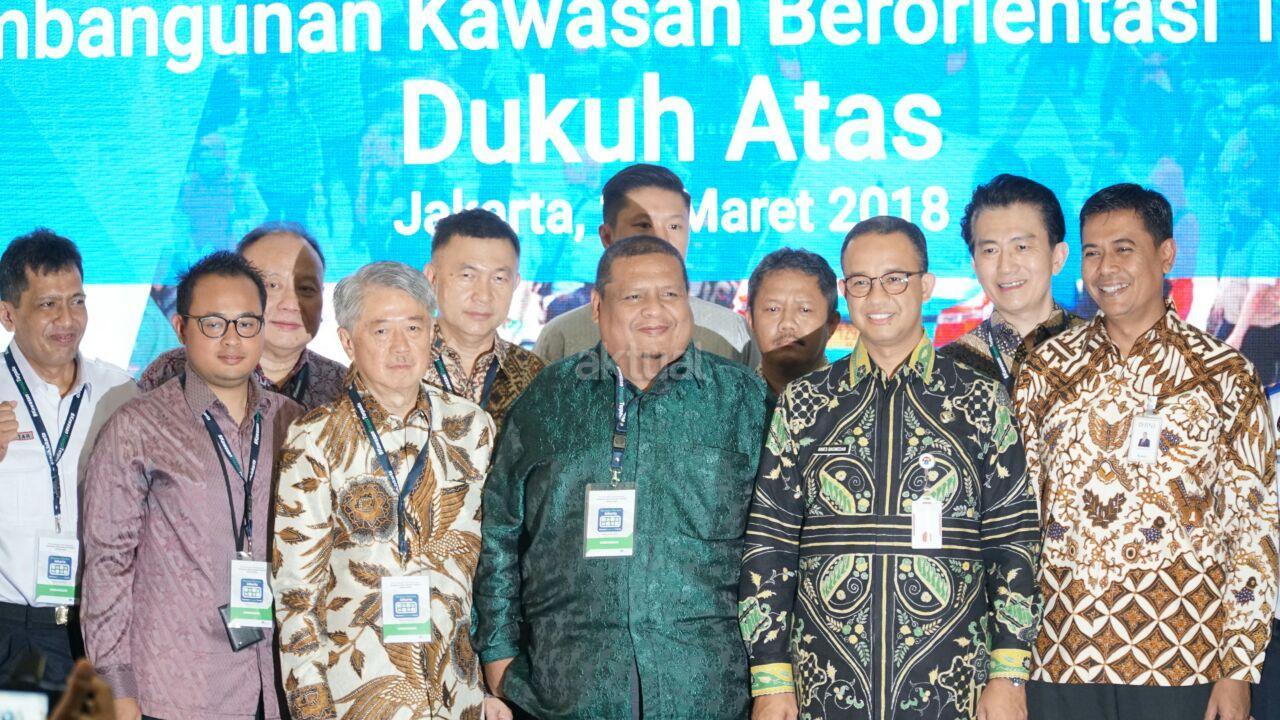 Gubernur DKI Jakarta Anies Baswedan bersama Presiden Direktur PT Intiland Development Tbk Hendro S. Gondokusumo usai penandatanganan komitmen pengembangan Kawasan Berorientasi Transit (KBT) Dukuh Atas Jakarta dalam acara Pencanangan Kawasan Berorientasi Transit (KBT) Dukuh Atas oleh Gubernur DKI Jakarta, Kamis, (29/3/18). Intiland merupakan salah satu stakeholder yang turut mengembangkan KBT Jakarta. AKTUAL/Eko S Hilman