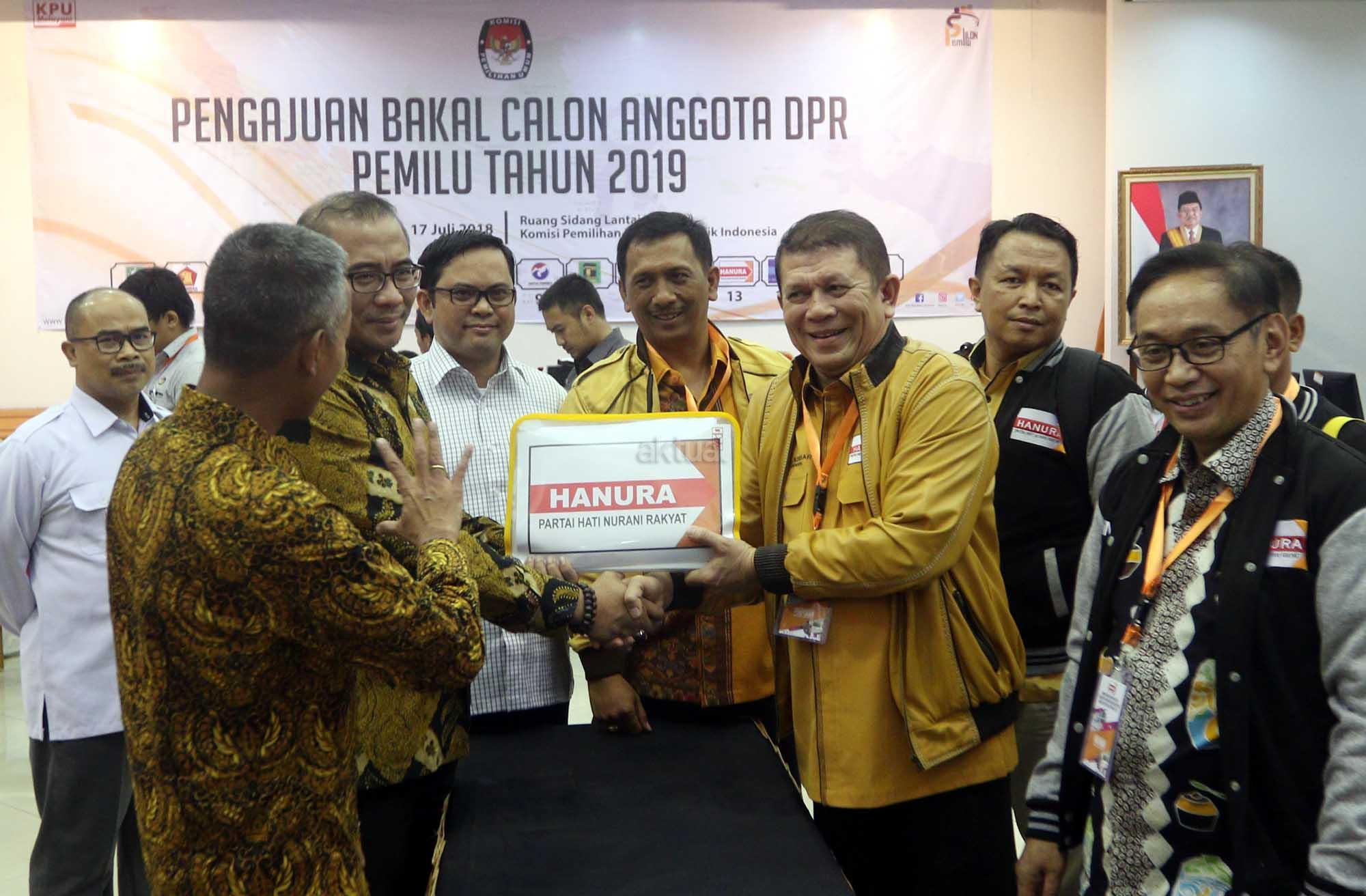 Sekjen Partai Hanura Harry Lontung Siregar (kanan) berjabat tangan dengan Komisioner KPU Hasyim Asy’ari (kedua kiri) disaksikan Wakil Ketua Umum Partai Hanura I Gede Pasek (kedua kanan), Komisioner KPU Wahyu Setiawan (kiri) dan Viryan (tengah), saat menyerahkan berkas pendaftaran bakal calon legislatif di KPU, Jakarta, Selasa (17/7). Partai Hanura secara resmi mendaftarkan nama-nama bakal calon legislatif ke KPU untuk mengikuti Pemilu 2019. AKTUAL/Tino Oktaviano