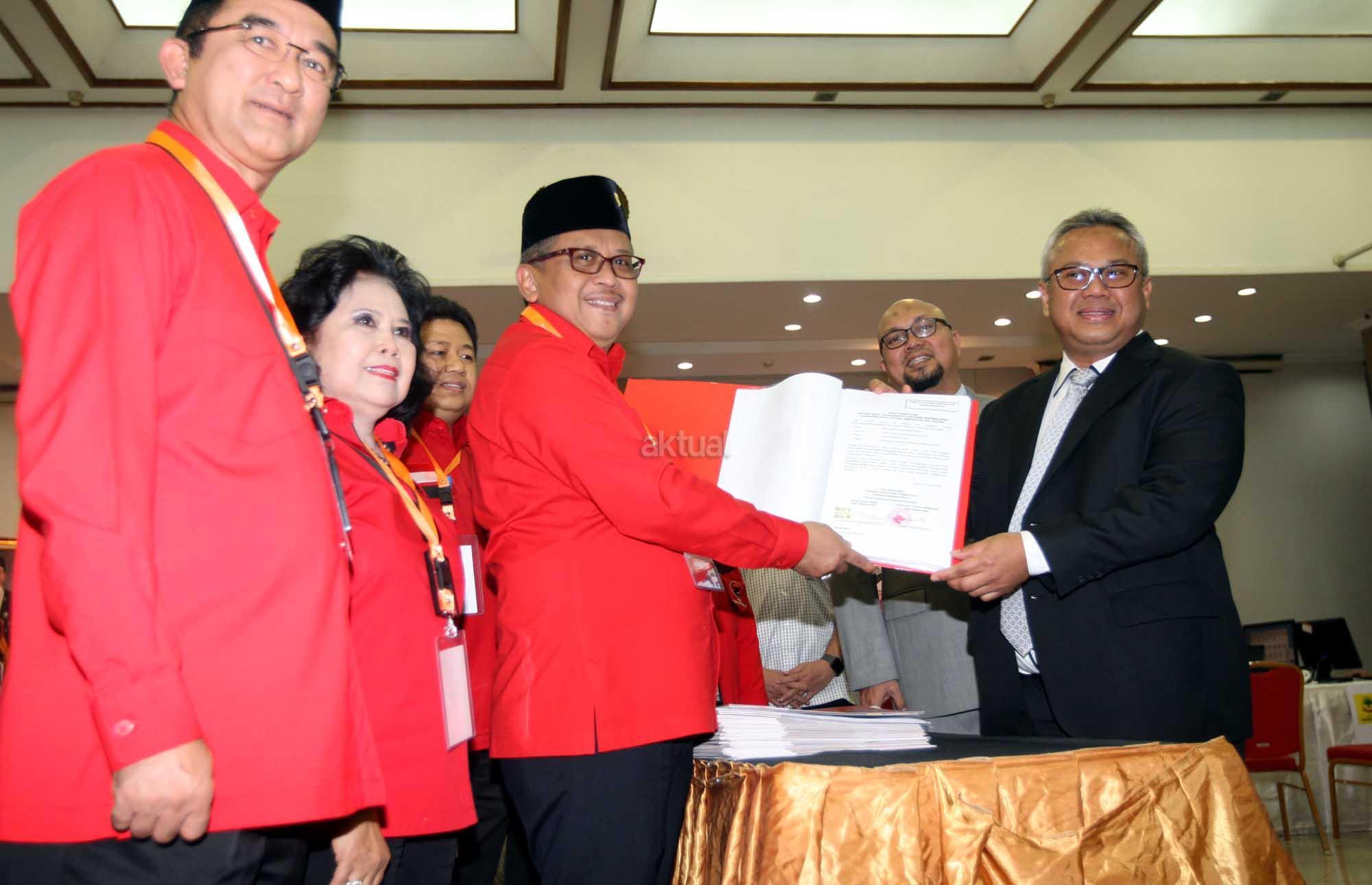 Sekjen PDIP Hasto Kristiyanto (ketiga kiri) menyerahkan daftar bakal calon anggota Legislatif dari partai PDIP kepada Ketua KPU Arief Budiman (kanan) di Kantor KPU, Jakarta, Selasa (17/8). PDIP secara resmi mengajukan nama-nama bacalegnya ke KPU untuk mengikuti Pemilu 2019. AKTUAL/Tino Oktaviano
