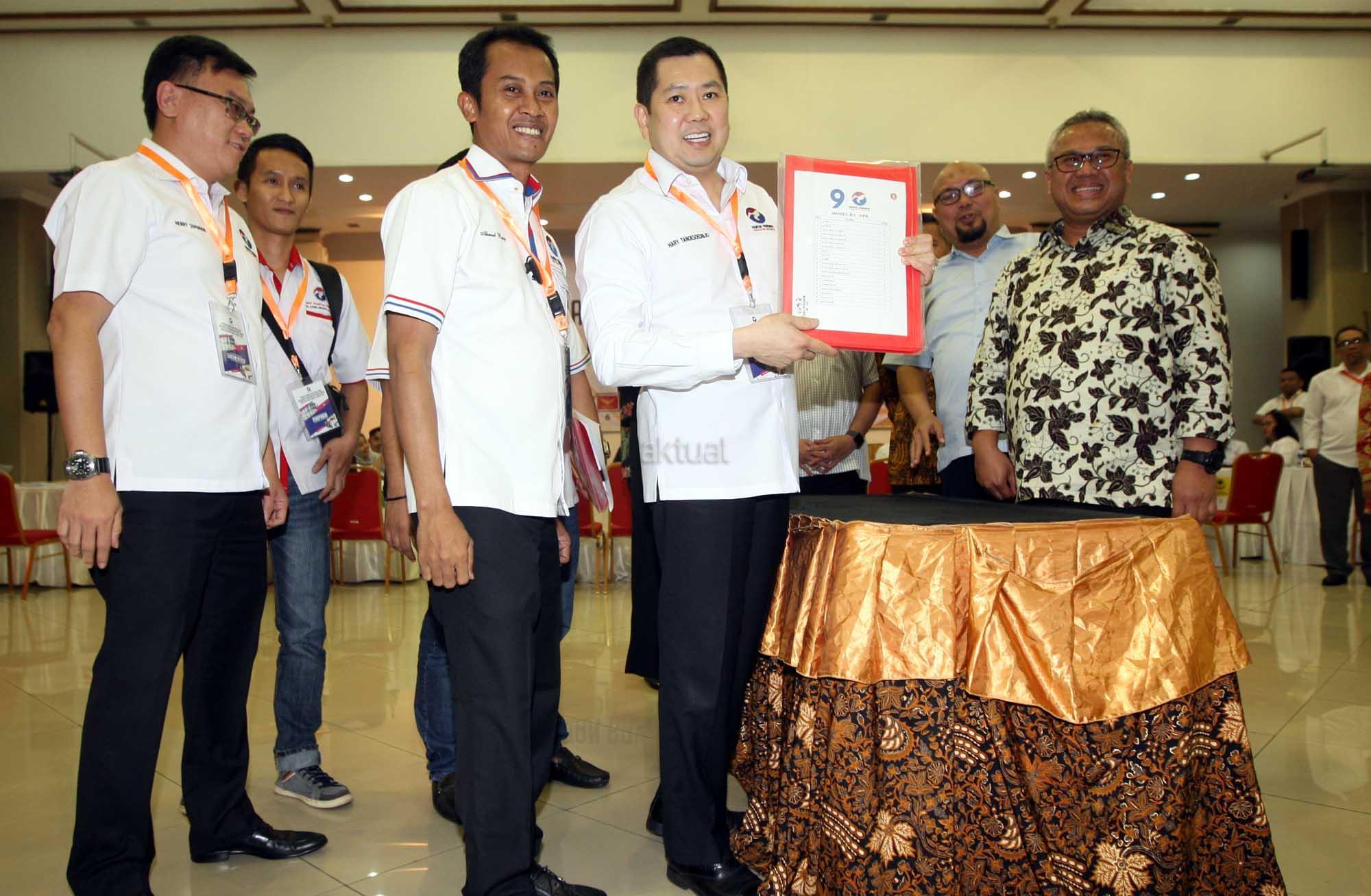Ketua Umum Perindo Hary Tanoesoedibjo (keempat kiri) berjabat tangan dengan Ketua KPU Arief Budiman (kanan) saat mengajukan daftar bakal calon anggota Legislatif dari partai Perindo, di Kantor KPU, Jakarta, Selasa (17/8). Perindo secara resmi mengajukan nama-nama bacalegnya ke KPU untuk mengikuti Pemilu 2019. AKTUAL/Tino Oktaviano