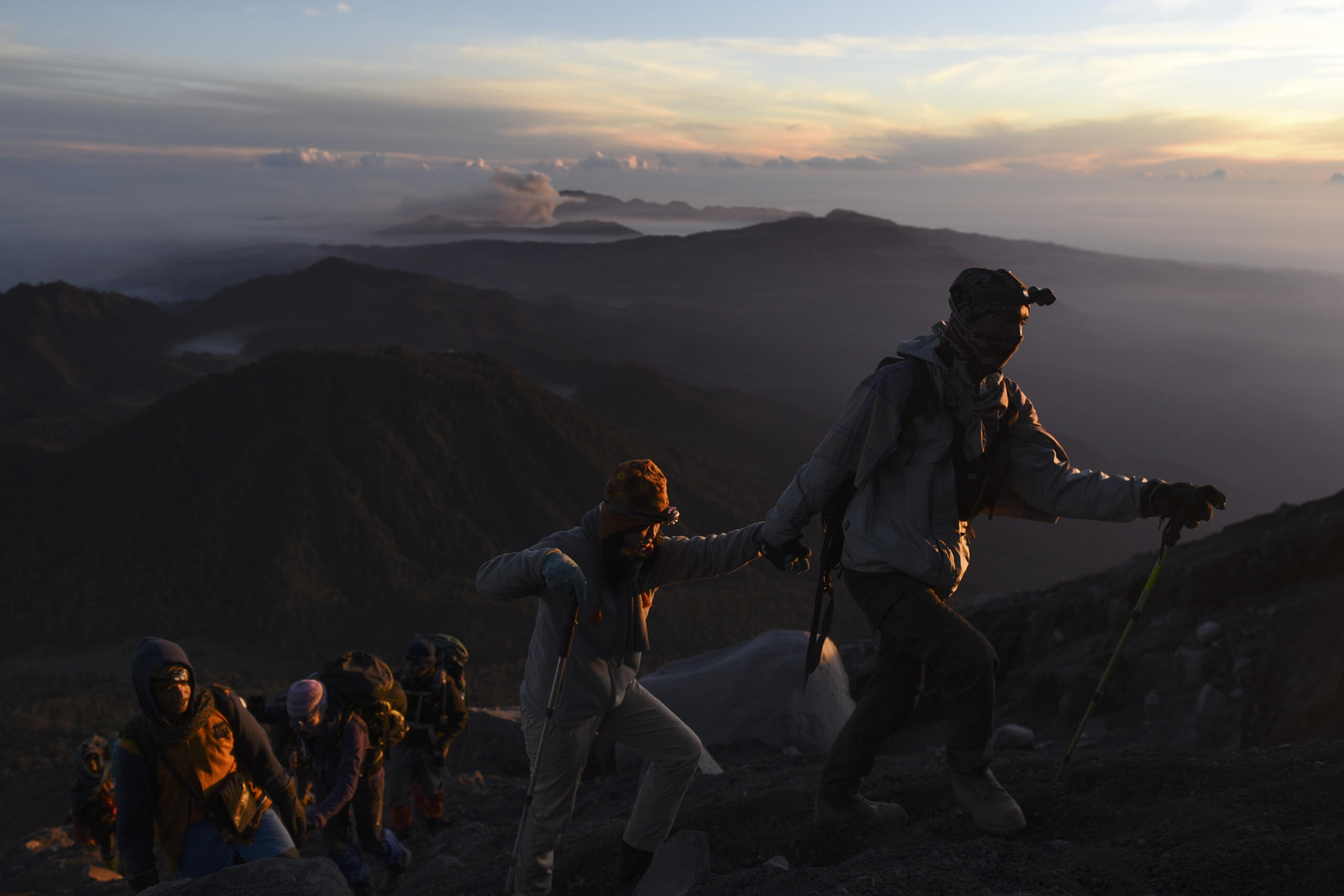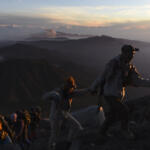 Sejumlah pendaki mendaki Gunung Semeru dengan latar Gunung Bromo di Gunung Semeru, Malang, Jawa Timur, Minggu (31/7). Gunung Semeru adalah gunung tertinggi di pulau Jawa dan menjadi salah satu destinasi favorit bagi para pendaki gunung baik dalam negeri maupun mancanegara. ANTARA FOTO/Zabur Karuru/aww/16.