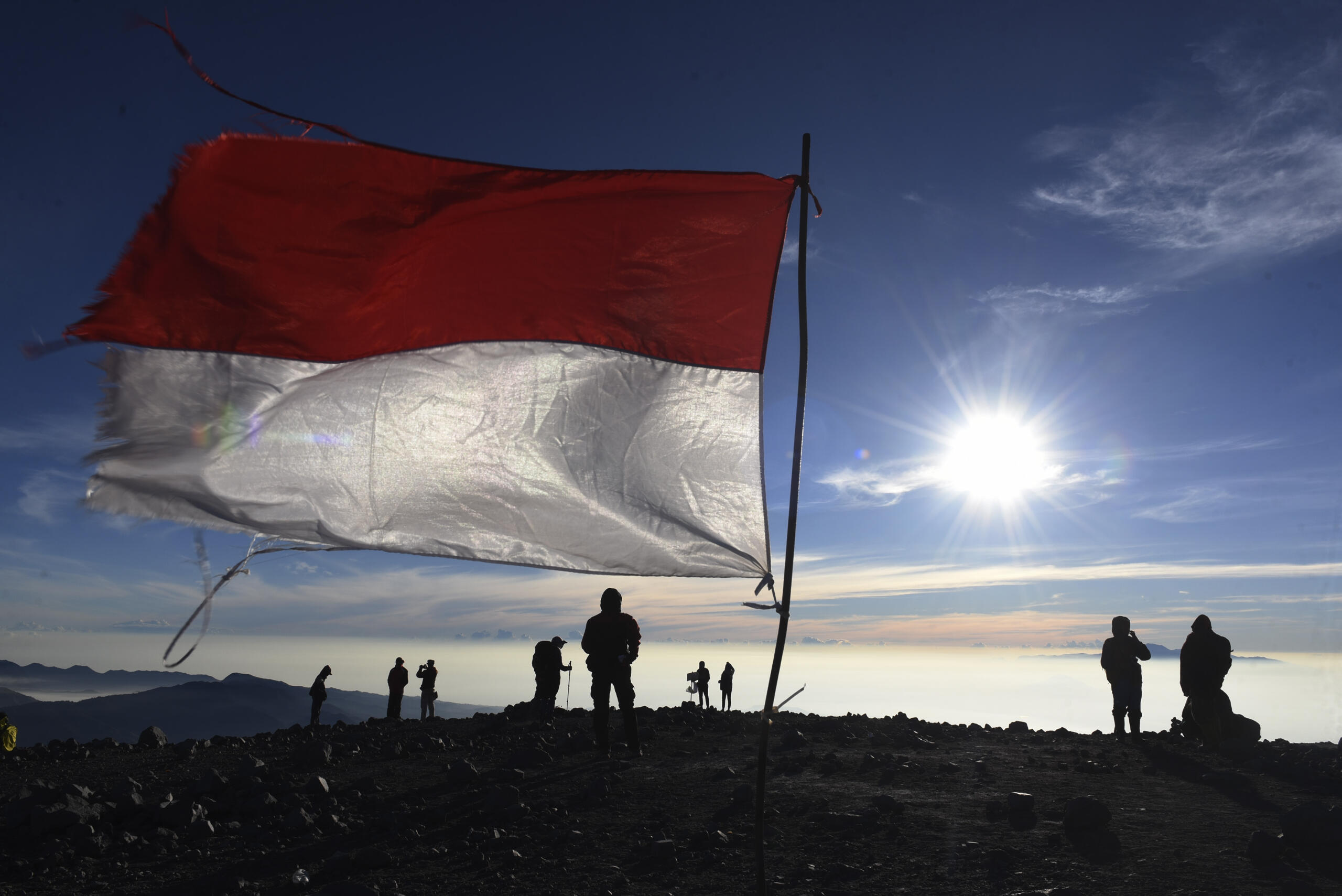 Sejumlah pendaki menikmati pemandangan dari puncak Gunung Semeru, Malang, Jawa Timur, Minggu (31/7). Gunung Semeru adalah gunung tertinggi di pulau Jawa dan menjadi salah satu destinasi favorit bagi para pendaki gunung baik dalam negeri maupun mancanegara. ANTARA FOTO/Zabur Karuru/aww/16.