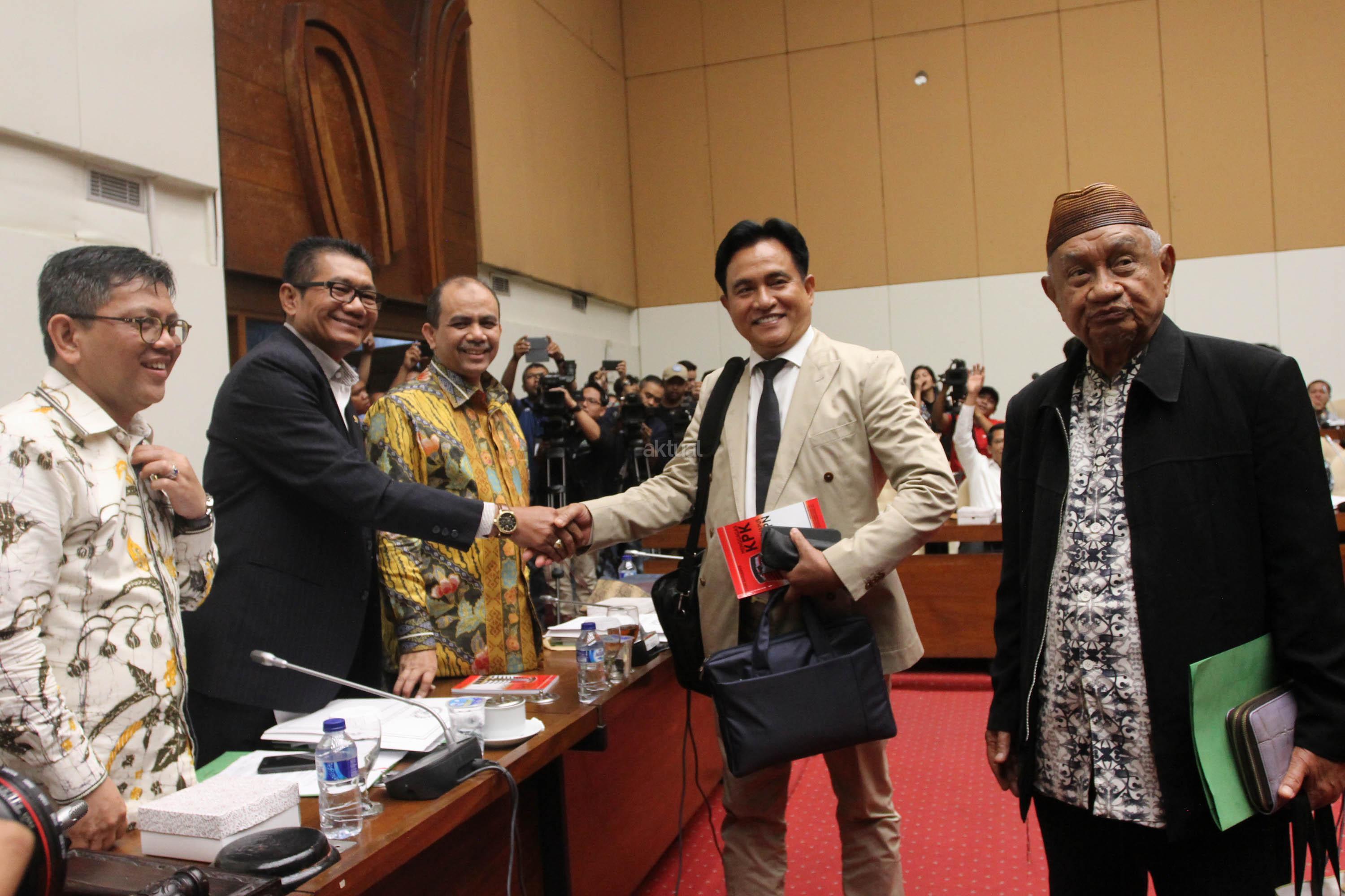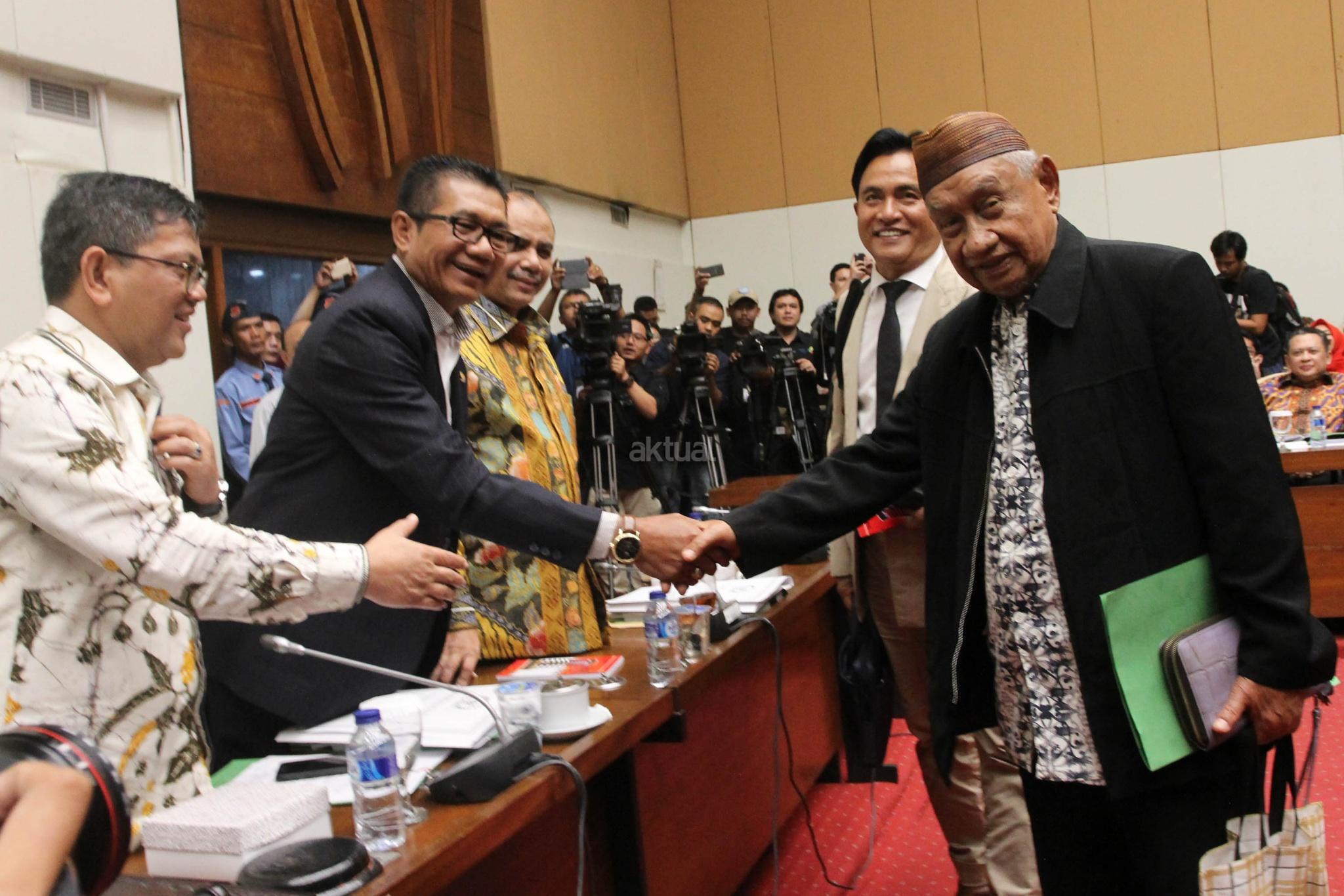 Ahli Hukum Tata Negara yang juga bekas Menteri Kehakiman dan Hak Azasi Manusia 2000 – 2004 Yusril Ihza Mahendra (kedua drai kanan) dan Pakar Hukum Tata Negara yang juga bekas Anggota DPR Fraksi PPP Zein Badjeber (kanan), bersalaman dengan Ketua Pansus Hak Angket DPR untuk KPK dari FRaksi Golkar Agun Gunandjar Sudarsa (kedua dari kiri), Wakil Ketua dari Fraksi Nasdem Taufiqulhadi (kiri) dan Fraksi Hanura Dossy Iskandar (teangh) sebelum mengikuti Rapat Dengar Pendapat Umum (RDPU) dengan Pansus Hak Angket DPR untuk KPK, di Gedung Nusantara, Kompleks Parlemen, Jakarta, Senin (10/7). Yusril dan Zein dimintai pendapatnya secara akademis dan kapasitas keahliannya sebagai Pakar Hukum sekaligusnya peran mereka sebagai pelaku sejarah saat penyusunan Undang-Undang Nomor 30 Tahun 2002 tentang Komisi Pemberantasan Tindak Pidana Korupsi dan dibentuknya KPK. AKTUAL/Tino Oktaviano