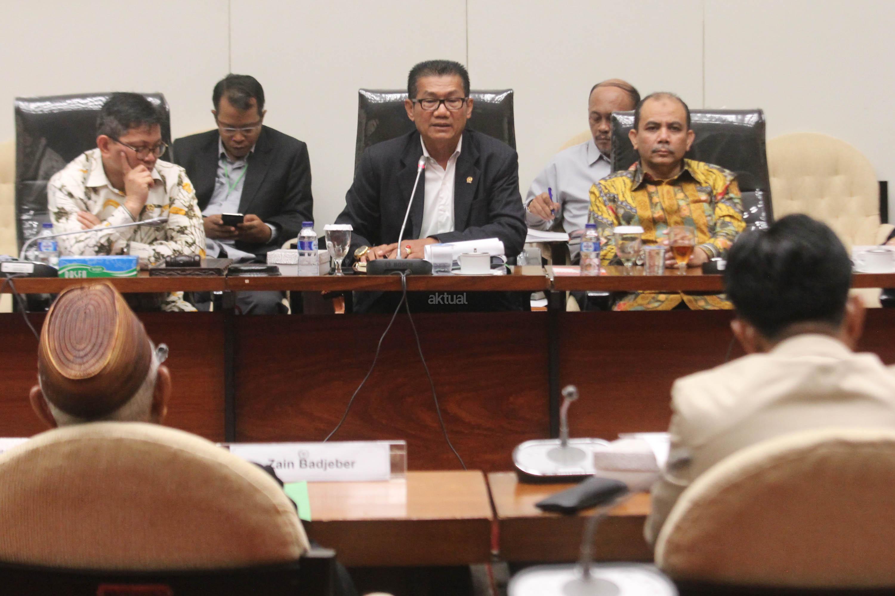 Ahli Hukum Tata Negara yang juga bekas Menteri Kehakiman dan Hak Azasi Manusia 2000 – 2004 Yusril Ihza Mahendra (kanan membelakangi) dan Pakar Hukum Tata Negara yang juga bekas Anggota DPR Fraksi PPP Zein Badjeber (kiri membelakangi), menyampaikan pandangannya didepan Pimpinan Pansus Hak Angket DPR untuk KPK Ketua dari Fraksi Golkar Agun Gunandjar Sudarsa (tengah), Wakil Ketua dari Fraksi Nasdem Taufuqulhadi (kiri) dan Wakil Ketua dari Farksi Hanura Dossy Iskandar (kanan) pada Rapat Dengar Pendapat Umum (RDPU) di Gedung Nusantara, Kompleks Parlemen, Jakarta, Senin (10/7). Yusril dan Zein dimintai pendapatnya secara akademis dan kapasitas keahliannya sebagai Pakar Hukum sekaligusnya peran mereka sebagai pelaku sejarah saat penyusunan Undang-Undang Nomor 30 Tahun 2002 tentang Komisi Pemberantasan Tindak Pidana Korupsi dan dibentuknya KPK. AKTUAL/Tino Oktaviano