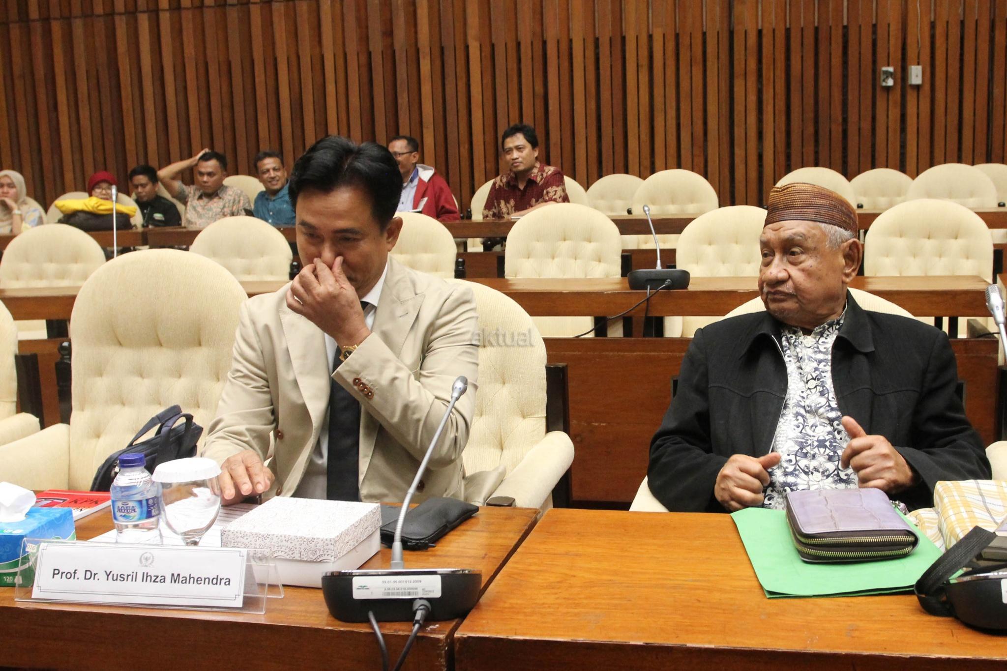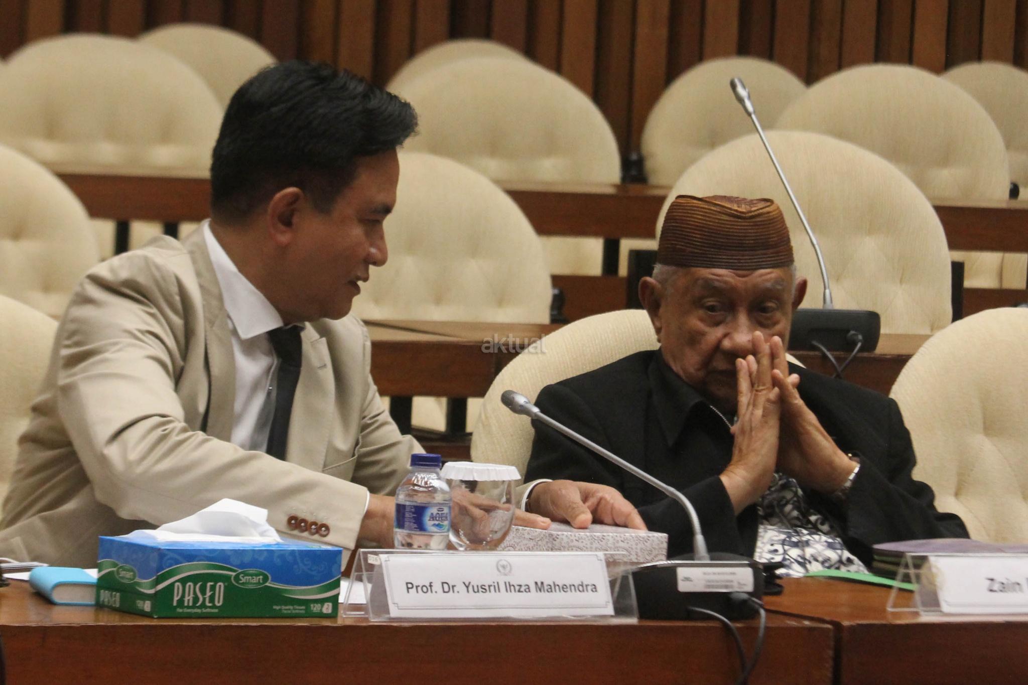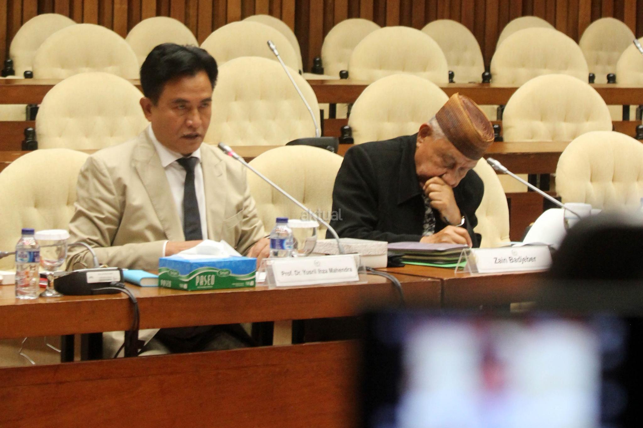 Ahli Hukum Tata Negara yang juga bekas Menteri Kehakiman dan Hak Azasi Manusia 2000 – 2004 Yusril Ihza Mahendra (kiri) dan Pakar Hukum Tata Negara yang juga bekas Anggota DPR Fraksi PPP Zein Badjeber, menyampaikan pandangannya pada Rapat Dengar Pendapat Umum (RDPU) dengan Pansus Hak Angket DPR untuk KPK, di Gedung Nusantara, Kompleks Parlemen, Jakarta, Senin (10/7). Yusril dan Zein dimintai pendapatnya secara akademis dan kapasitas keahliannya sebagai Pakar Hukum sekaligusnya peran mereka sebagai pelaku sejarah saat penyusunan Undang-Undang Nomor 30 Tahun 2002 tentang Komisi Pemberantasan Tindak Pidana Korupsi dan dibentuknya KPK. AKTUAL/Tino Oktaviano