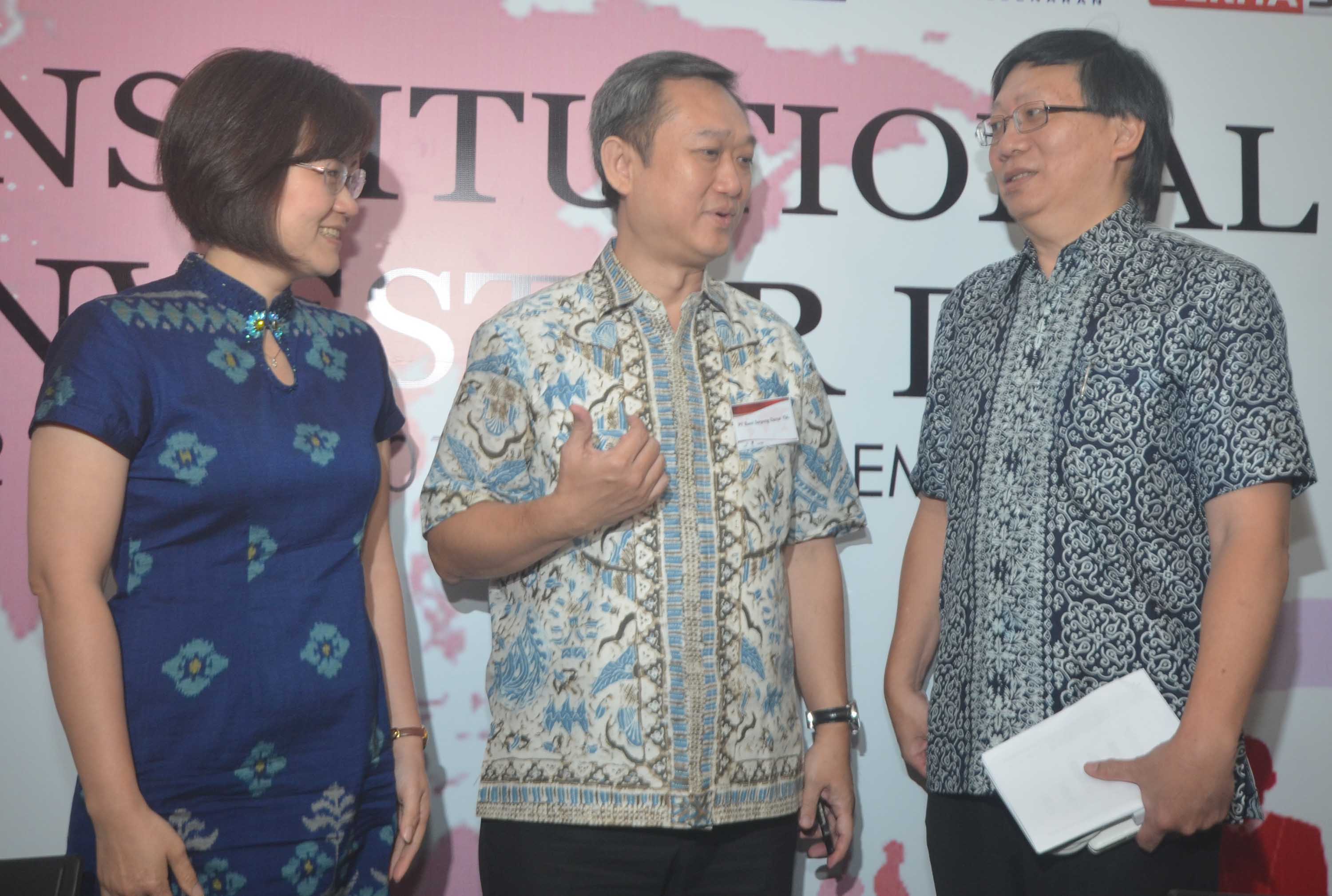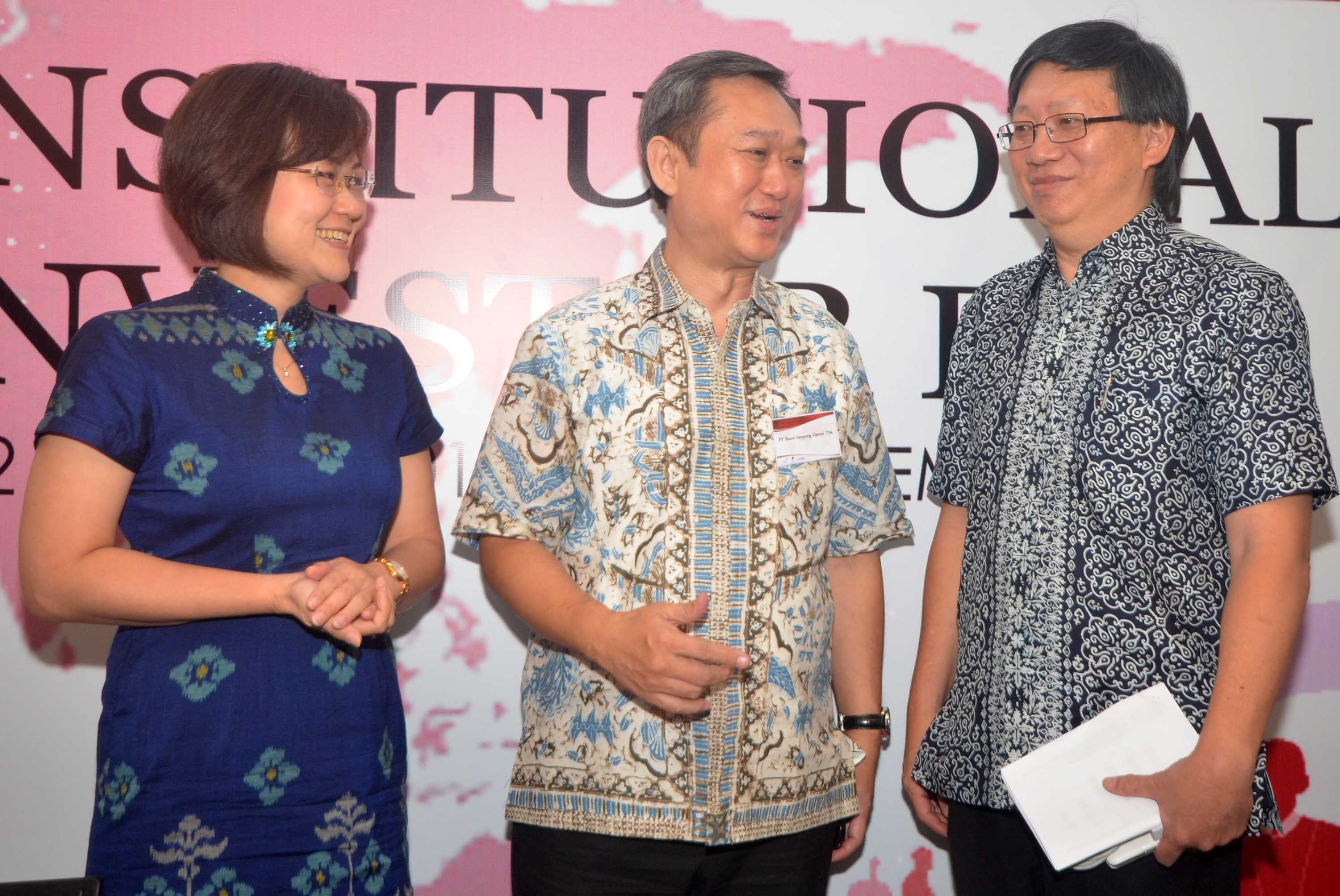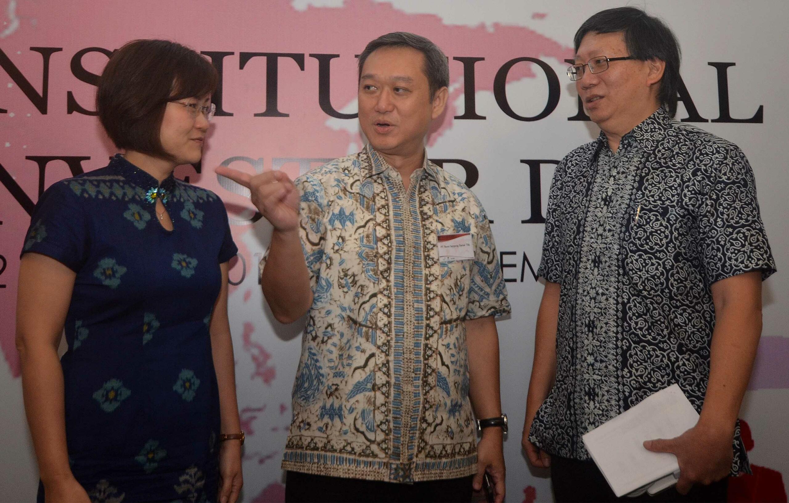 Direktur BSDE, Hermawan Wijaya (tengah) berbincang dengan Presiden Direktur PT Bumi Serpong Damai Tbk (BSDE), Franciscus Xaverius RD (kanan) dan Corporate Secretary BSDE, Christy Grassela (kiri) seusai paparan publik emiten properti berkapitalisasi pasar terbesar di Indonesia tersebut di Main Hall, Gedung Bursa Efek Indonesia, Jakarta, senin (1/8). Pendapatan usaha BSDE selama triwulan kedua tercatat Rp 1,77 triliun, atau lebih baik dibandingkan dengan triwulan sebelumnya senilai Rp 1,1 triliun. Moncernya pendapatan tersebut ditopang oleh hasil pra penjualan (marketing sales) yang tercatat sebesar Rp 2,5 triliun sepanjang Januari samapi Juni 2016. Pada kuarta kedua sendiri, BSDE mencatat marketing sales Rp 1,33 triliun, lebih baik dibandingkan kuarta sebelumnya Rp 1,2 triliun.