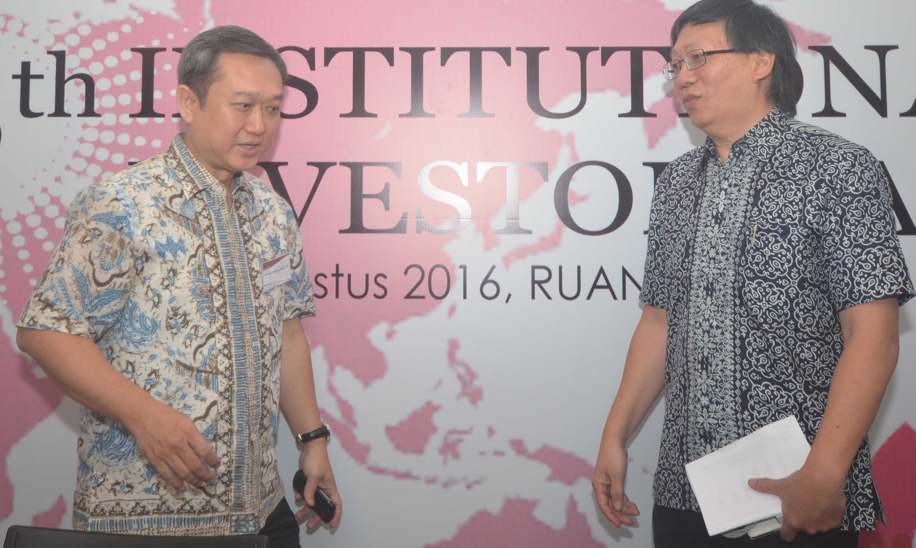 Presiden Direktur PT Bumi Serpong Damai Tbk (BSDE), Franciscus Xaverius RD (kanan) berbincang dengan Direktur BSDE, Hermawan Wijaya (kiri) seusai paparan publik emiten properti berkapitalisasi pasar terbesar di Indonesia tersebut di Main Hall, Gedung Bursa Efek Indonesia, Jakarta, senin (1/8). Pendapatan usaha BSDE selama triwulan kedua tercatat Rp 1,77 triliun, atau lebih baik dibandingkan dengan triwulan sebelumnya senilai Rp 1,1 triliun. Moncernya pendapatan tersebut ditopang oleh hasil pra penjualan (marketing sales) yang tercatat sebesar Rp 2,5 triliun sepanjang Januari samapi Juni 2016. Pada kuarta kedua sendiri, BSDE mencatat marketing sales Rp 1,33 triliun, lebih baik dibandingkan kuarta sebelumnya Rp 1,2 triliun.