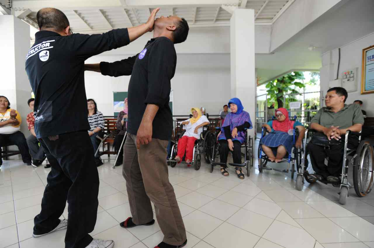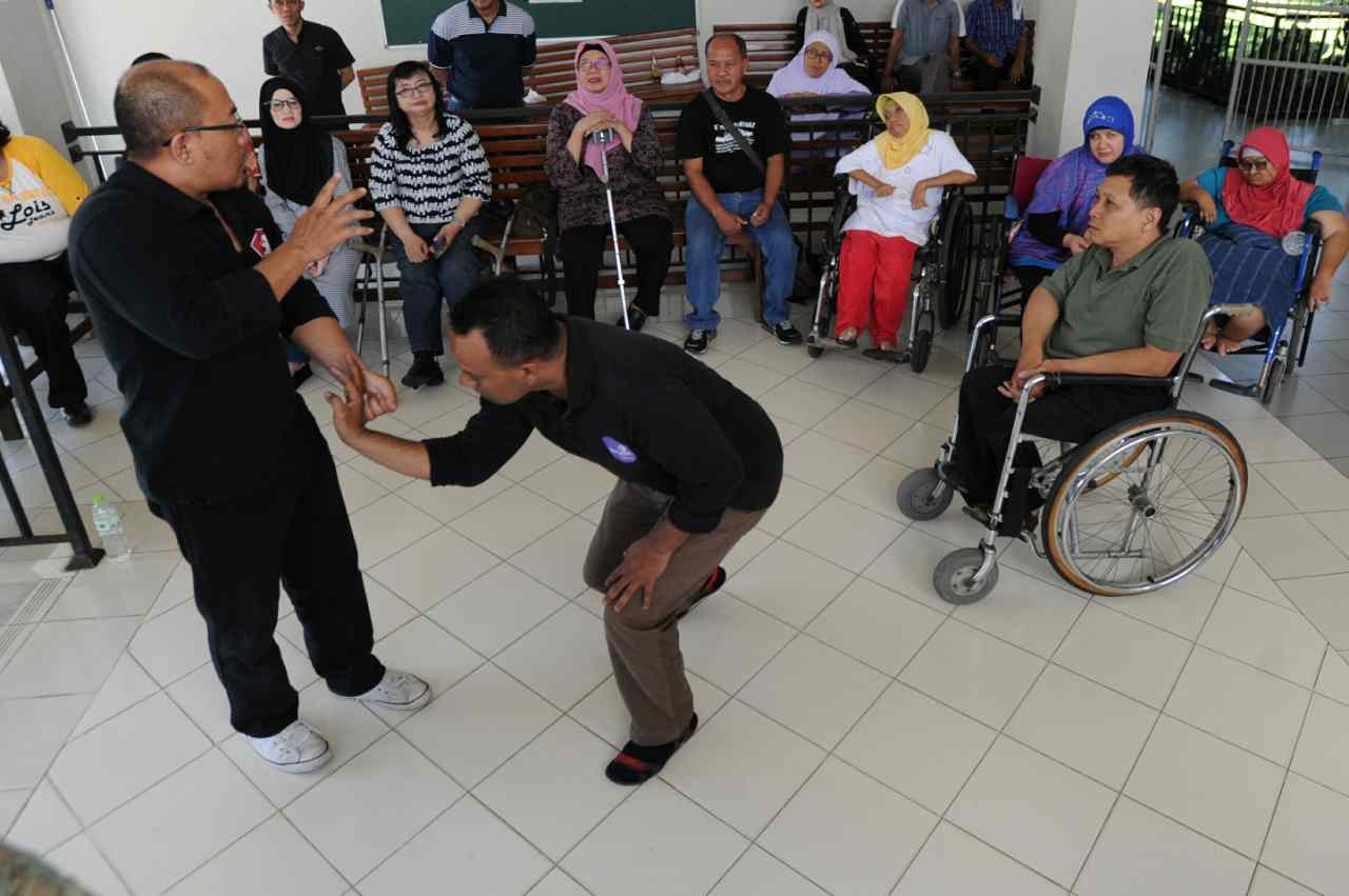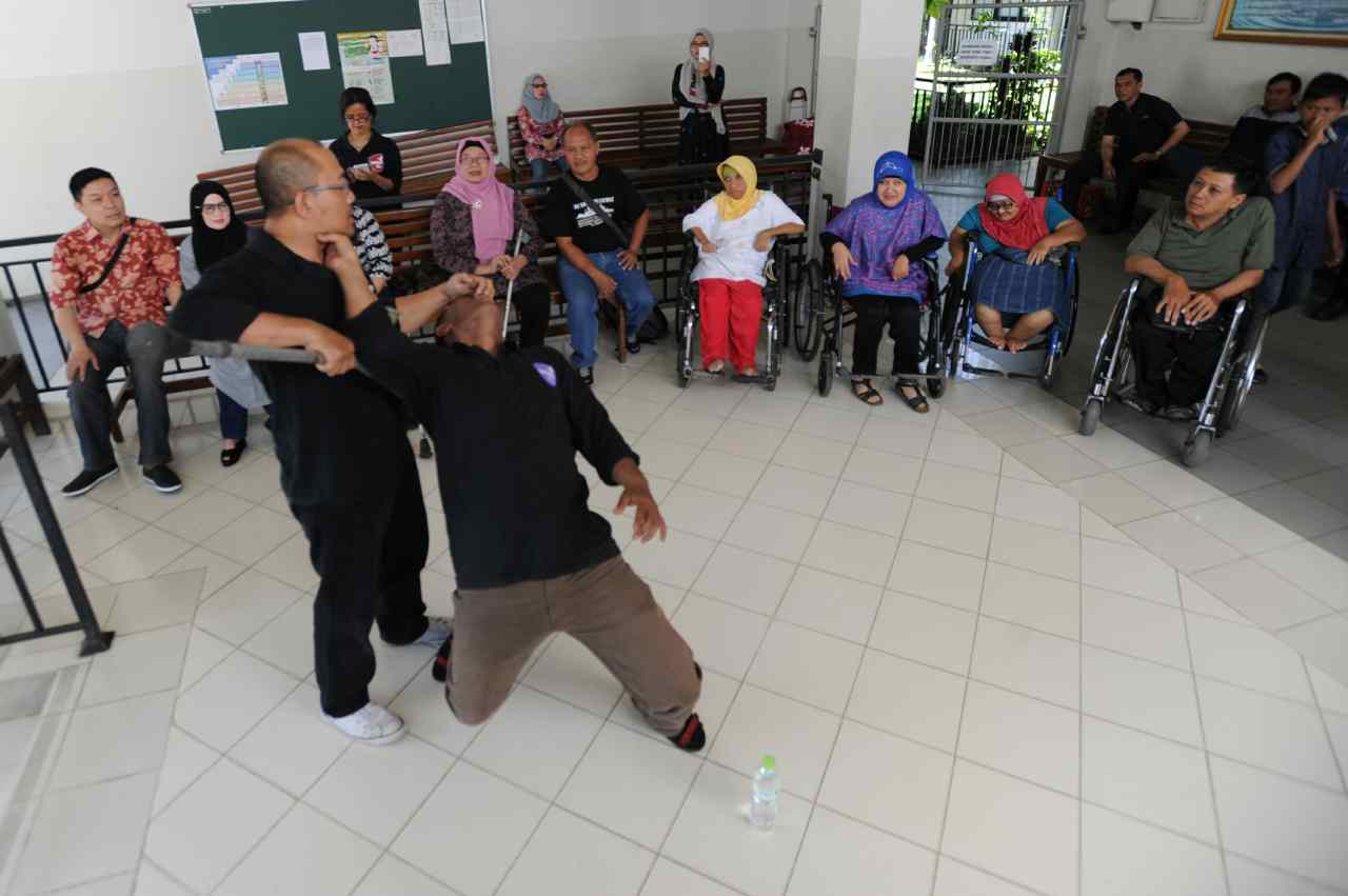 Sejumlah penyandang disabilitas menyaksikan peragaan beladiri di Yayasan Pembinaan Anak Cacat (YPAC), Jalan Hang Lekiu, Kebayoran Baru, Jakarta Selatan, Sabtu (6/8). Kegiatan ini dilakukan dalam rangka memberikan teknik pertahanan diri dengan menggunkan tangan kosong dari pelaku kejahatan jalanan. AKTUAL/TINO OKTAVIANO