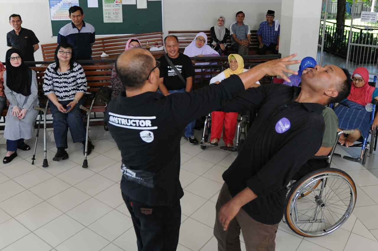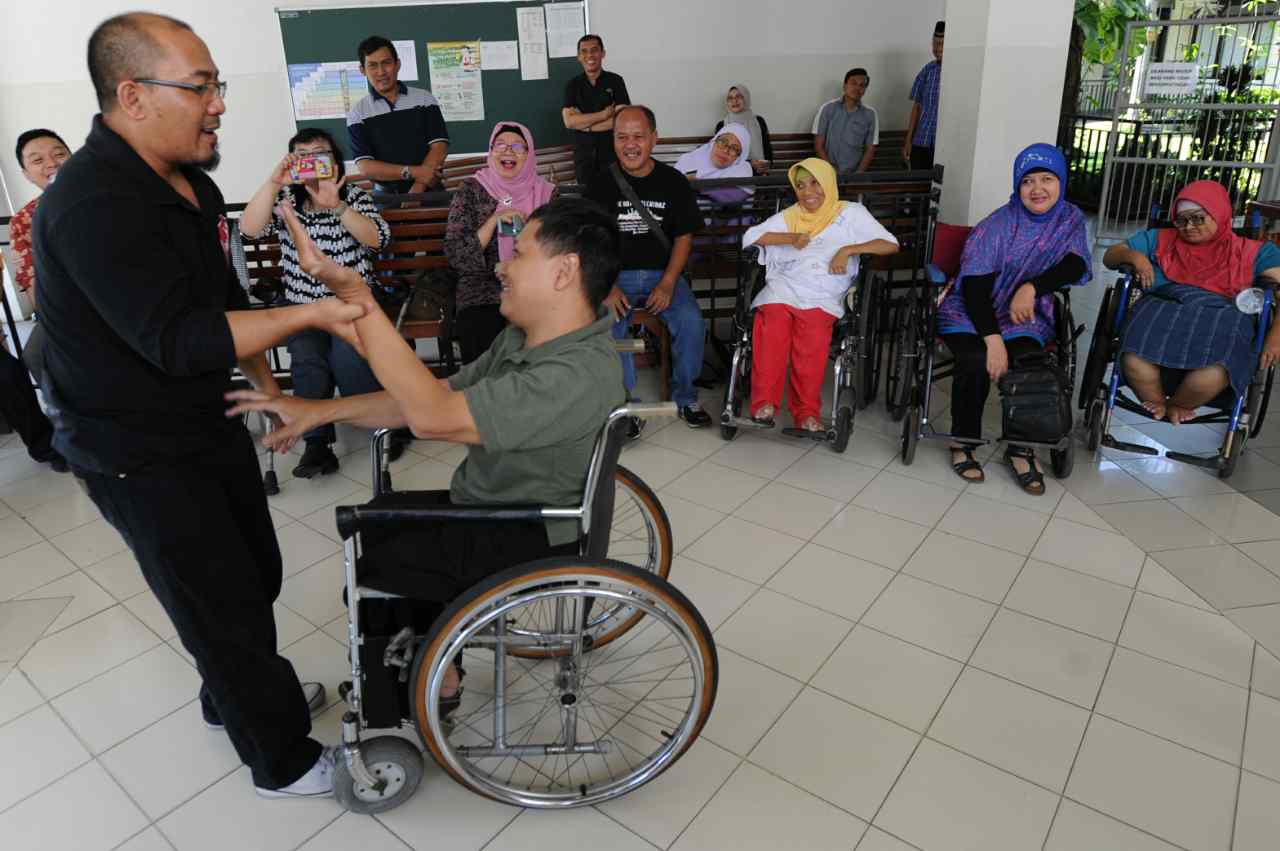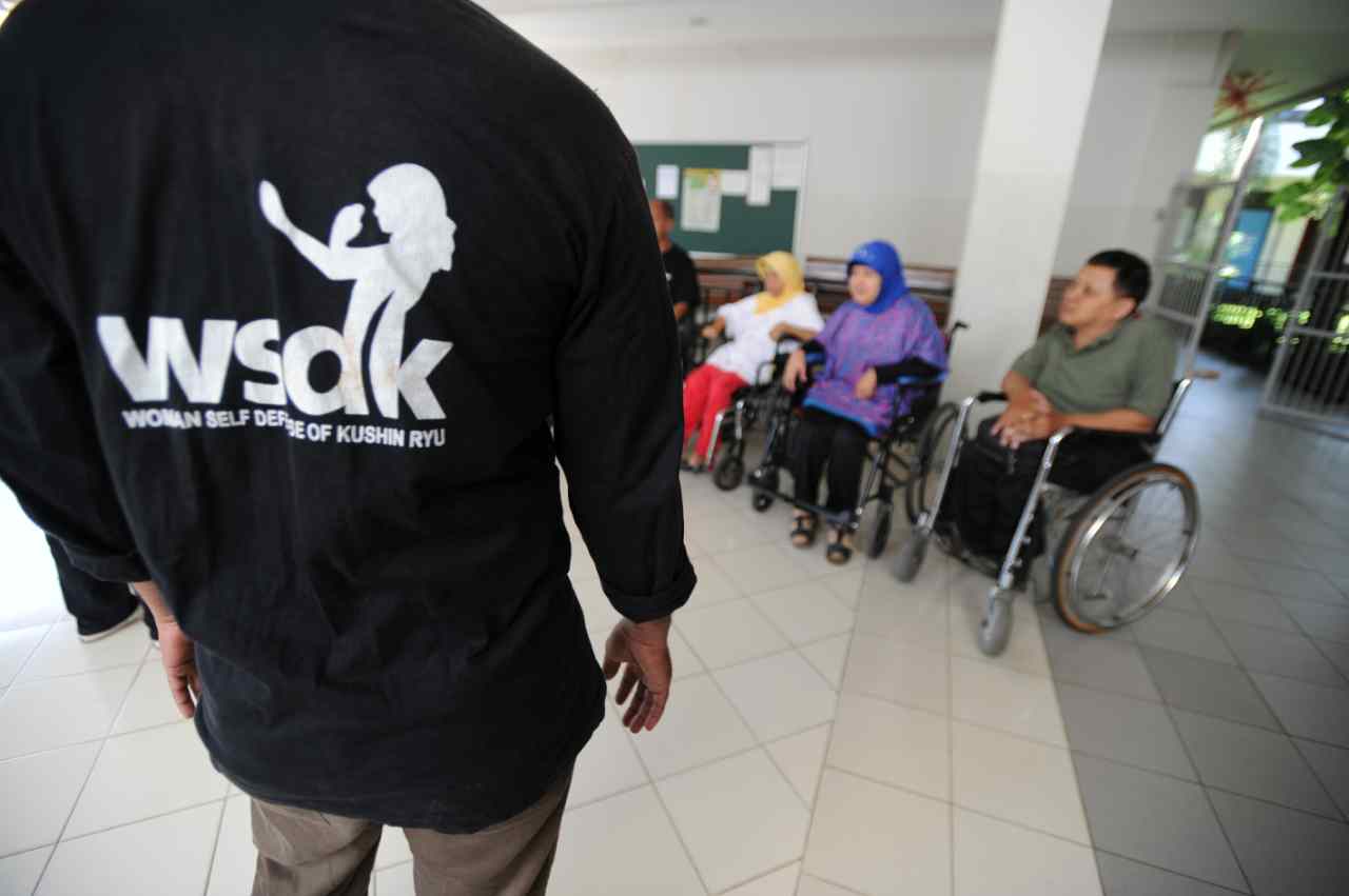 Sejumlah penyandang disabilitas menyaksikan peragaan beladiri di Yayasan Pembinaan Anak Cacat (YPAC), Jalan Hang Lekiu, Kebayoran Baru, Jakarta Selatan, Sabtu (6/8). Kegiatan ini dilakukan dalam rangka memberikan teknik pertahanan diri dengan menggunkan tangan kosong dari pelaku kejahatan jalanan. AKTUAL/TINO OKTAVIANO
