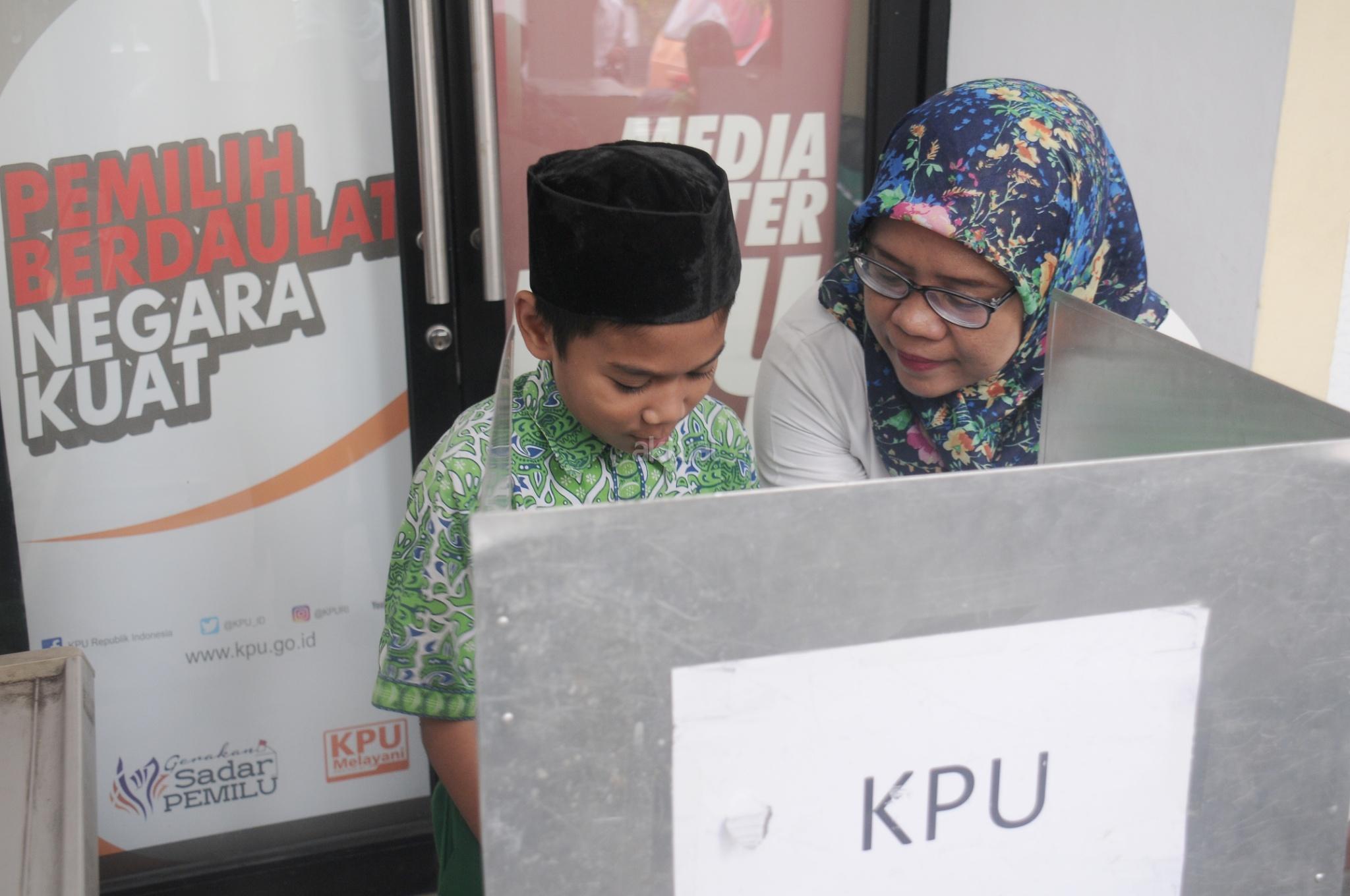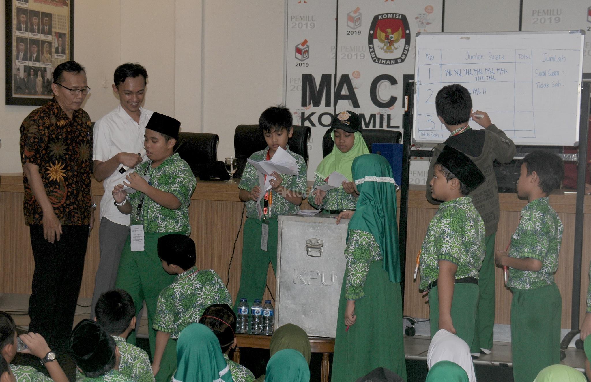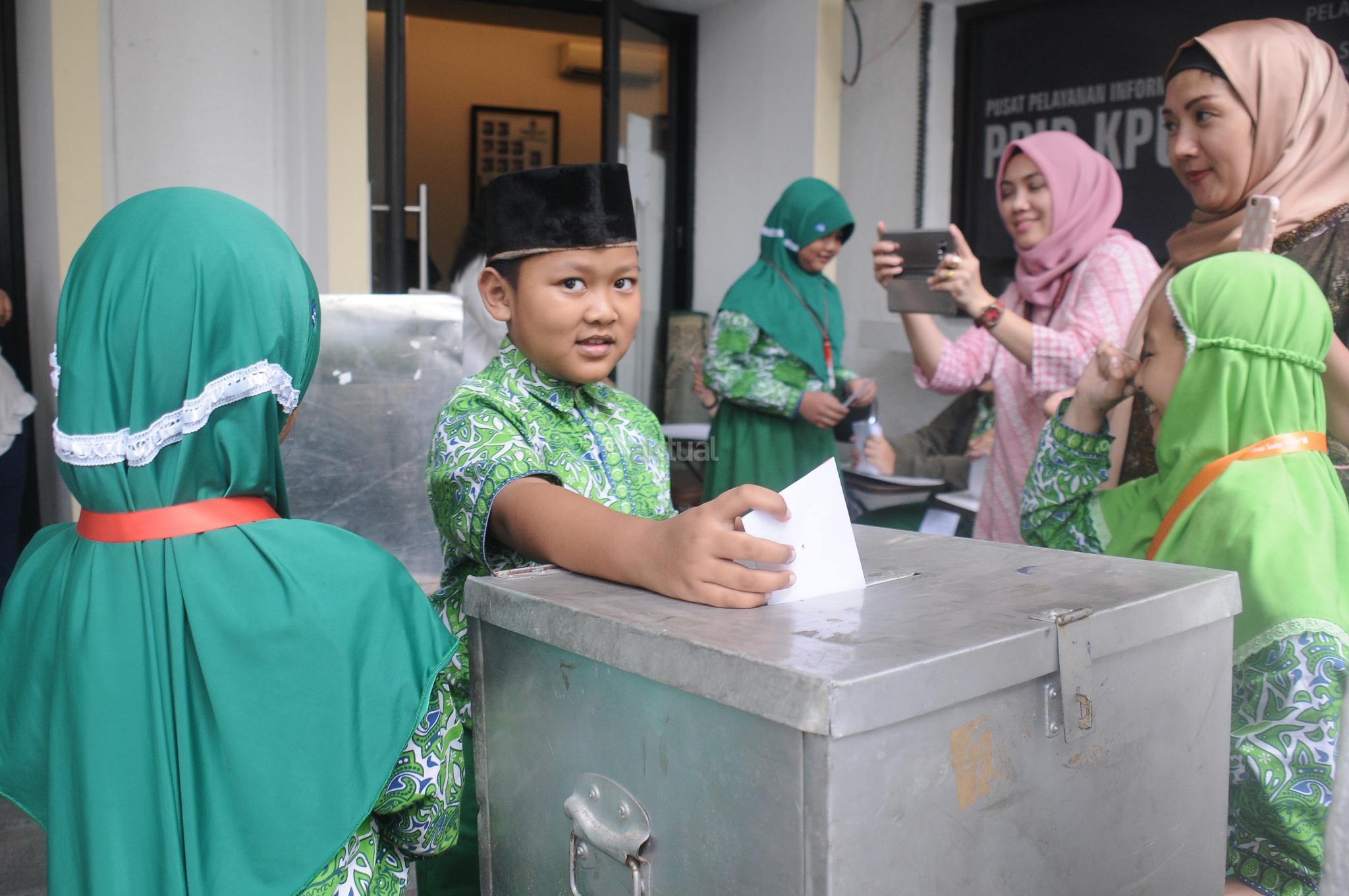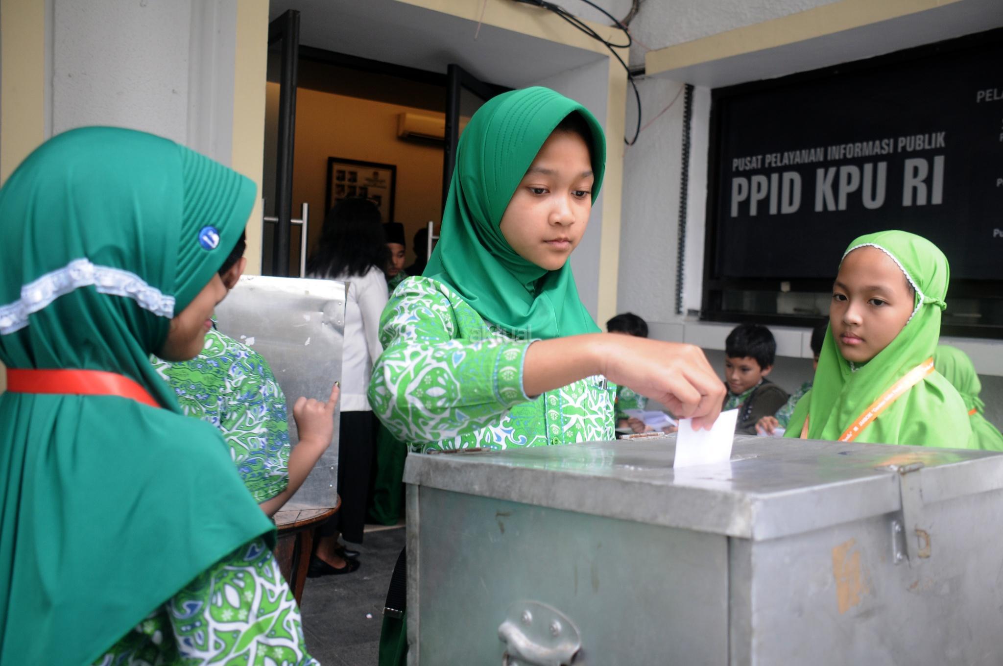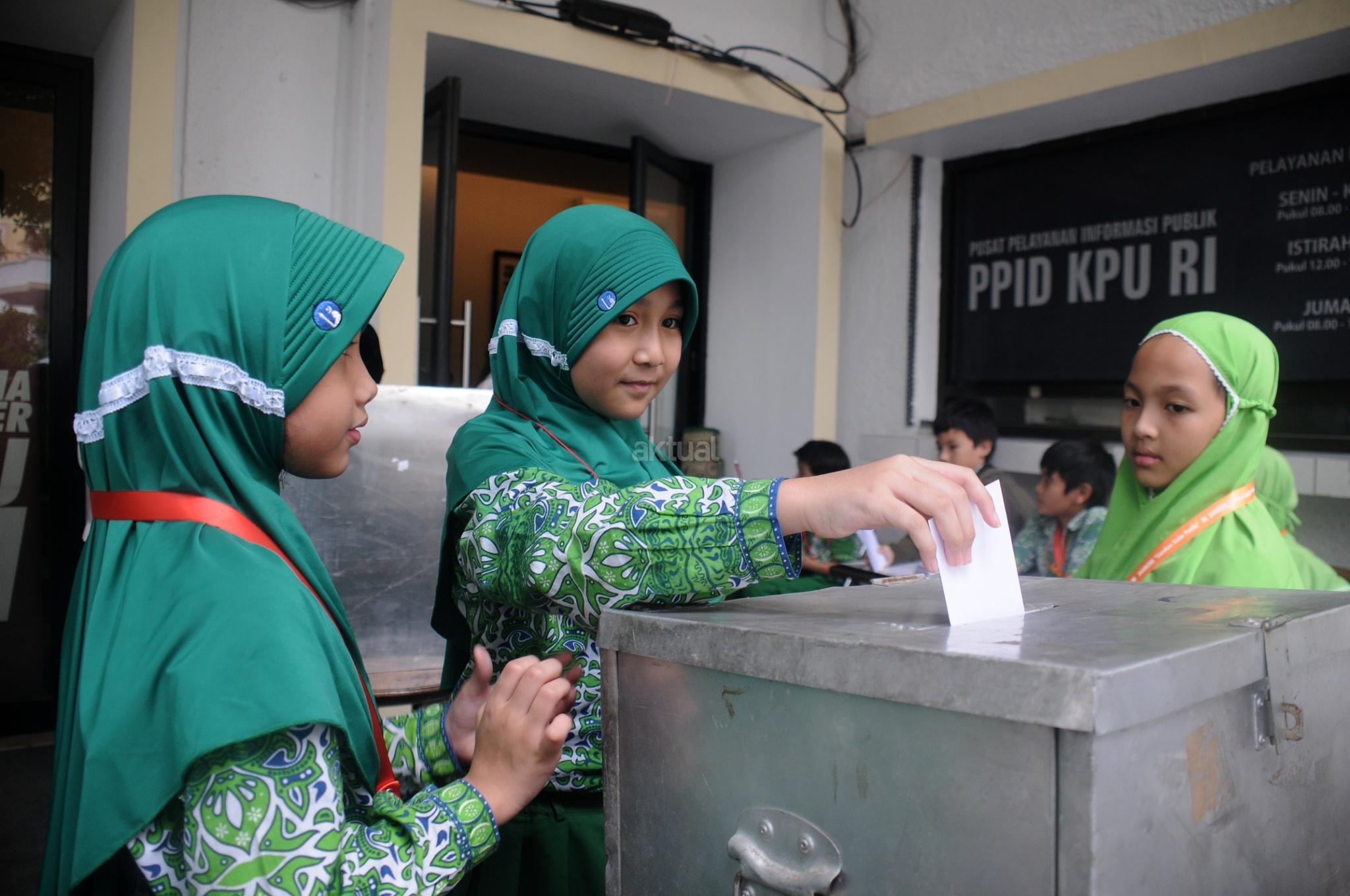 Siswa-siswi sekolah Al Azhar 2 Pasar Minggu Jakarta melakukan simulasi pemilihan umum di Kantor Komisi Pemilihan Umum (KPU), Jakarta, Kamis, (22/3/18). Kegiatan ini untuk mengenalkan sejak dini serta memberikan informasi kepada anak-anak tentang penyelenggaraan dan pentingnya pemilu. AKTUAL/Tino Oktaviano